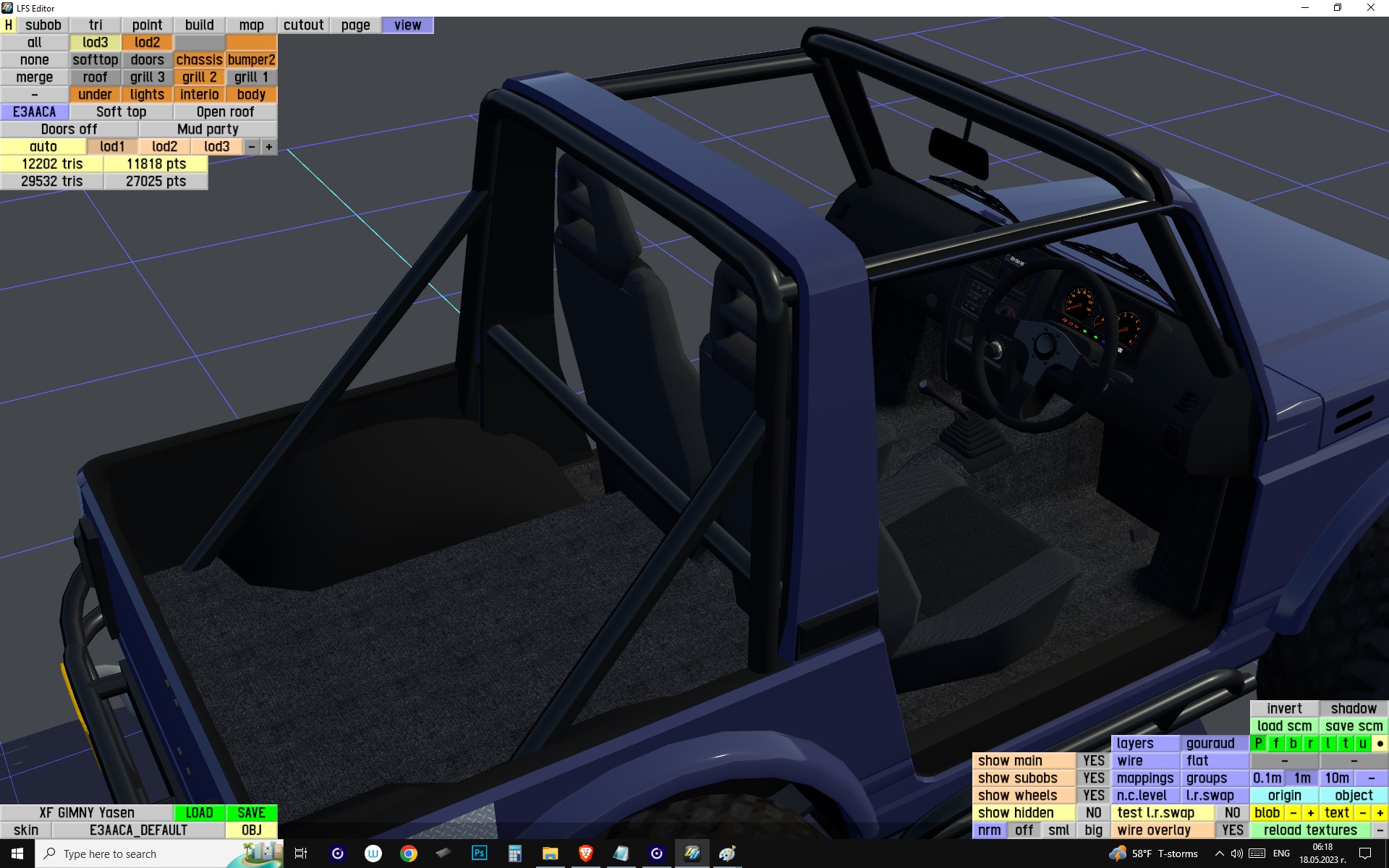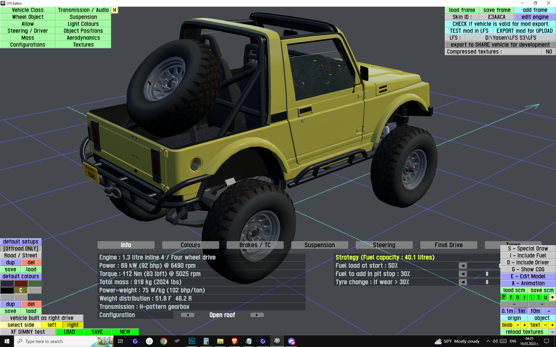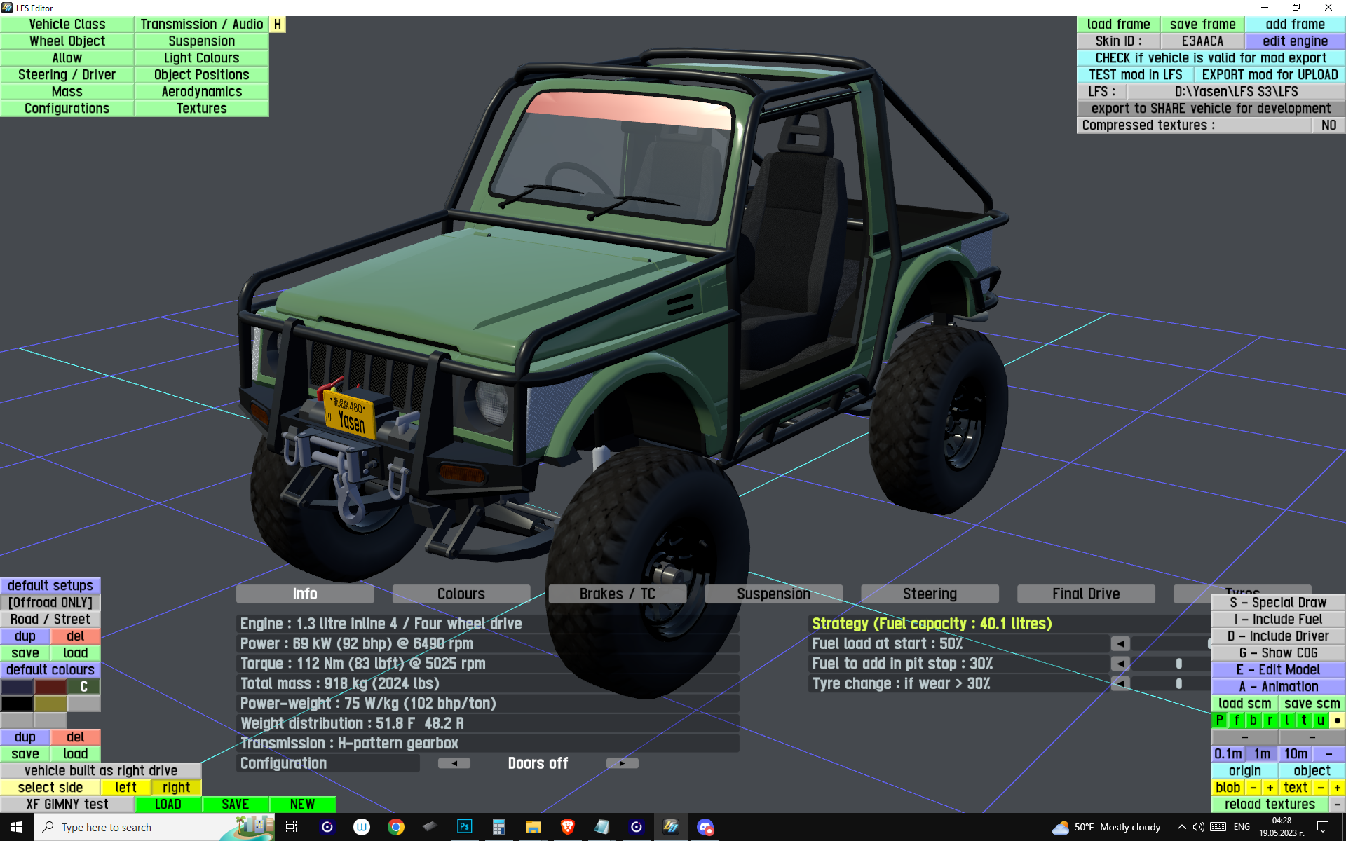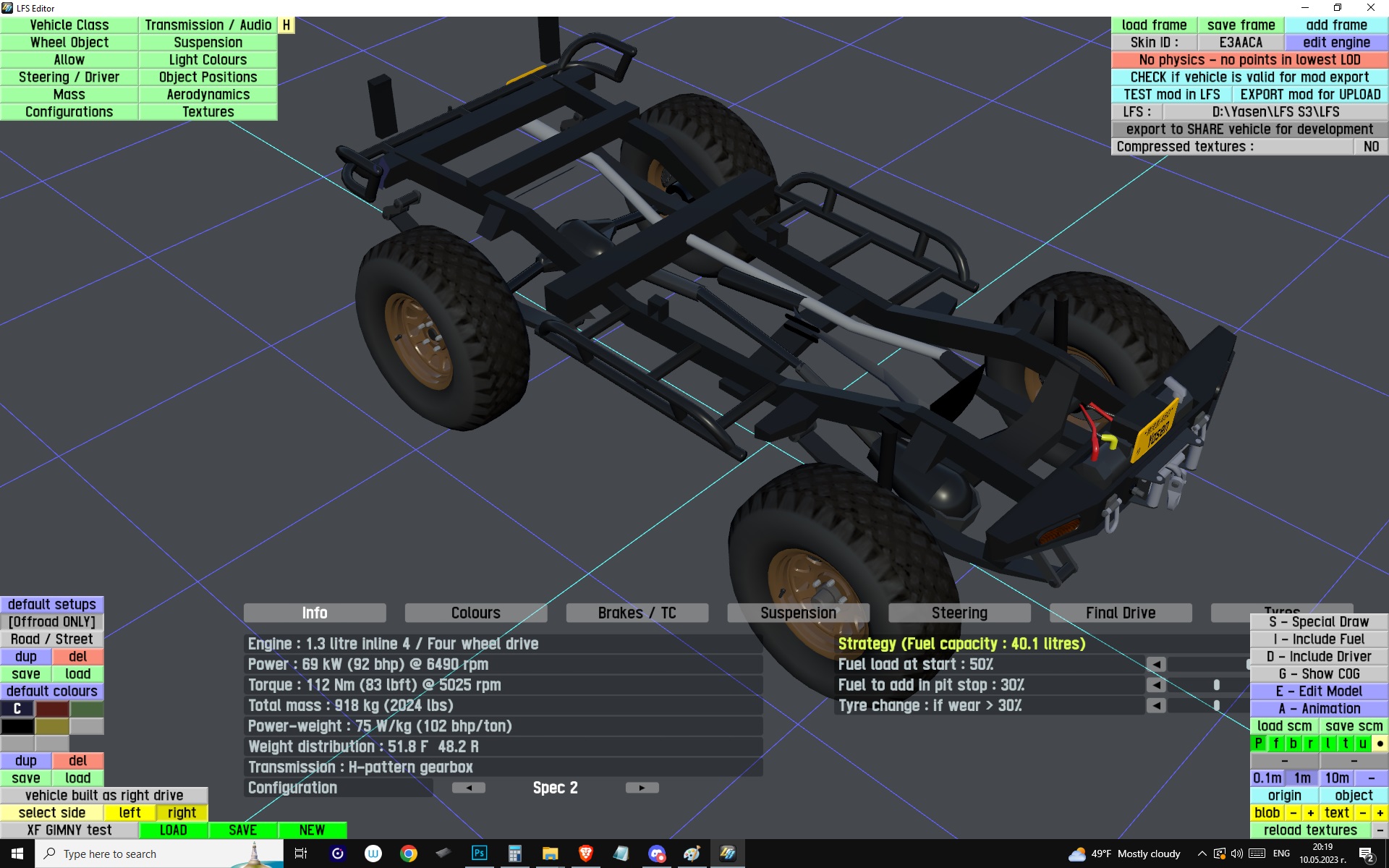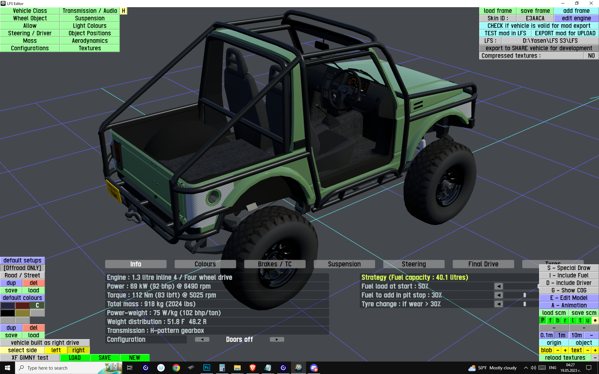 - New bumpers, sliders, winch, hooks, snorkel, roof rack, B pillar, soft top, inner and outside body roll cage, led bar, chassis mesh, exhaust, suspension mesh plus leaves attached as mudguards, spare tire mesh, skinnable spare tire vinyl cover, skinnable windshield banner