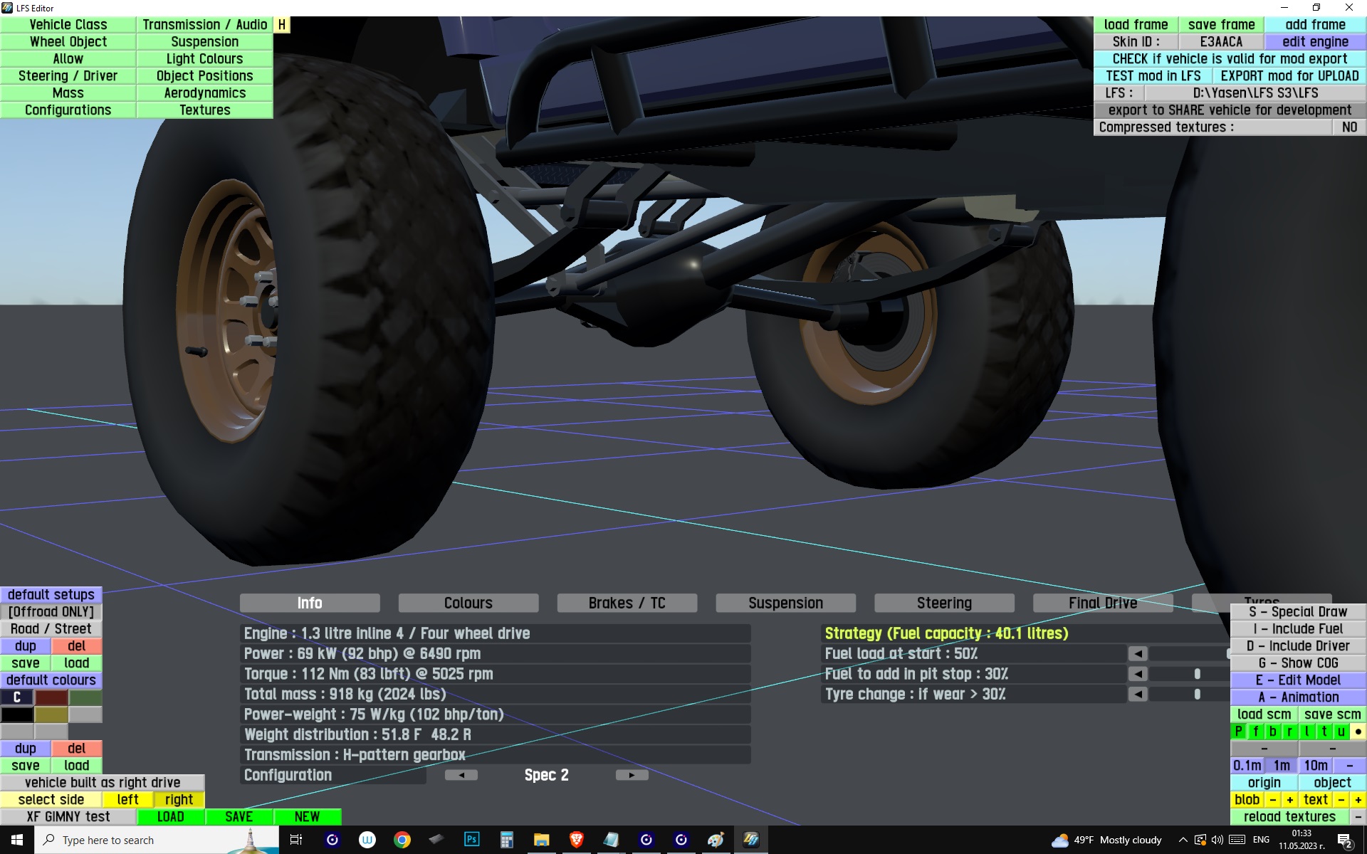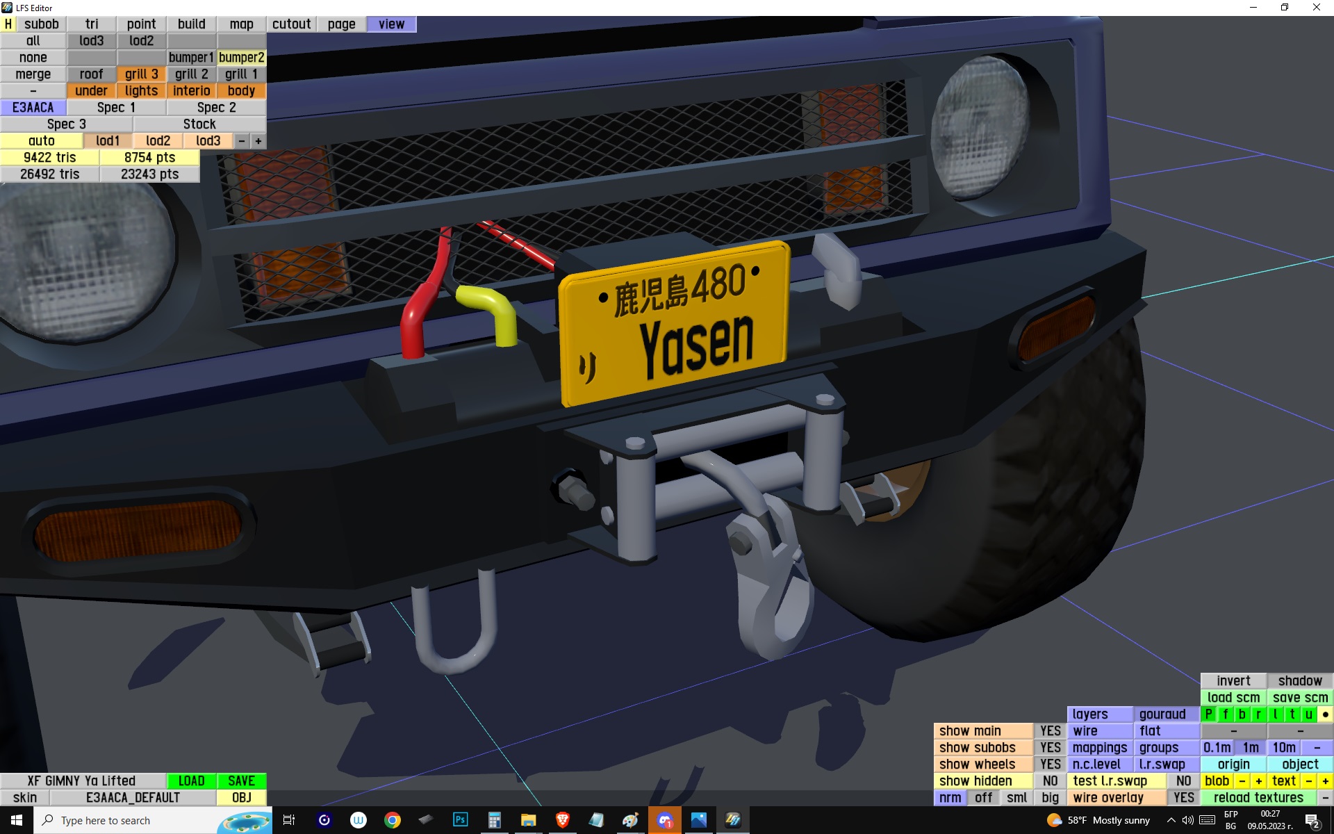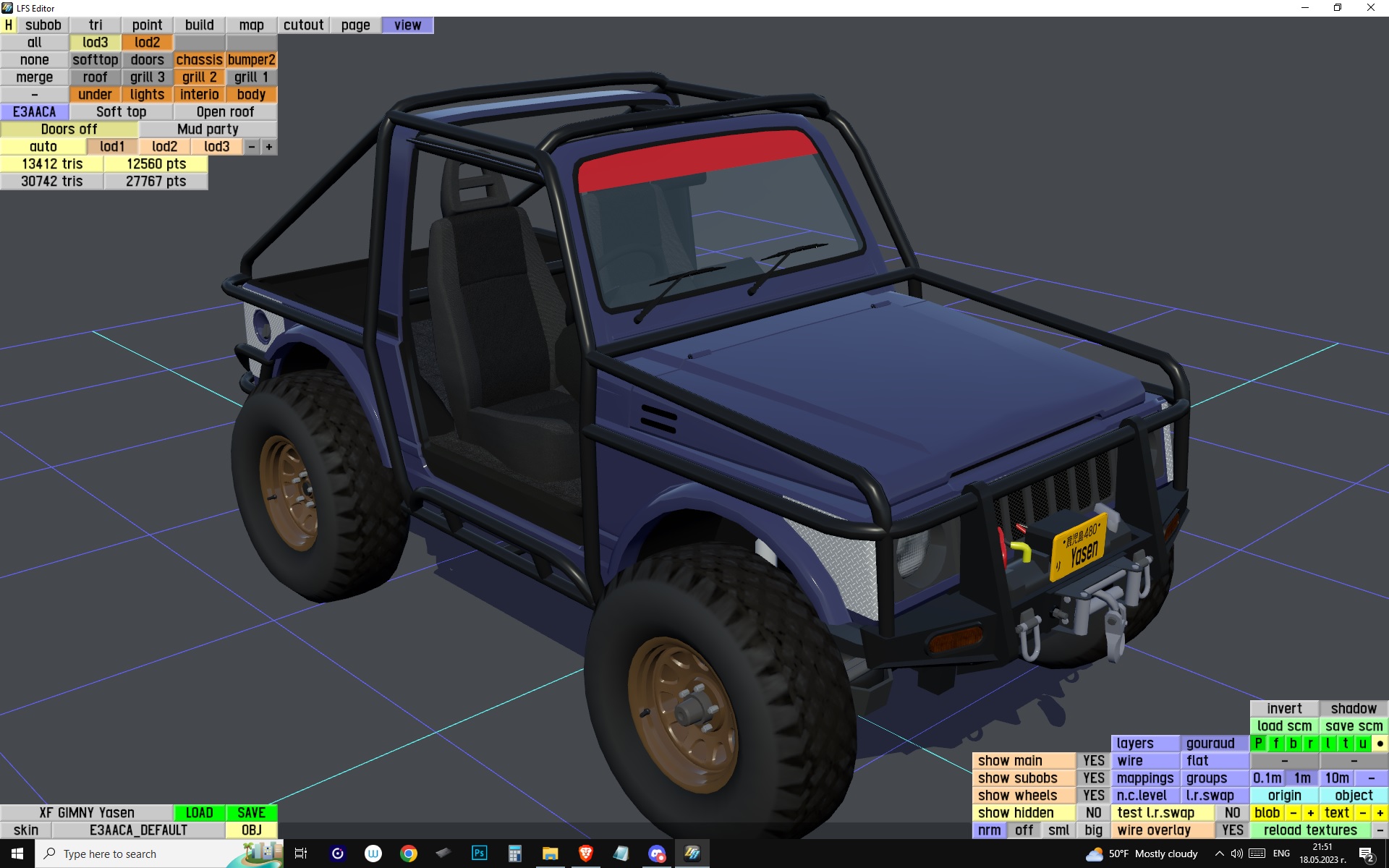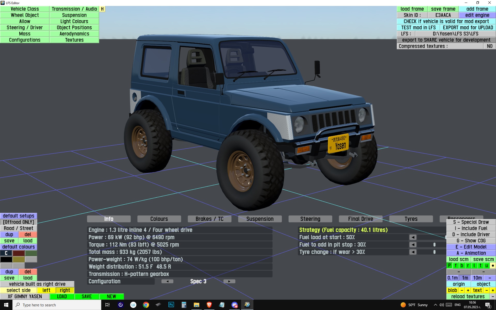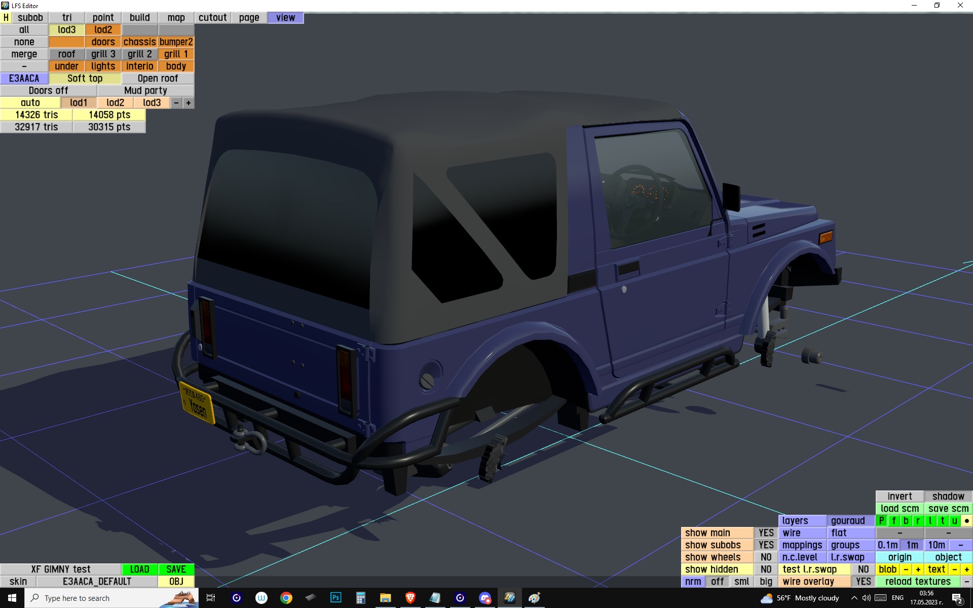 - New bumpers, sliders, winch, hooks, snorkel, roof rack, B pillar, soft top, inner and outside body roll cage, led bar, chassis mesh, exhaust, suspension mesh plus leaves attached as mudguards, spare tire mesh, skinnable spare tire vinyl cover, skinnable windshield banner