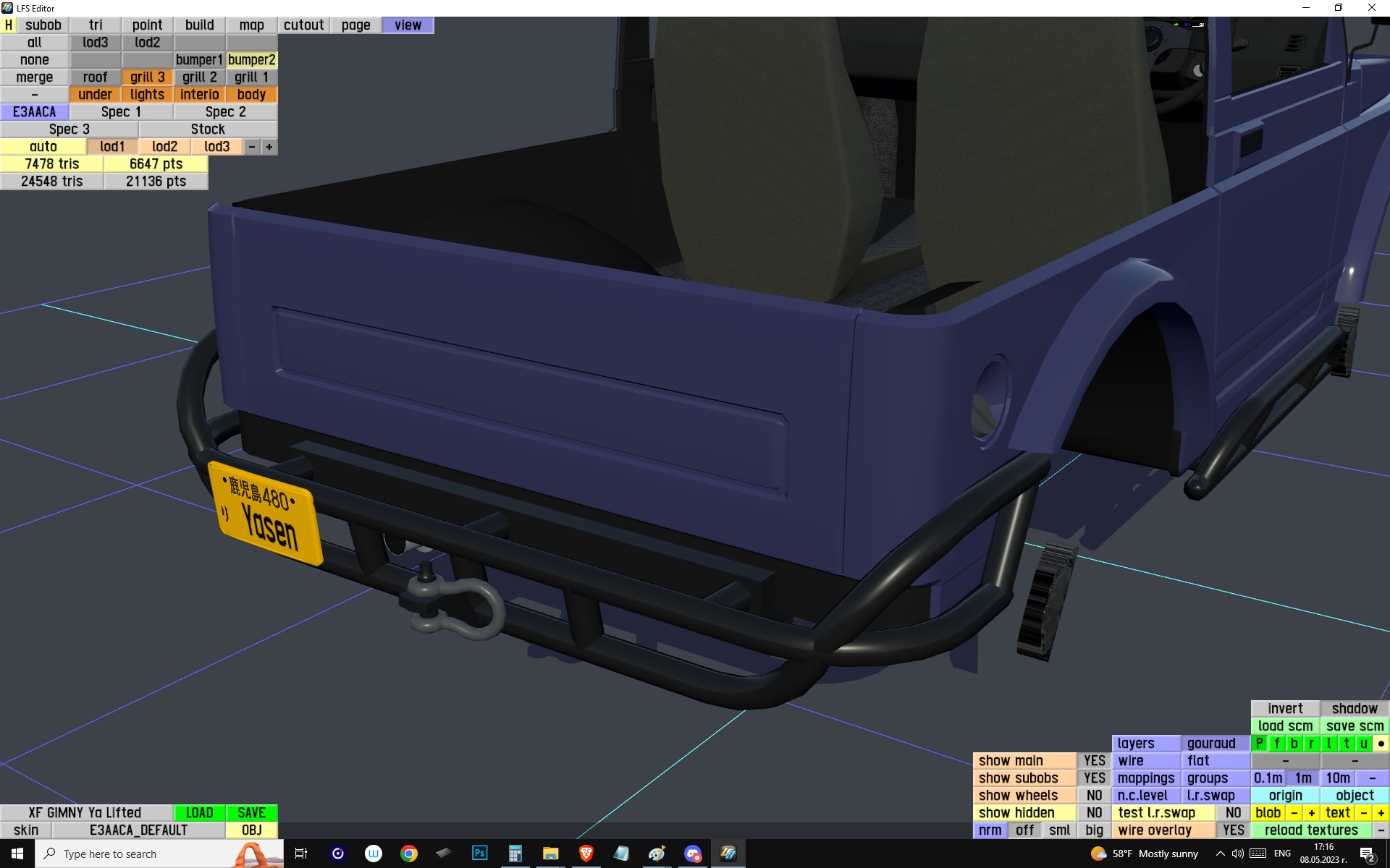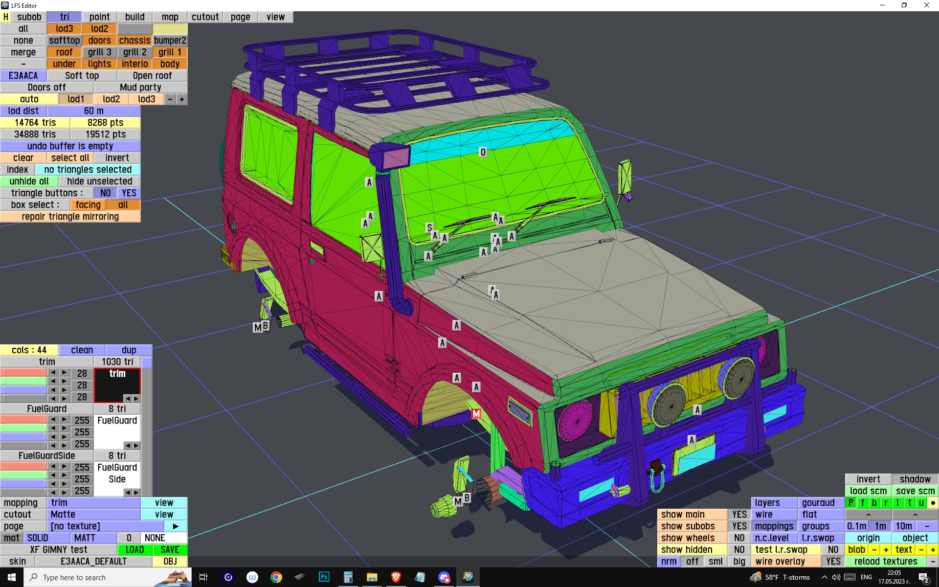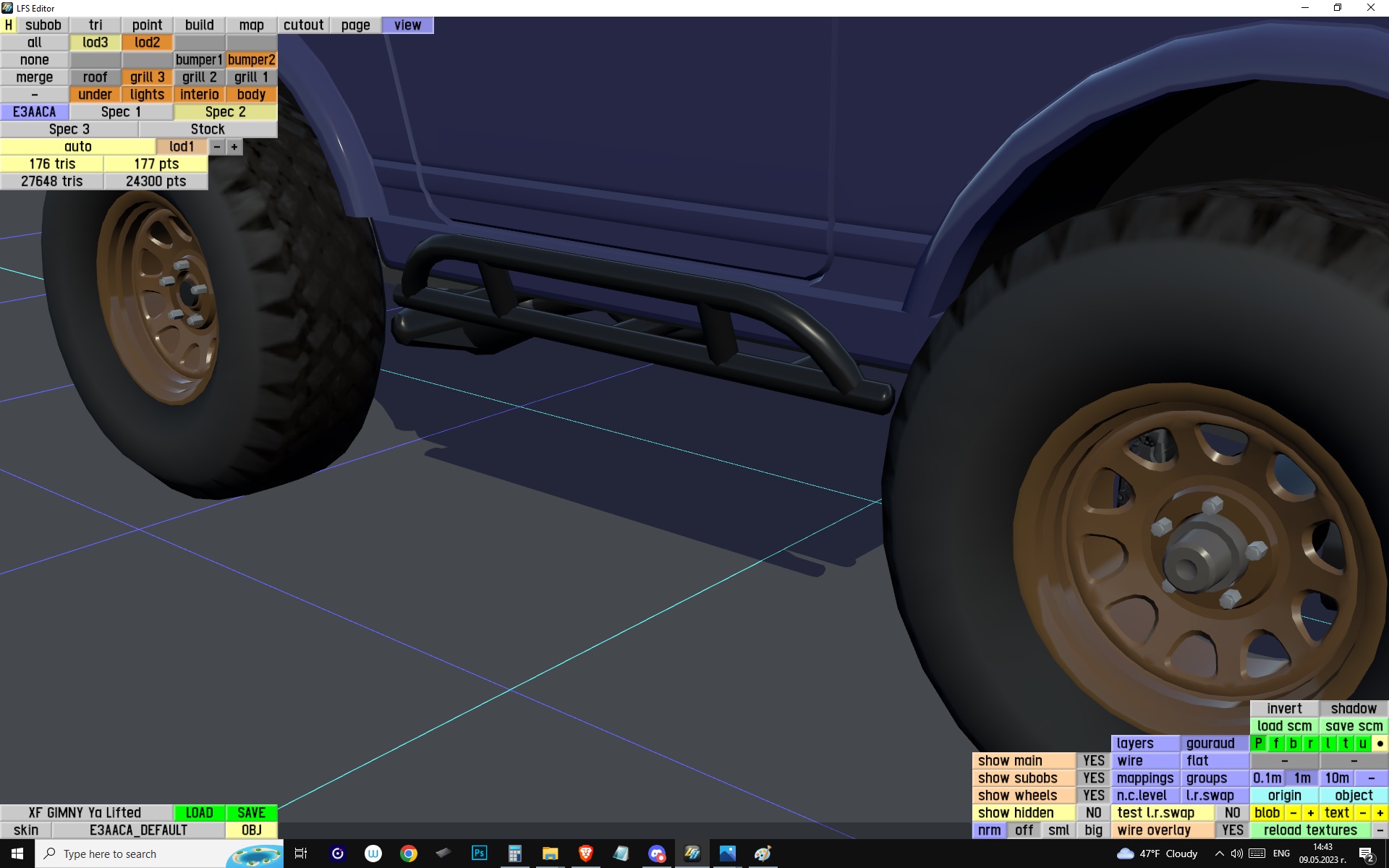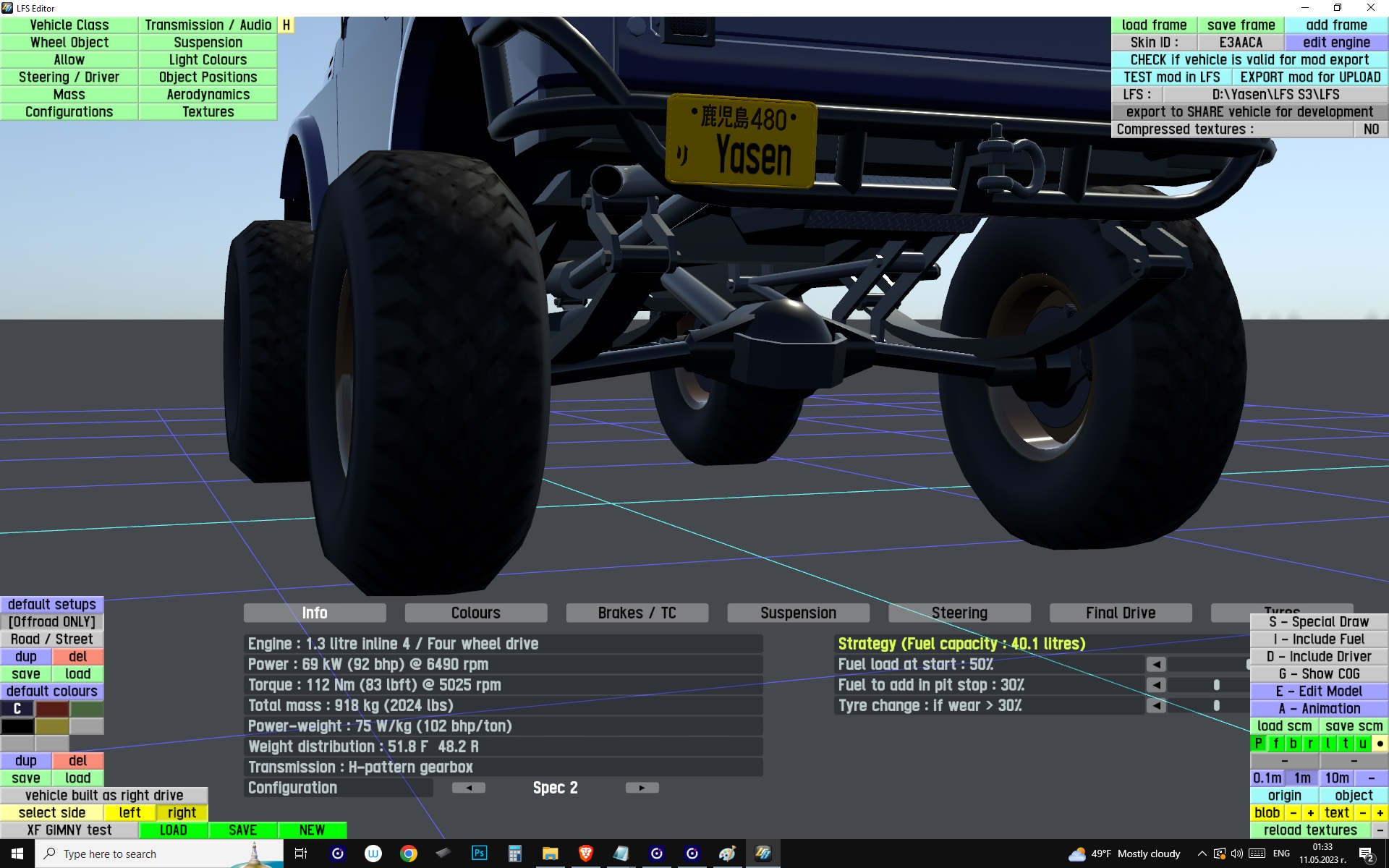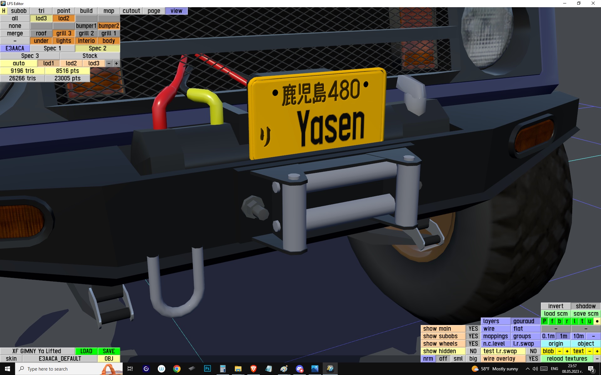 - New bumpers, sliders, winch, hooks, snorkel, roof rack, B pillar, soft top, inner and outside body roll cage, led bar, chassis mesh, exhaust, suspension mesh plus leaves attached as mudguards, spare tire mesh, skinnable spare tire vinyl cover, skinnable windshield banner