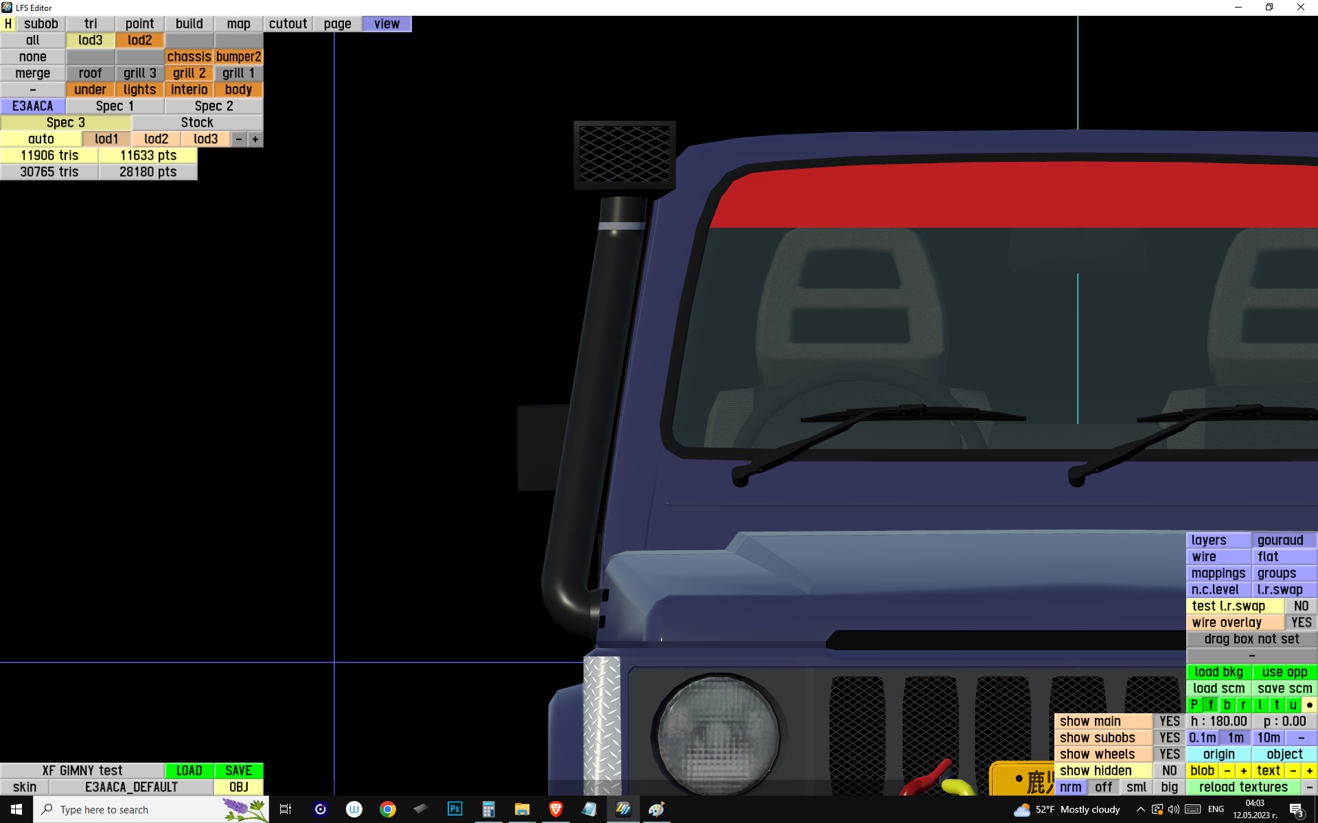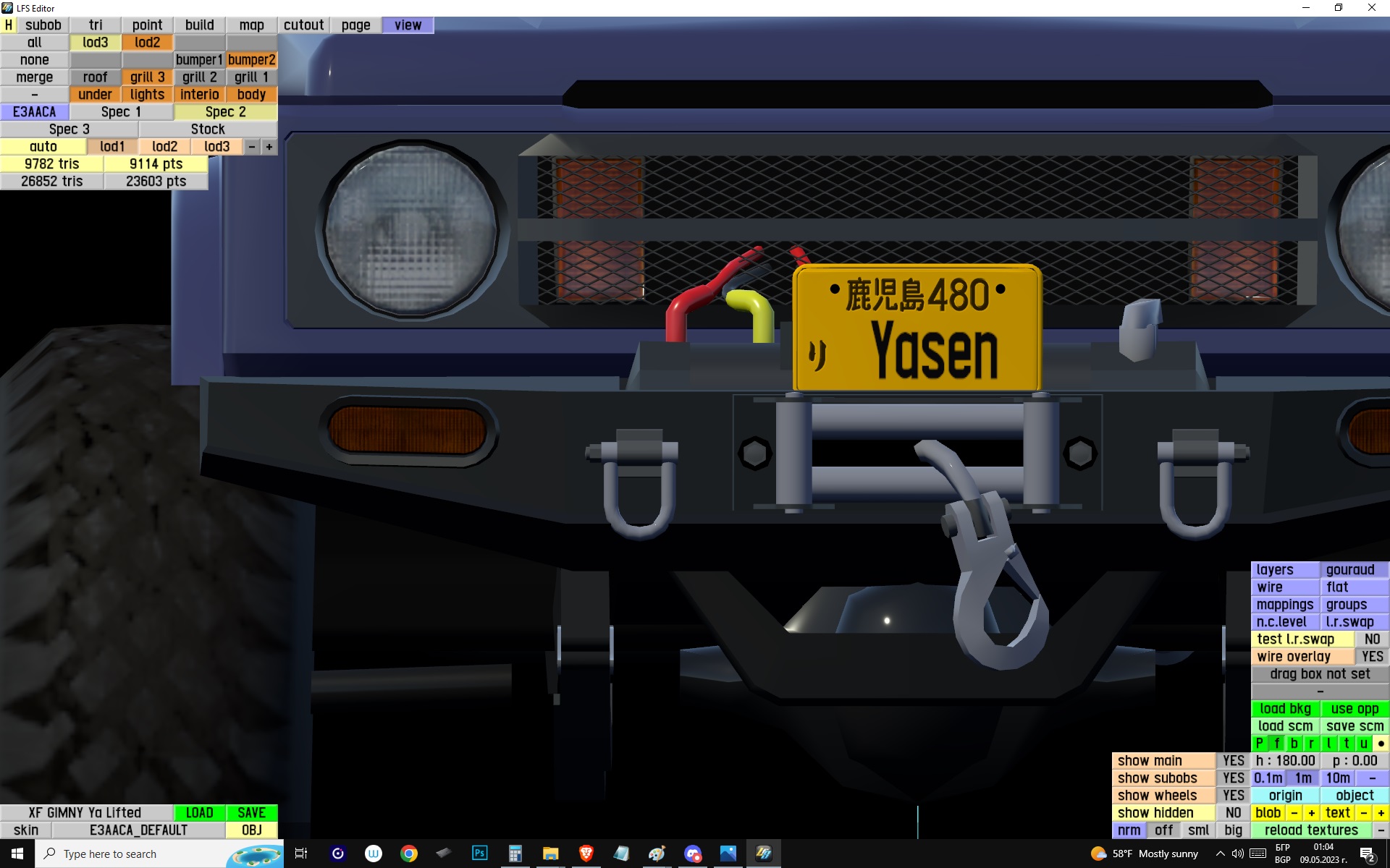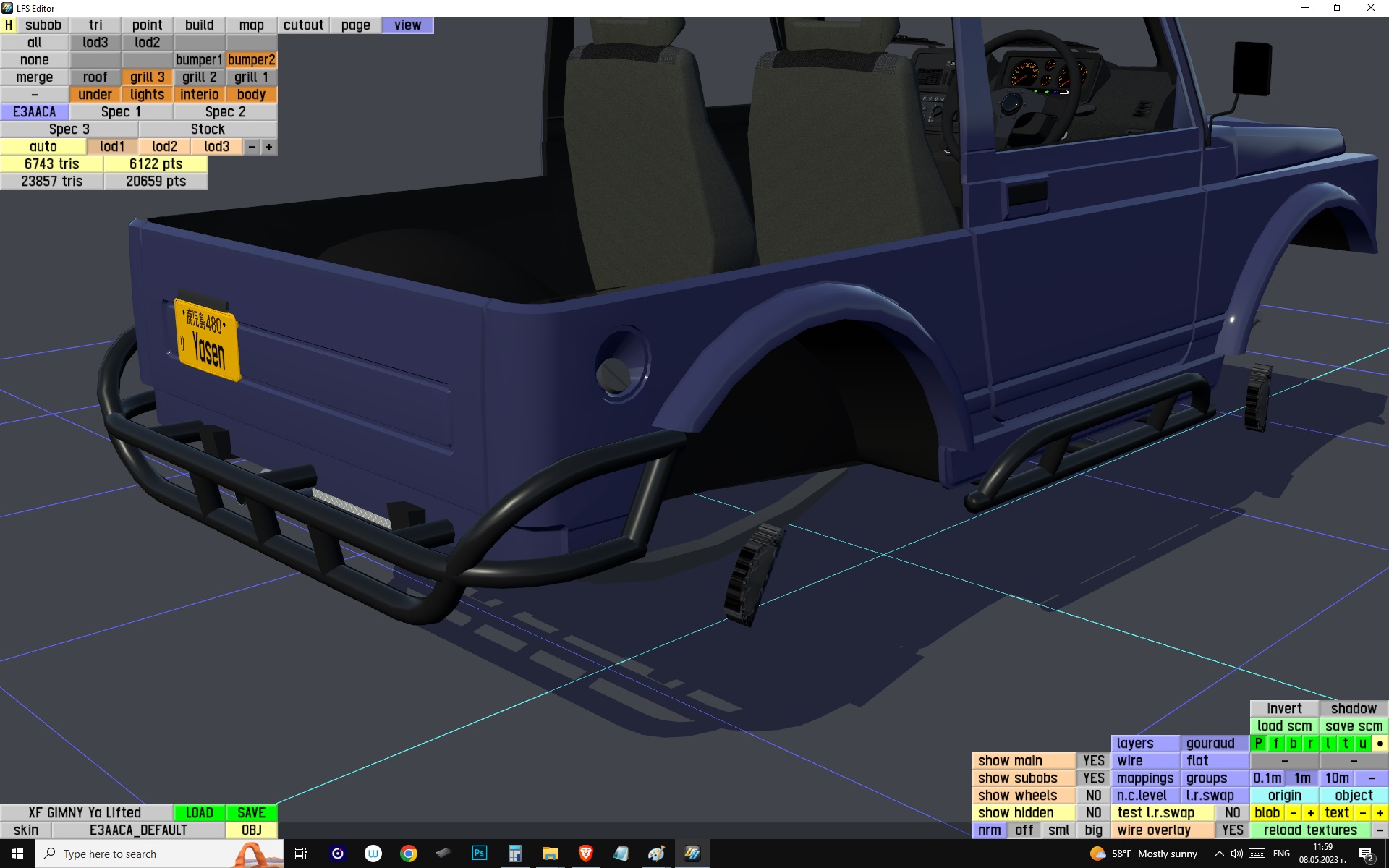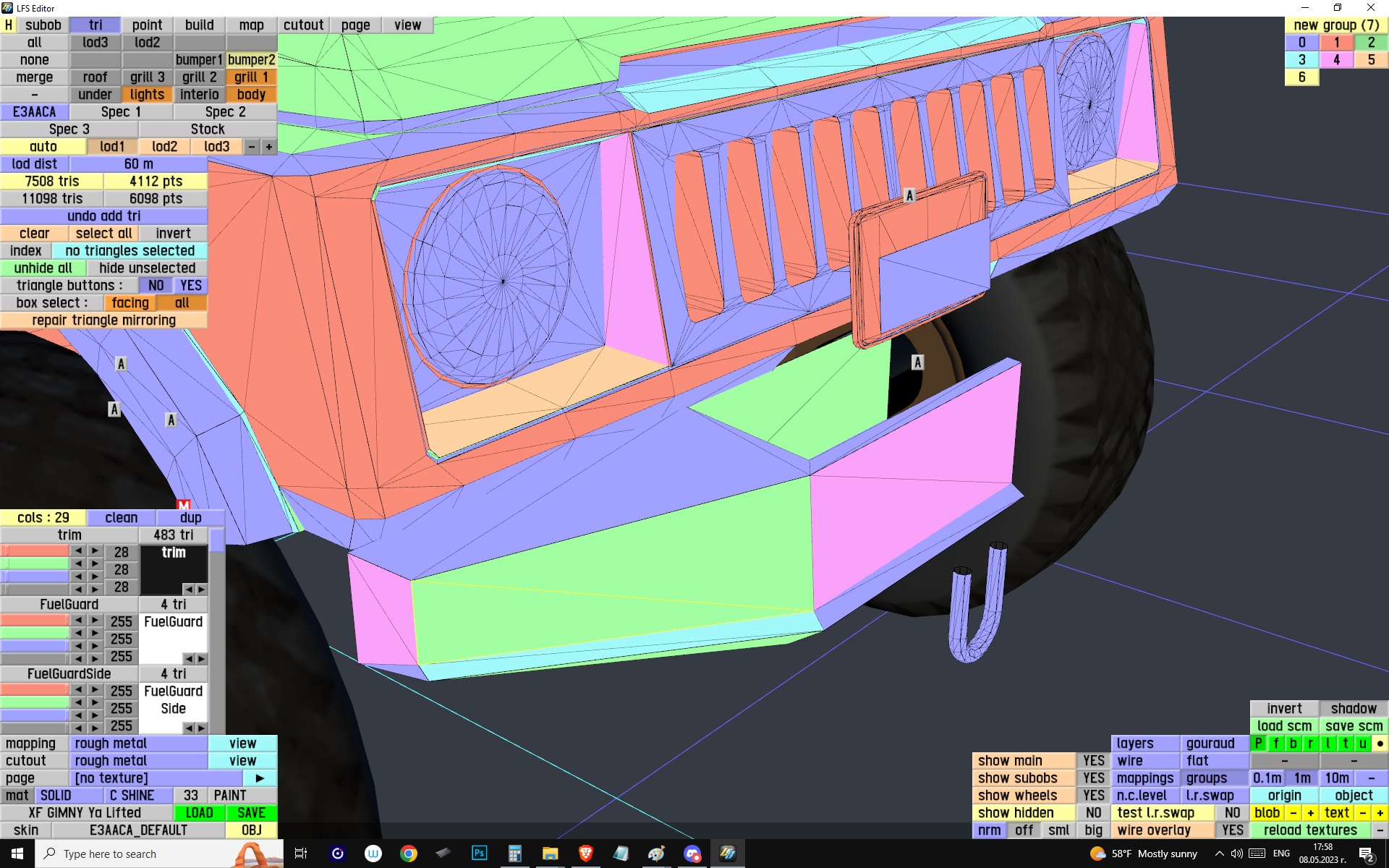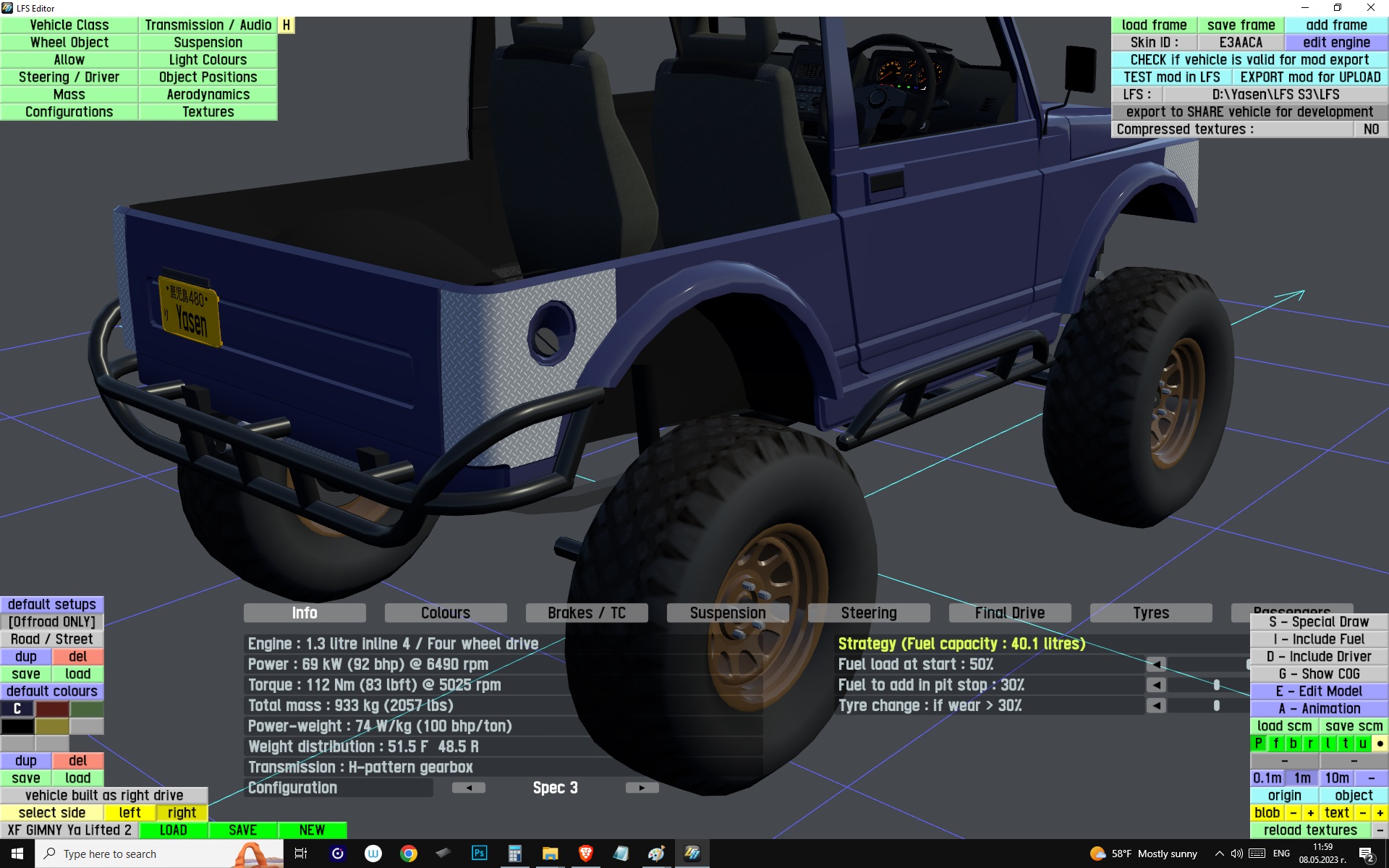 - New bumpers, sliders, winch, hooks, snorkel, roof rack, B pillar, soft top, inner and outside body roll cage, led bar, chassis mesh, exhaust, suspension mesh plus leaves attached as mudguards, spare tire mesh, skinnable spare tire vinyl cover, skinnable windshield banner
