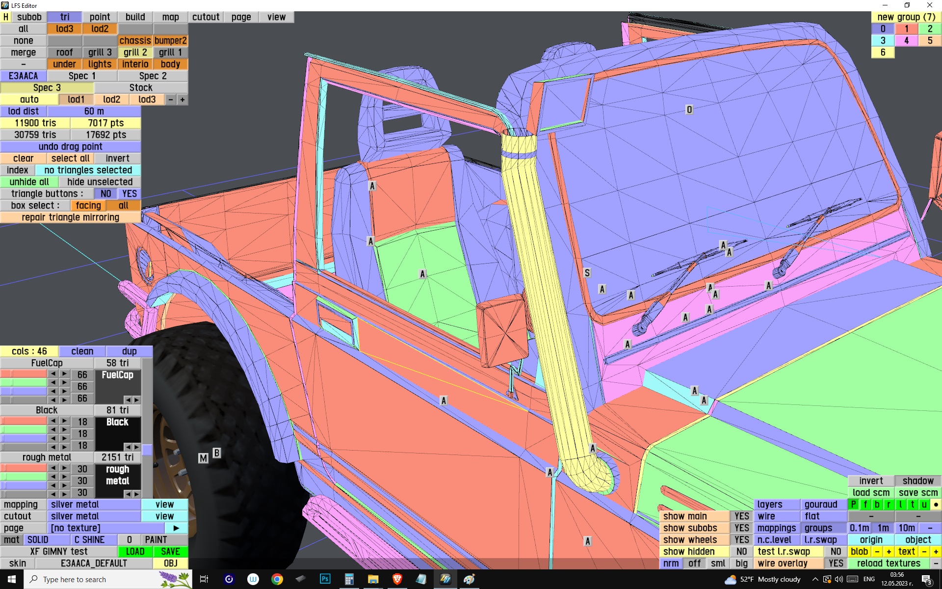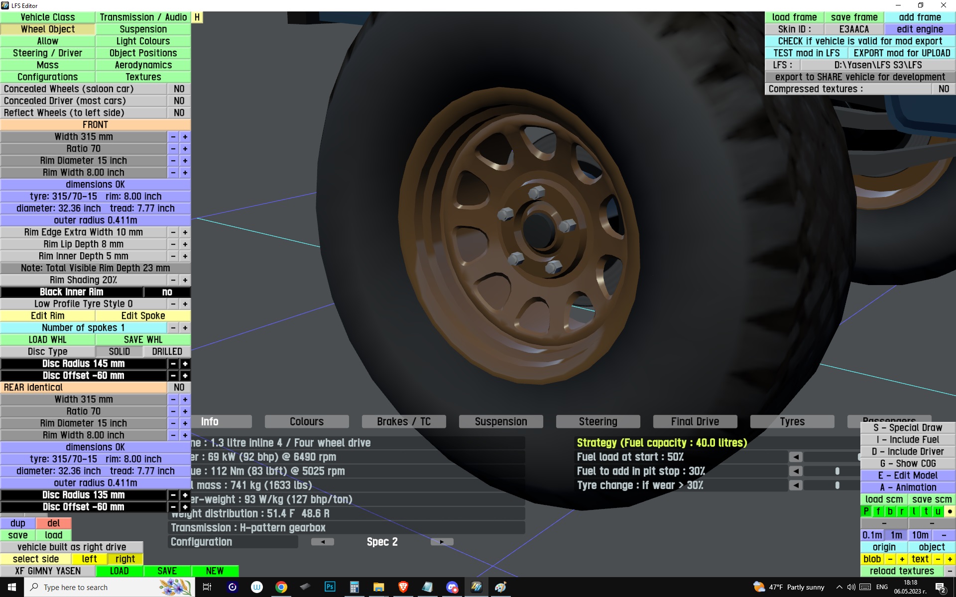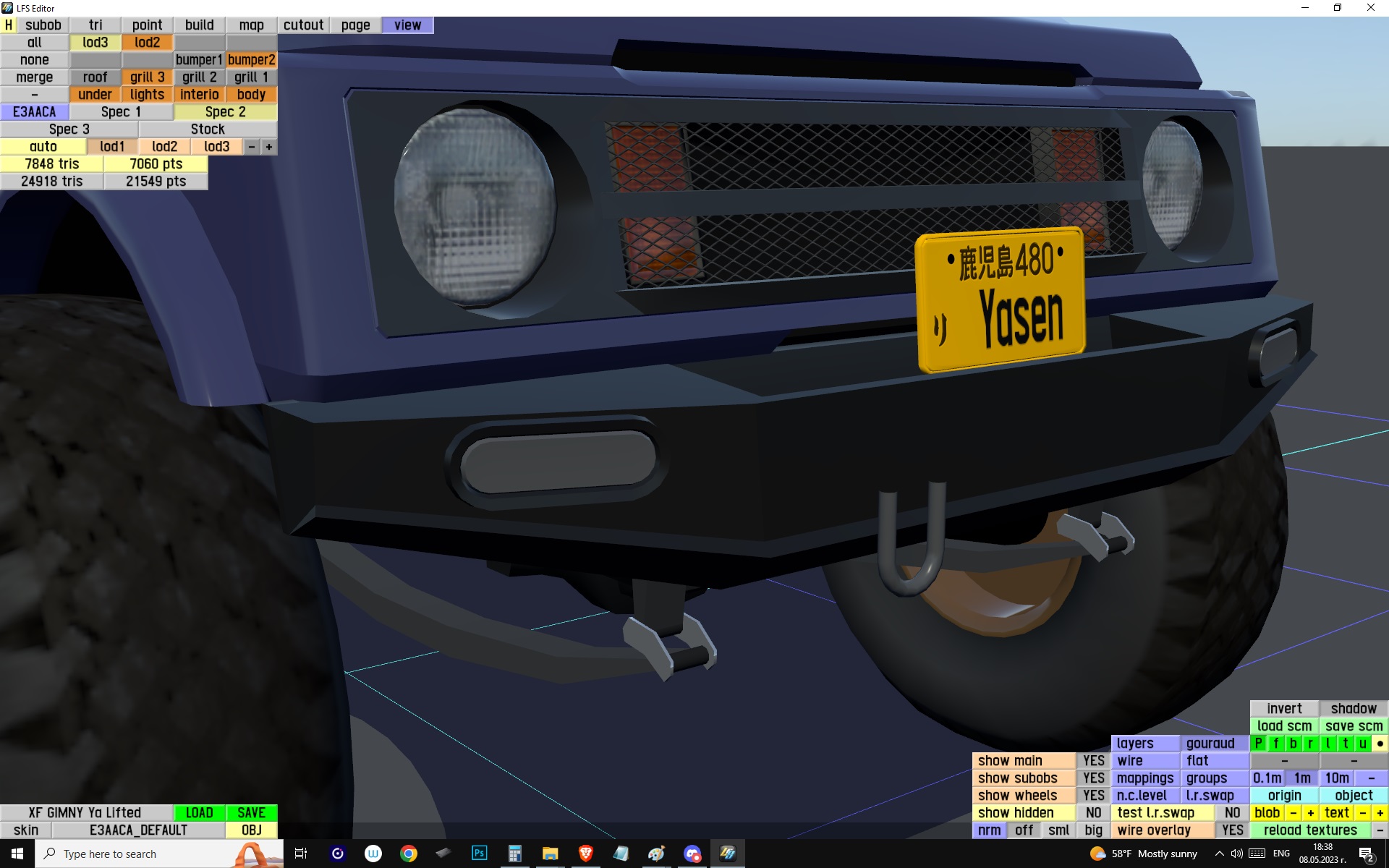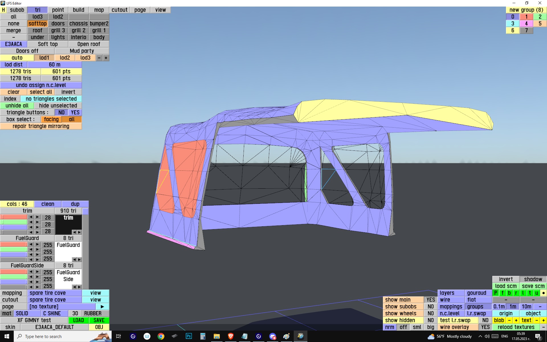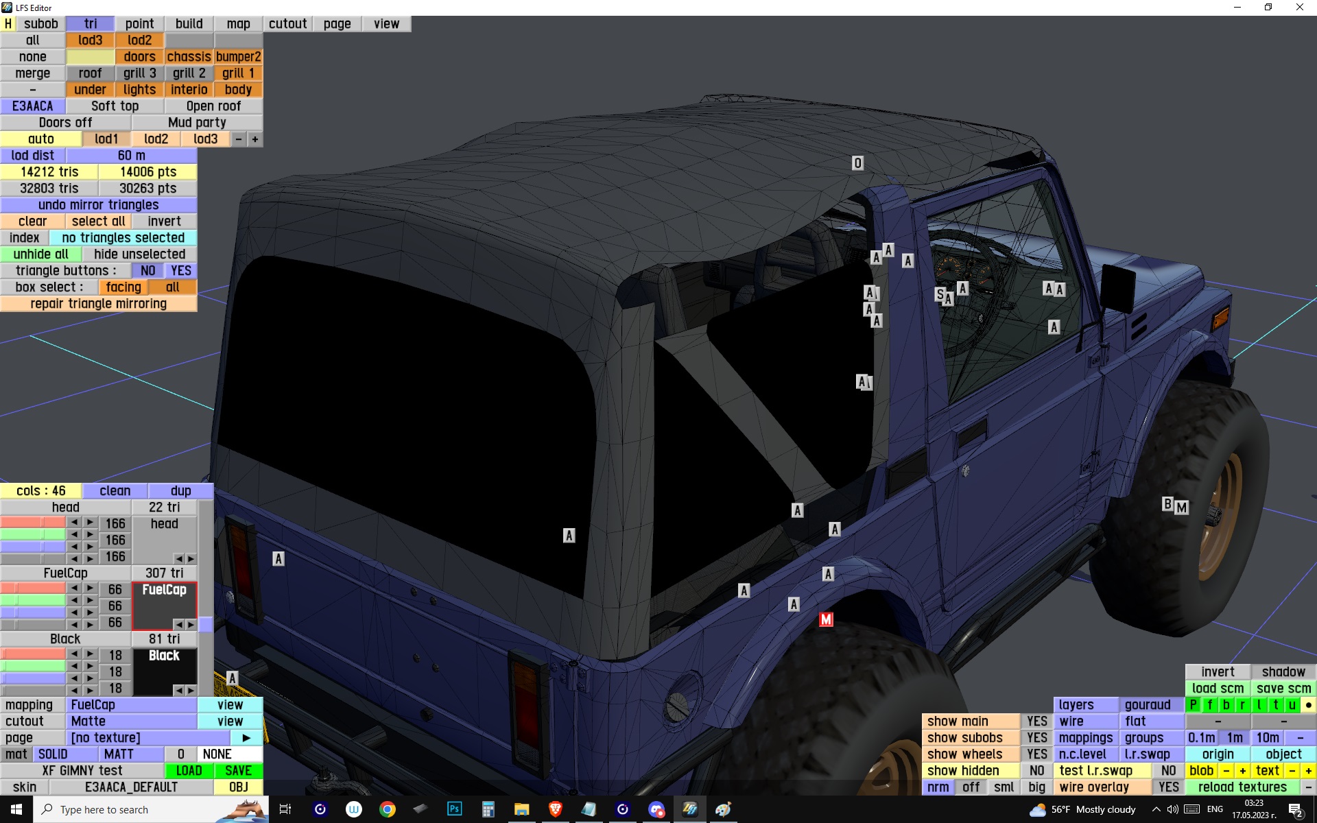 - New bumpers, sliders, winch, hooks, snorkel, roof rack, B pillar, soft top, inner and outside body roll cage, led bar, chassis mesh, exhaust, suspension mesh plus leaves attached as mudguards, spare tire mesh, skinnable spare tire vinyl cover, skinnable windshield banner