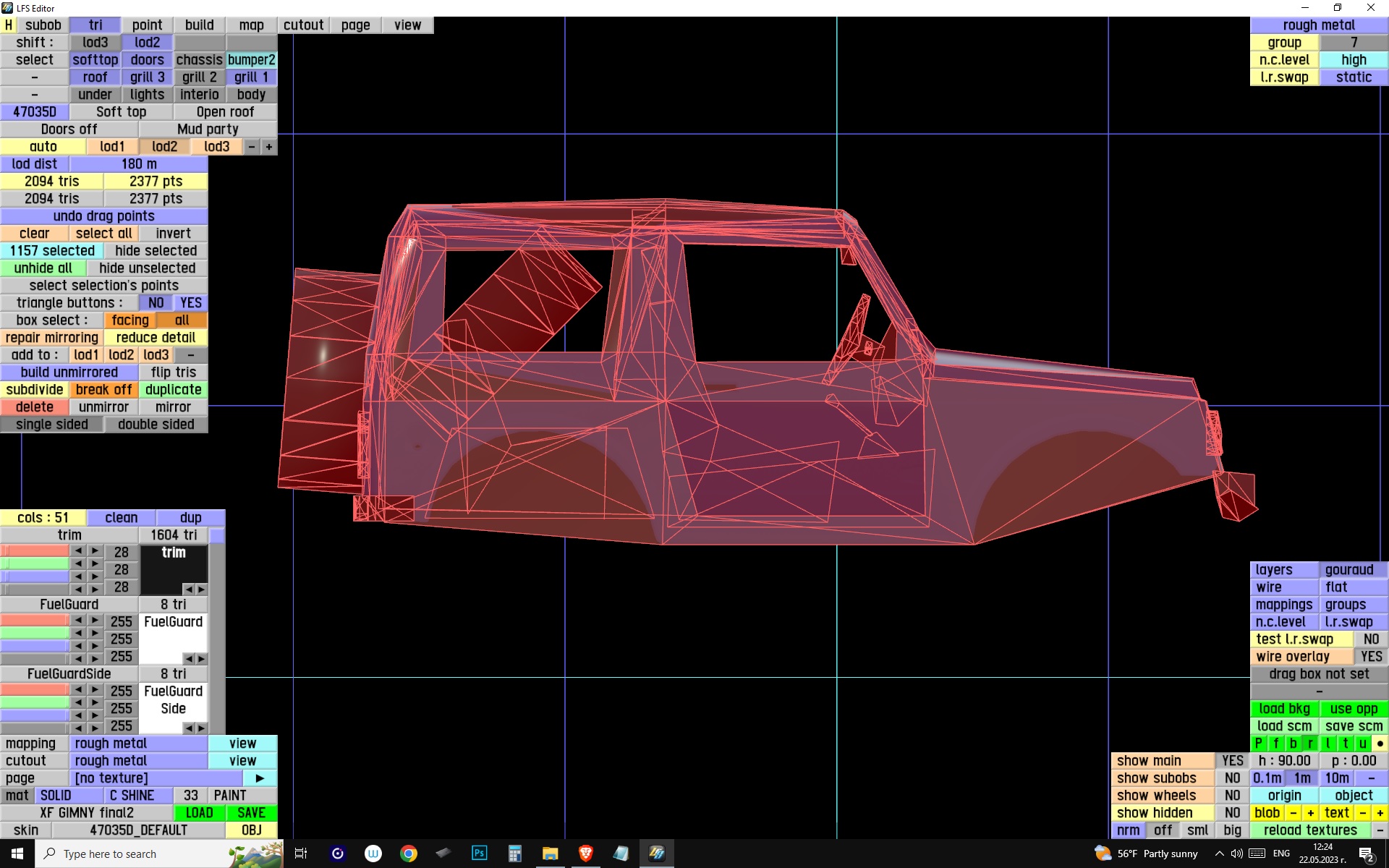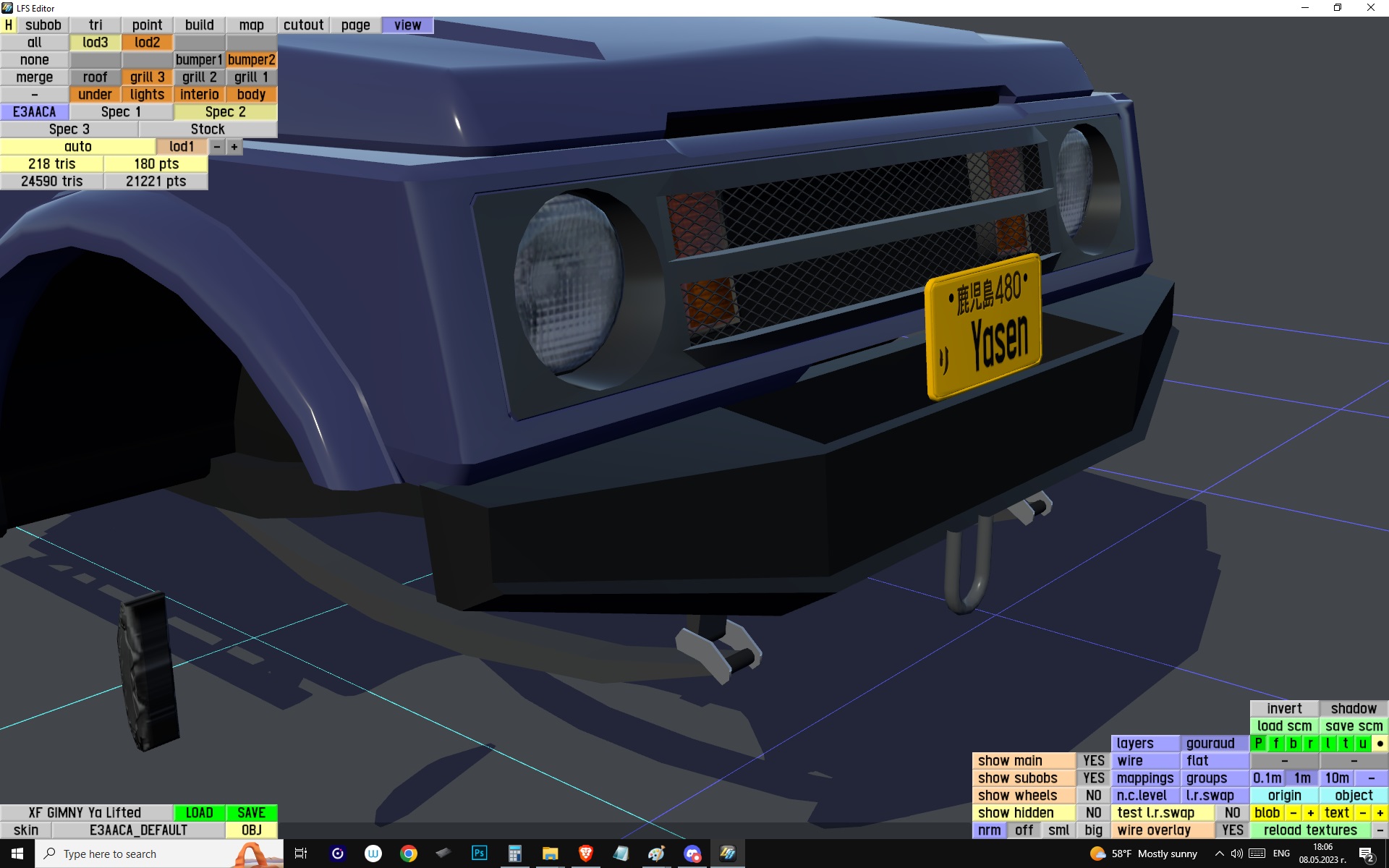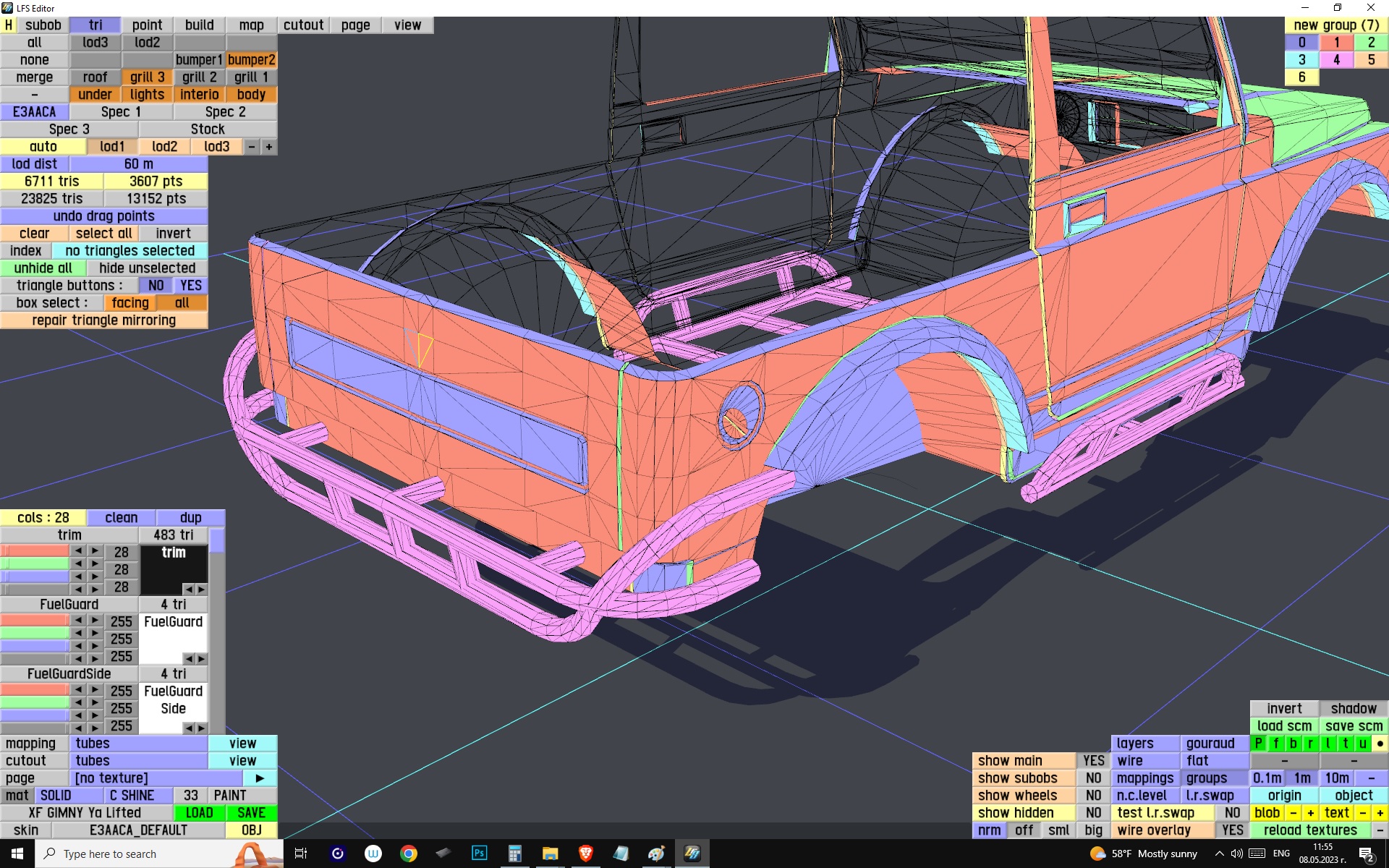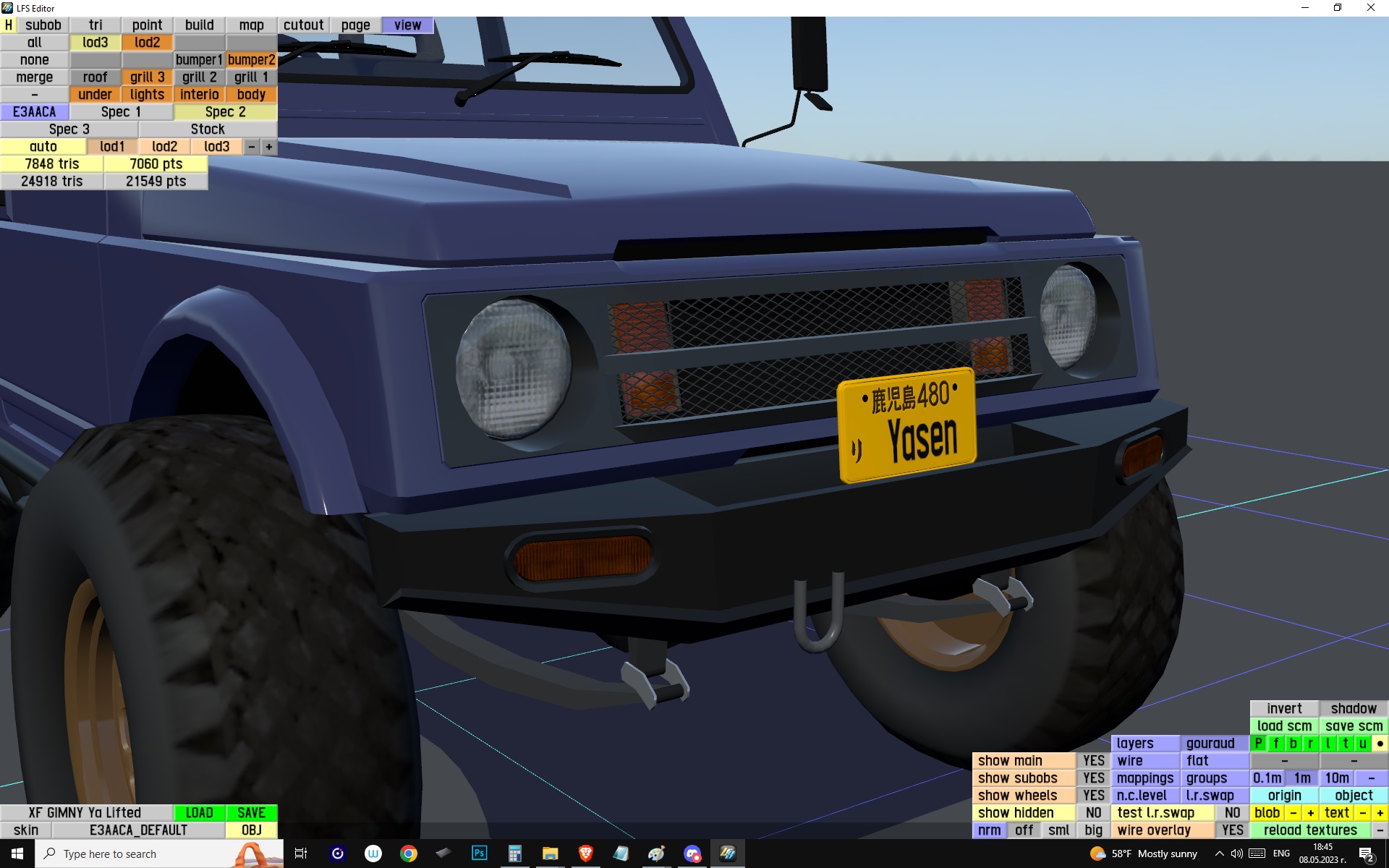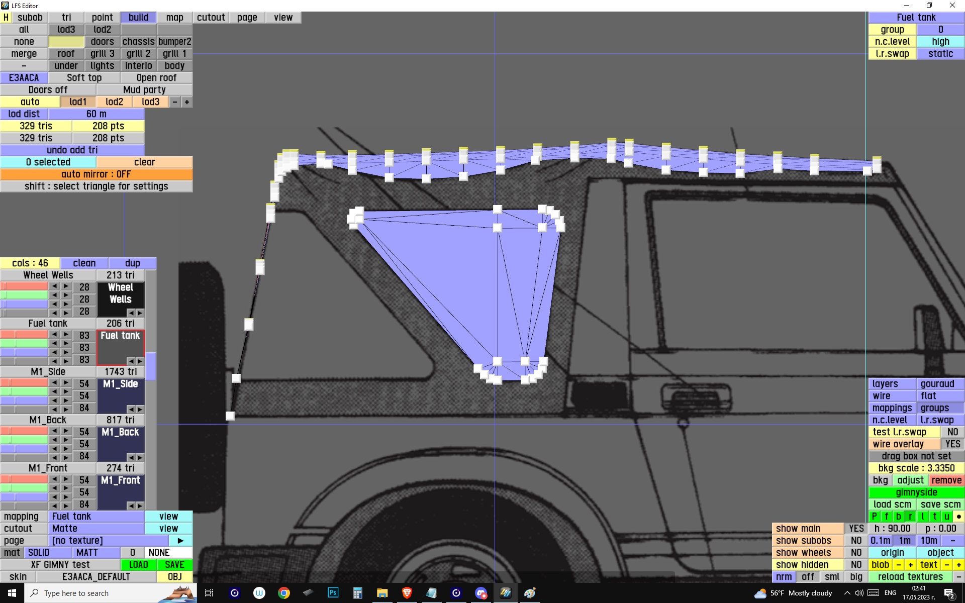 - New bumpers, sliders, winch, hooks, snorkel, roof rack, B pillar, soft top, inner and outside body roll cage, led bar, chassis mesh, exhaust, suspension mesh plus leaves attached as mudguards, spare tire mesh, skinnable spare tire vinyl cover, skinnable windshield banner