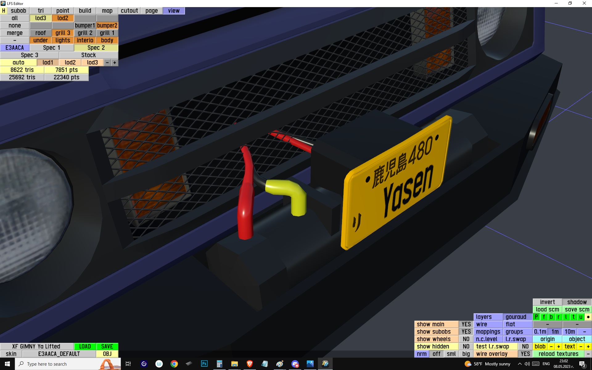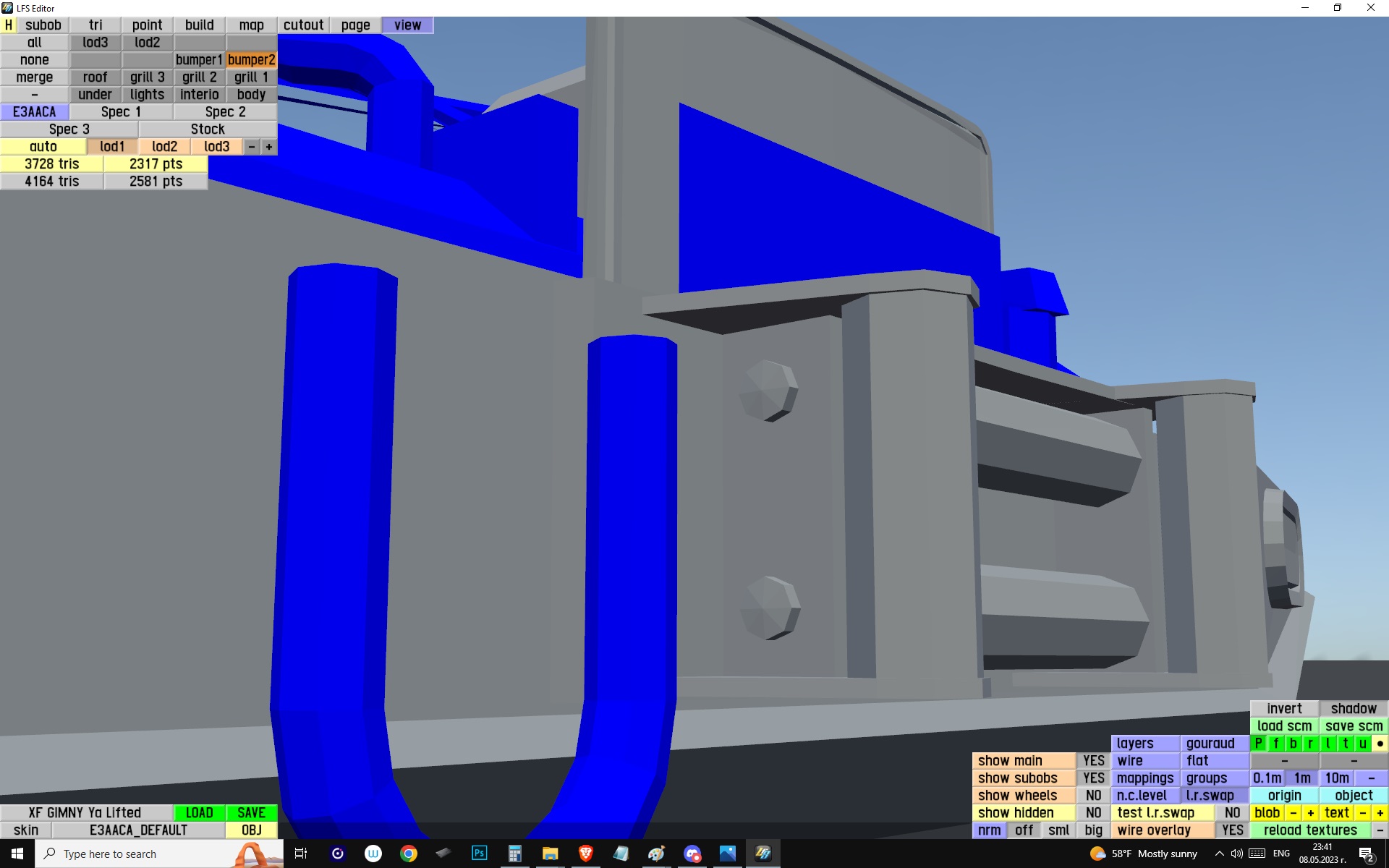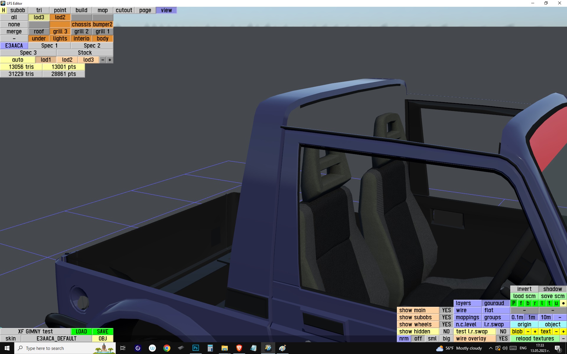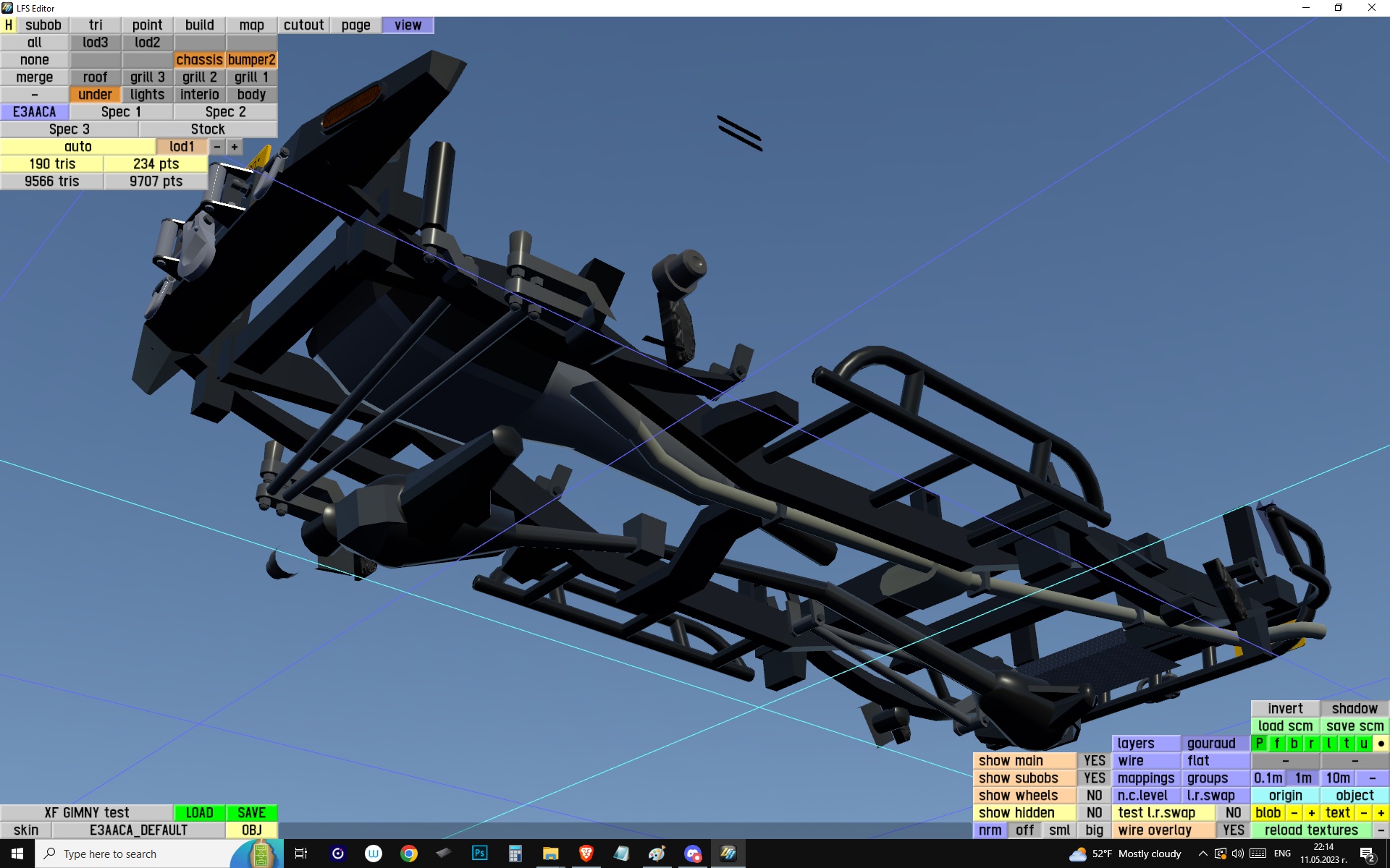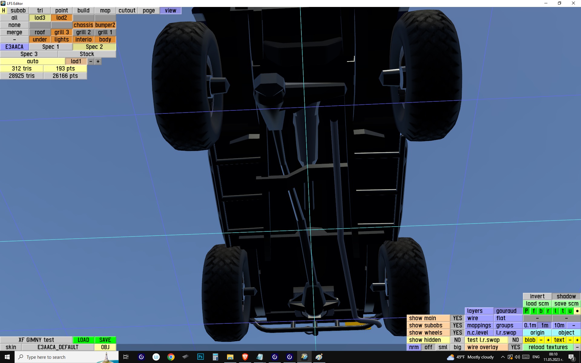 - New bumpers, sliders, winch, hooks, snorkel, roof rack, B pillar, soft top, inner and outside body roll cage, led bar, chassis mesh, exhaust, suspension mesh plus leaves attached as mudguards, spare tire mesh, skinnable spare tire vinyl cover, skinnable windshield banner