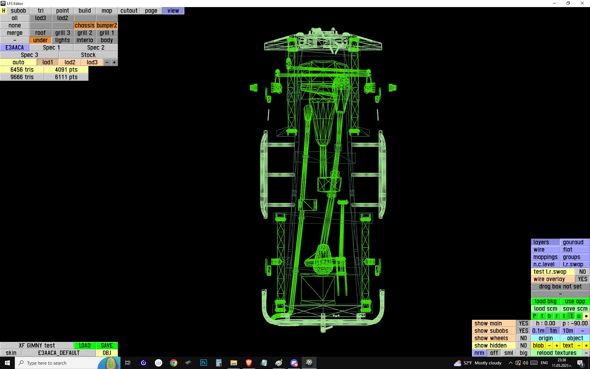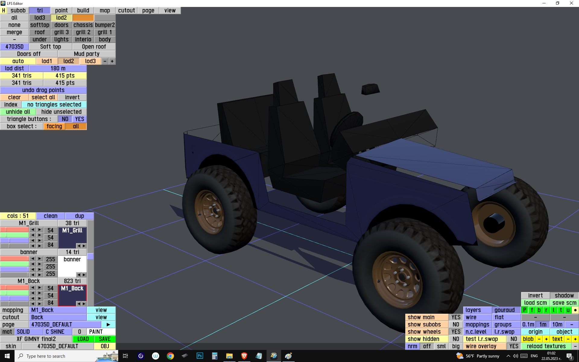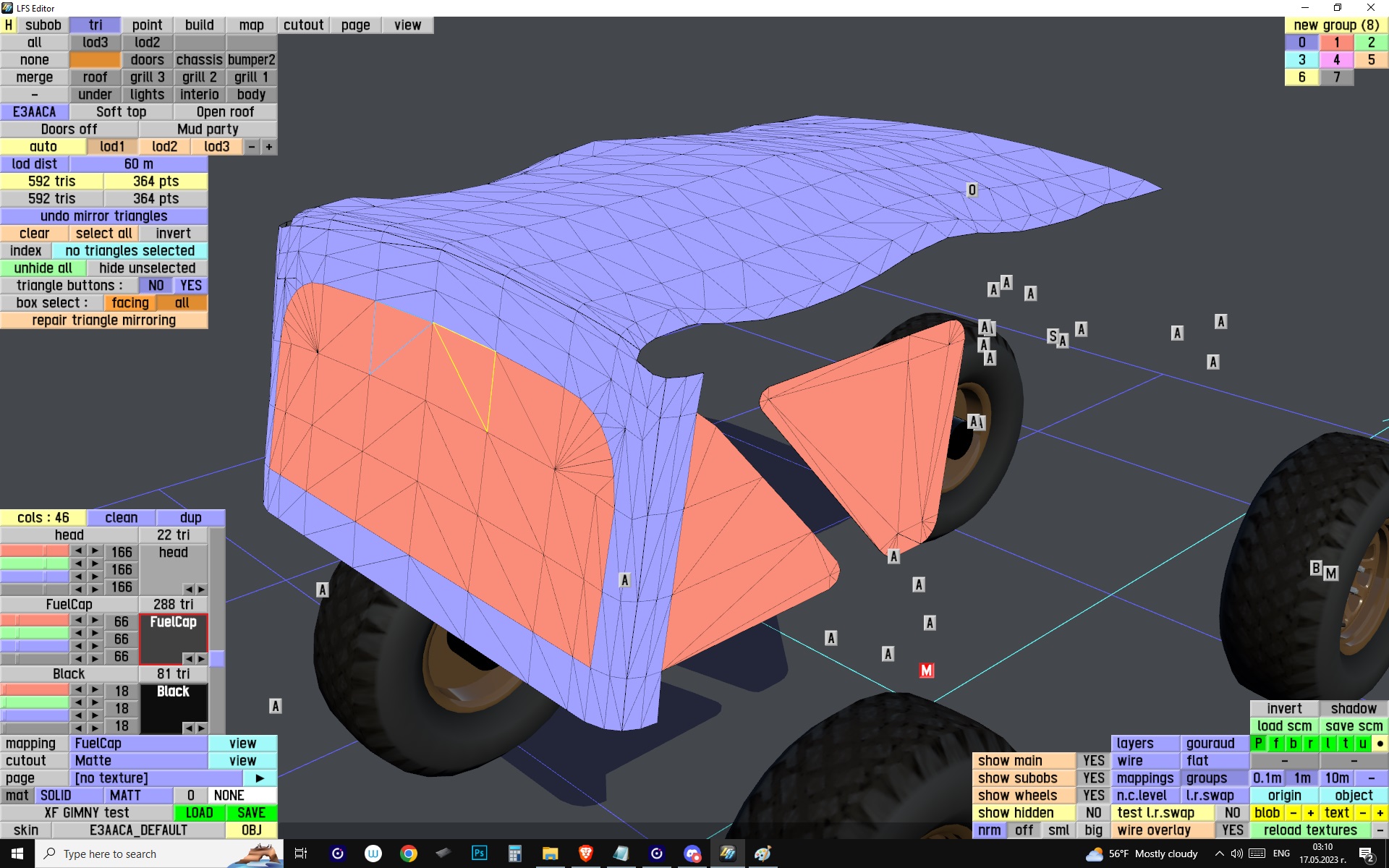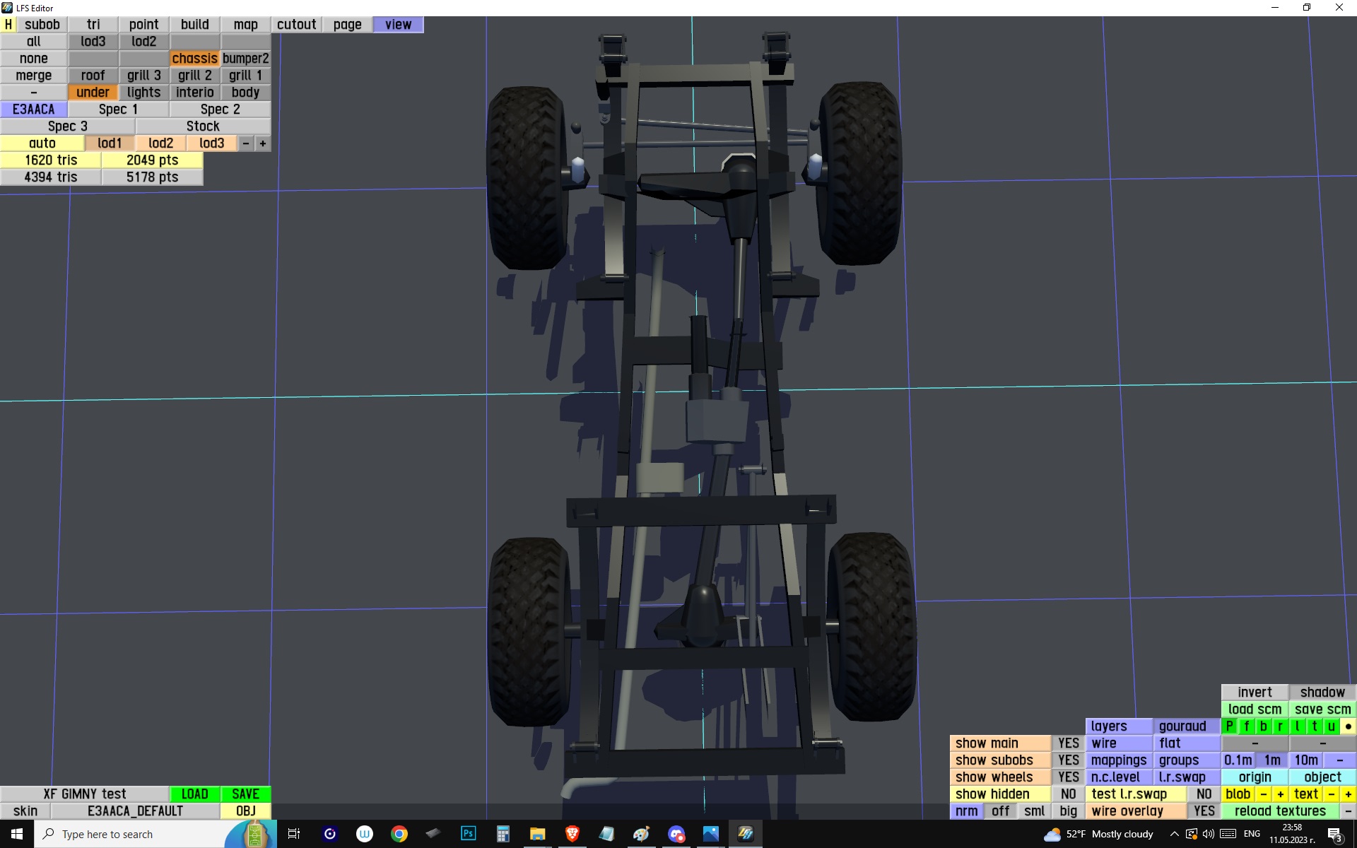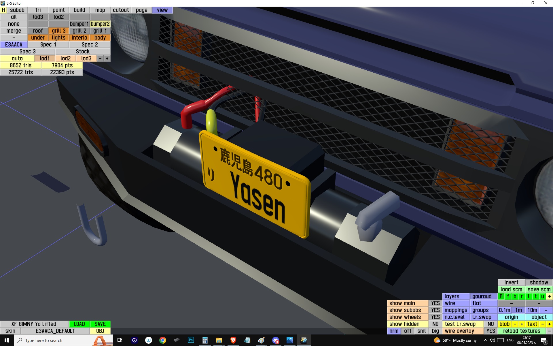 - New bumpers, sliders, winch, hooks, snorkel, roof rack, B pillar, soft top, inner and outside body roll cage, led bar, chassis mesh, exhaust, suspension mesh plus leaves attached as mudguards, spare tire mesh, skinnable spare tire vinyl cover, skinnable windshield banner