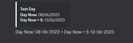$FieldValue = StripLFSColor("**Day Now: **".$DayNow."\n **Day Now + 5: **".$DayNowPlusFive."");
