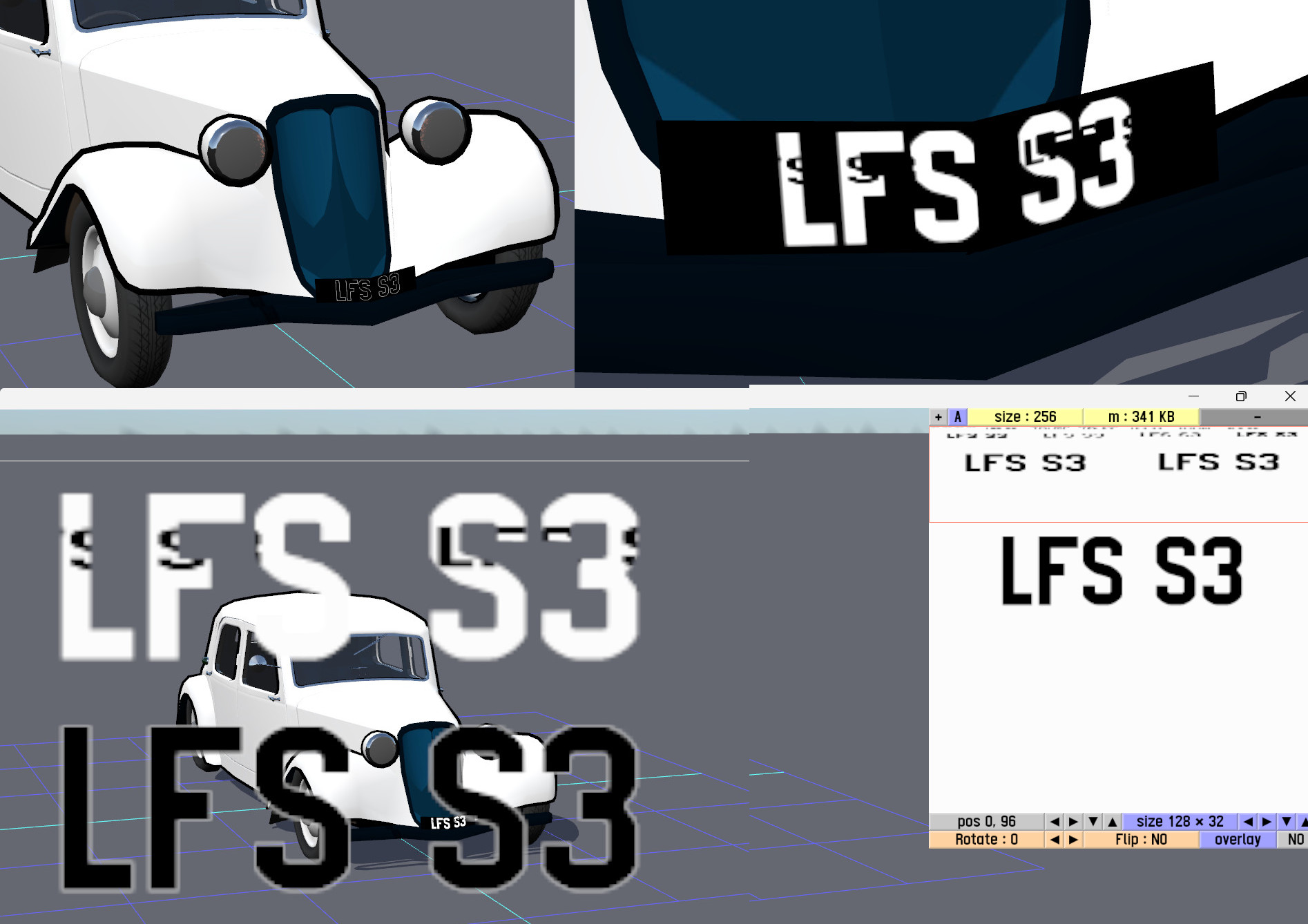 Corrupted license plates. Sometimes the s_plate_ALP texture looked like it contained mip maps. At the same time small black letters were drawn over the bigger white ones in the modeller. At the same time the plate letters were drawn black with white contours in the vehicle editor. Repeated reloading of the textures fixed the issue.