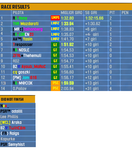 - LMP2 classification is led by RG^Lorenzo, slightly ahead of THR Madzarati & Yasin