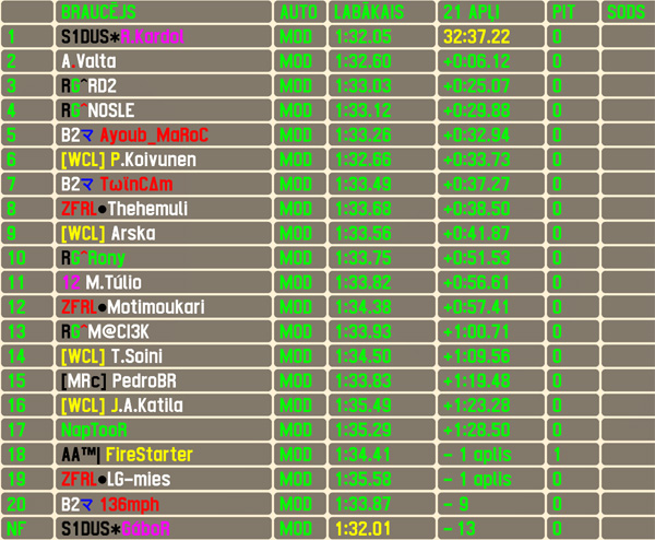 One who wasn't too affected by new car and tricky track was R.Kardol - even if just by 3 hundreths of a second,the dutchman was fastest in qualifying and scored his 17th pole position tying Excellent15 for 4th most all time. R.Kardol led all 21 laps of the race,early of the race closelly followed by his teammate,but after his retirement solely in safe lead to cross finish line 1st. With this performance R.Kardol scored his 19th RTFR race win and 81st top5 finish. After 11 races break A.Valta returned to RTFR action and despite being just 3rd fastest,he finished 2nd in the race to score his 19th top5 finish. With 25 seconds gap to winner the "best of the rest" was Race Green's newest recruit RD2,who finished in top5 for the 1st time and that in 3rd position right away - his previous best result was halved in his 10th RTFR attendance. His teammate Nosle finished 4th and with it doubled his top5 finishes count,but top5 was closed by somewhat more experienced top5 finisher - Ayoub Maroc scored his 12th of these.