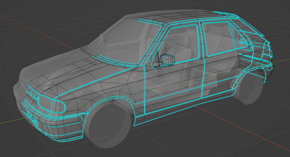Progress: tuned wheel alignment and suspension travel according to the service manual, added a realistic center of gravity, completed physics (except dampers, where a more accurate linear approximation is needed to fit values obtained from the service manual). Started modeling the rear. The first test-drive feels surprisingly realistic. The front bumper almost buried itself to the ground and the outer rear wheel lifted above the surface during a sharp cornering. The real car did the same thing, when going too fast through a roundabout (the slower versions did not have an anti-roll bar).