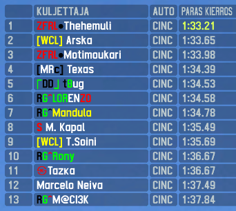 In the start, Arska made use of his pole position and took an early lead. Thehemuli kept his second place but could not seem to match the pace of Arska. Starting from third, T.Soini made a few mistakes and ended up all the way in tenth after the first lap. This allowed Motimoukari to move into third place in the first sector. That third place would not last long however, as M had made up his way to 8th by the end of the first lap. On lap 4, he took over third place and started to reel in the two finns ahead of him. A few laps later he caught up to Thehemuli but made a small mistake when trying to pass. This allowed Arska to pull a 10 second gap ahead. But there was still a long way to go, and this is where tyre management started to make the difference. M was able to keep his pace and tyres in a good state, while Arska was struggling with both. On lap 16, M took the lead and never looked back, taking his first win in ARC by almost half a minute despite starting from the back. Thehemuli was also able to keep his tyre temperatures under control, and slowly but surely caught up to Arska and moved past him to take home second place, while Arska managed to hold on to the last podium position. Motimoukari equaled his previous best finish of fourth, and despite the first lap difficulties, T.Soini took fifth place in the end. That marks a 2 place improvement over his previous best finish. Sixth place was taken by 136, Maciek was seventh. Unfortunately Rony rolled his car a few laps before finish, but still gets classified due to completing over 50% of full race distance.