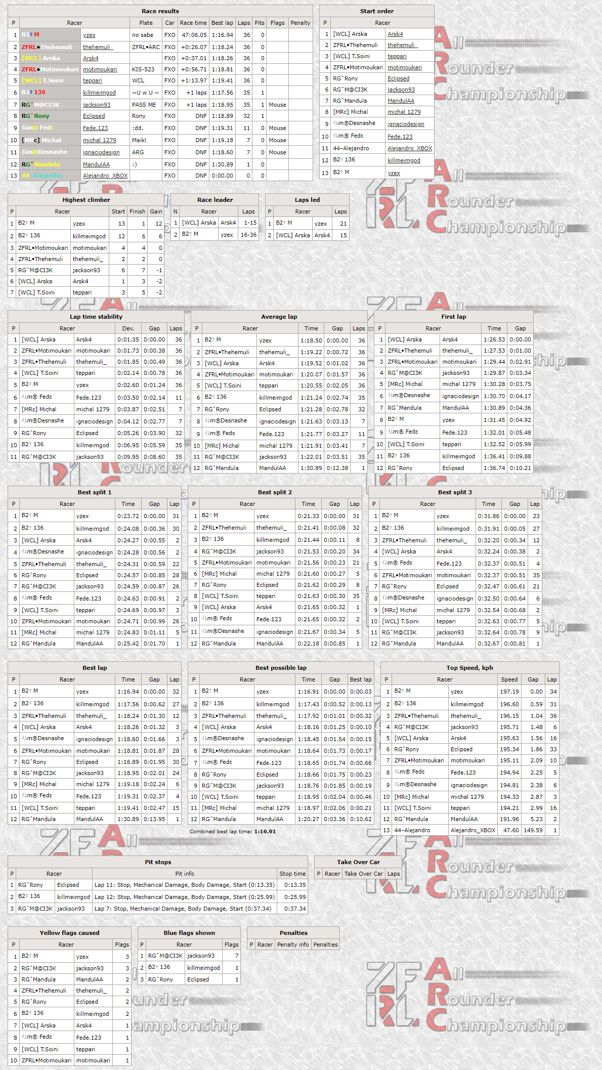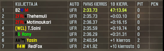Rony was looking set for fourth place, but Maciek had other ideas. He overtook his teammate and held fourth place for a whole 1 sector before rolling his car against a barrier in turn 1 handing his position back to Rony. That still was not enough for the Latvian to keep his position as he made a small mistake 1 lap before the finish, which gave the fourth position to the fast chgarging finn T .Soini. He was able to hold the place and improved his best finishing position in ARC by one place. Top 5 was completed by Rony who also improved on his best finishing position. Two other cars crossed the finish line, but only one of the was classified: Yasin took sixth place, while Redfox did not complete required 50% of race distance. Two other cars did, Maciek was 7th and kubzz was 8th.