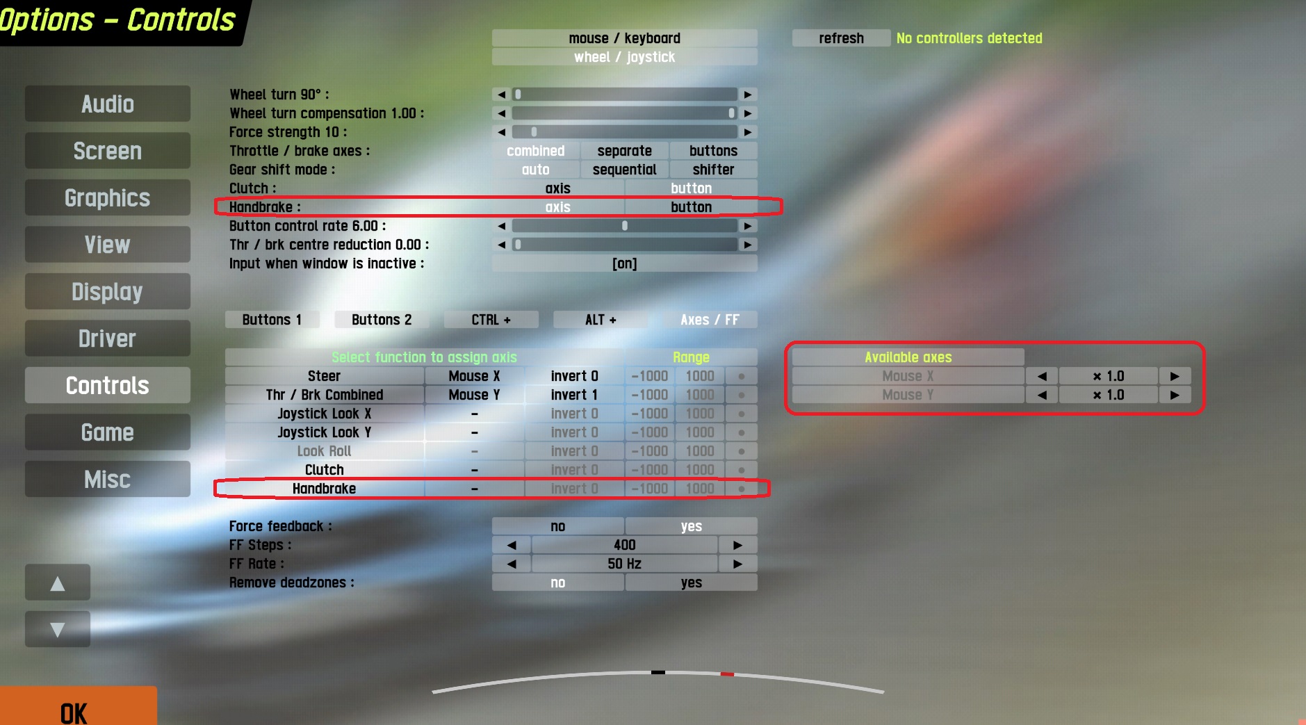 I've tried it with a mouse, but haven't tried it with a separate handbrake. You can change the handbrake from button to axis in options -> controls. If you use the handbrake with a wheel, it should be almost plug-and-play. If you use it without a wheel, you need a "Fanatec ClubSport USB Adapter" which converts the handbrake cable into USB. I've attached a sample screenshot, you should have more "Available Axis" on the right side, one of them will be the handbrake.