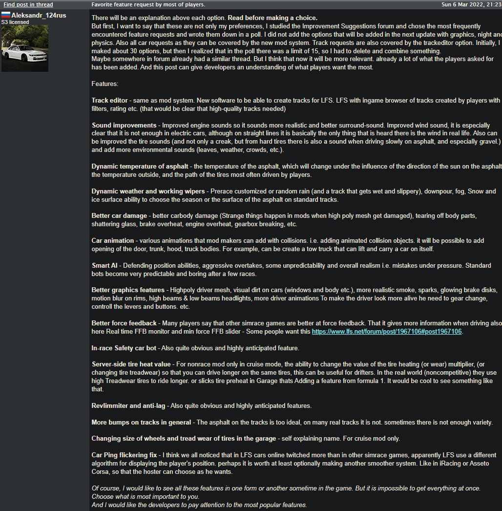 But first, I want to say that these are not only my preferences, I studied the Improvement Suggestions forum and chose the most frequently encountered feature requests and wrote them down in a poll. I did not add the options that will be added in the next update with graphics, night and physics. Also all car requests as they can be covered by the new mod system. Track requests are also covered by the trackeditor option.