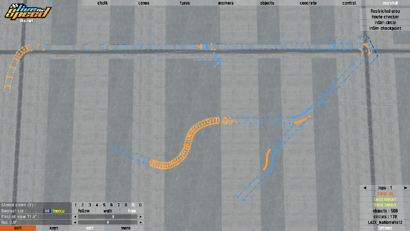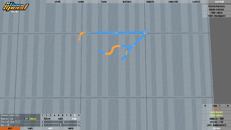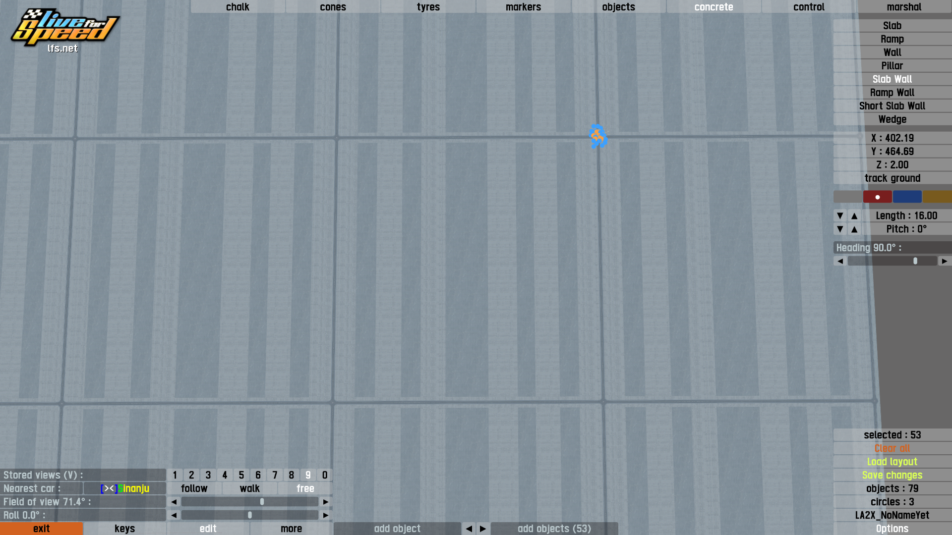 Problems with 'joining' walls together in a straight line is that in LFS you can turn objects in 256 increments to turn 360 degrees. Which means 1 turn = 1.40625 degrees. This makes it hard if you use the wrong angle to get the edges to meet up properly, and they can be slightly offset, so you don't get a nice straight line.
