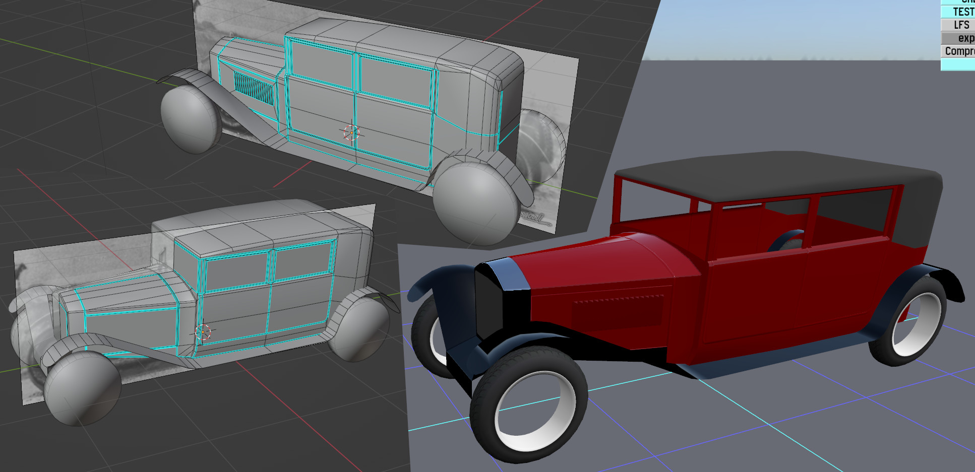 Progress: tuned physics. Started working on the rear and bottom of the model. The car is slow, but fun to drive. The suspension seems accurate, comfortable and quite bumpy on the limit as a real 1920s car. Wheel sizes had to be approximated, because LFS does not support such old tire ratios. The 20 inch wheel was approximated using a 21 inch wheel to preserve full diameter of the tire.