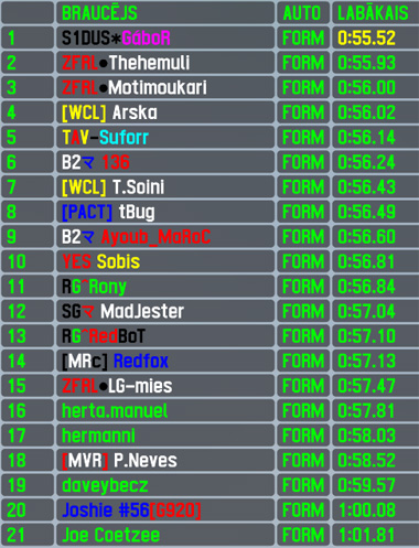 Gábor however was not influenced by lack of competition and extended his winning streak to 3 - that is his 2nd such streak with a chance to extend it to repeated his longest winning streak in 2 weeks. After leading the latest 34 laps of the 35 laps race,he picked up his 35th RTFR race win,taking also 29th pole position,31st fastest lap of the race (40th for Hungary) and 62nd top5 finish. Thehemuli set new personal best result in qualifying - 2nd place is a position better than his previous best,he had a great start and led the 1st lap of the race,which is his 1st led lap in RTFR,however had no arguments against polesitters pace and had to settle for 2nd place,repeating his best result in series,scoring his 11th top5 finish. Arska took the bottom step of podium in his 100th RTFR,rounding also his top5 count - to 30. Unite snoozed the qualifying and started from back of the grid,but still climbed up to 4th position in final results,scoring his 82nd top5 finish,driver with number in his name 136 closed the top5 for 2nd race in row,scoring his 3rd top5 finish in total.