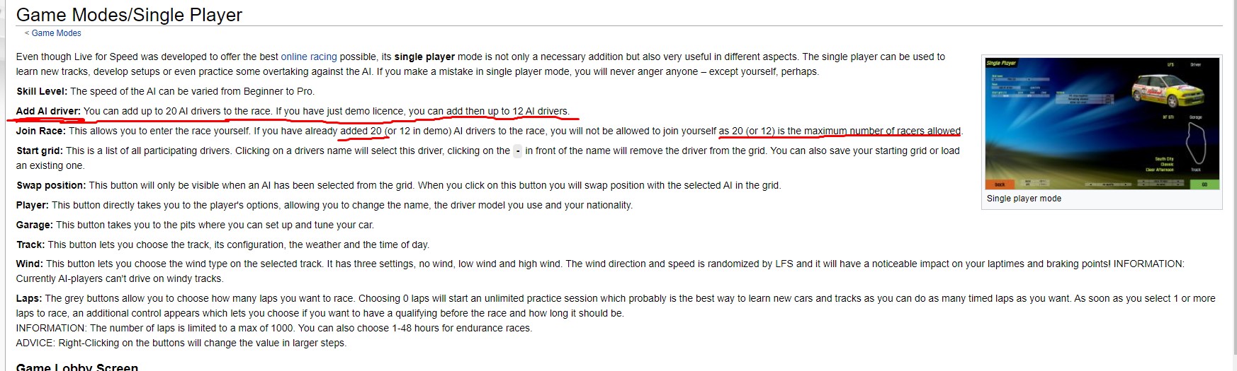 Thanks! What I fixed is the number of maximum AI cars in a single player race for S1+ modes, which is 32 currently (it was 20 and even 24 in the article, confusingly). For demo mode, as tankslacno described and also the article had it correctly, there can be a maximum of 12 AI cars (or 11 + you), so in this case there was nothing to fix in the manual.