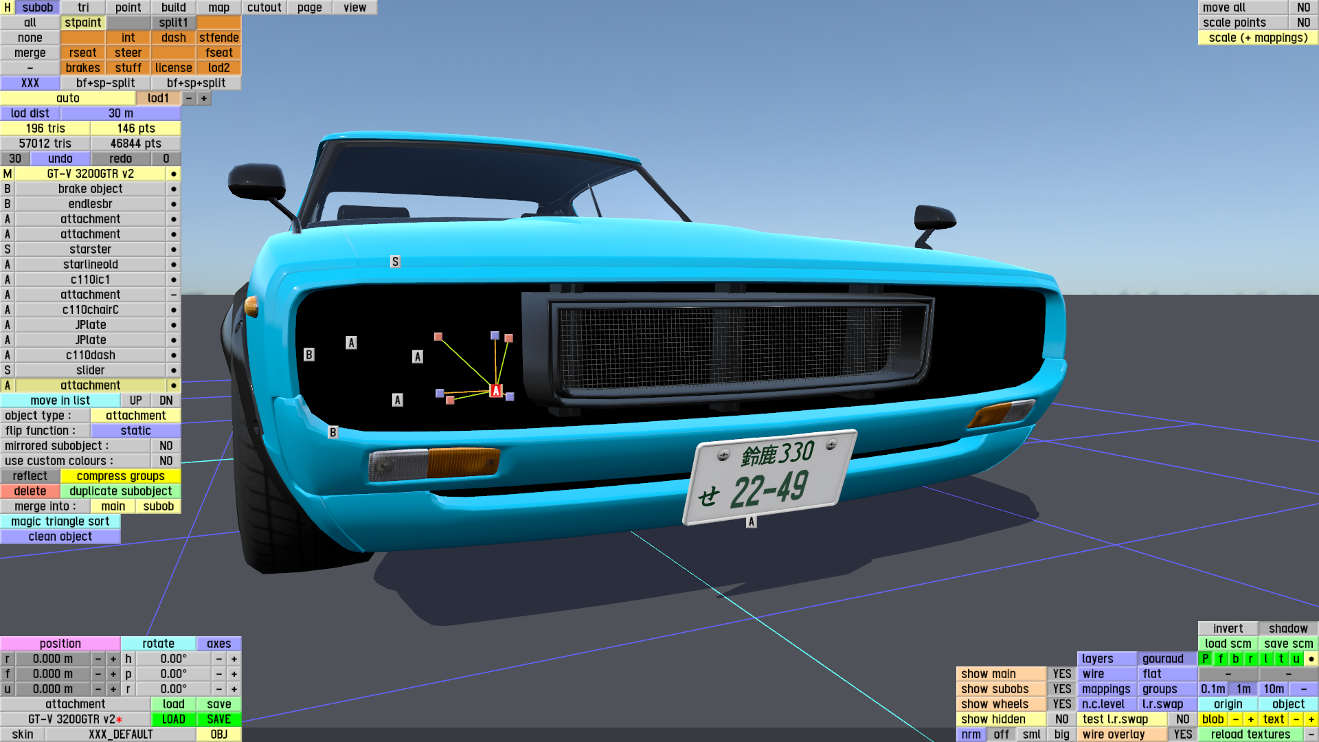 3D model is Martin Trafas' Nissan Skyline GT-R C110 Kenmeri '73. I downloaded model and unsubdivided it in blender & merged by distance in LFS Editor to make it fit in the tri-limit. All interior parts is modelled in blender with looking to real life and Gran Turismo's interior photos. This video really helped about reference: https://youtu.be/TgBlKRScTno?si=P2LV0blSZs_4ZoDV