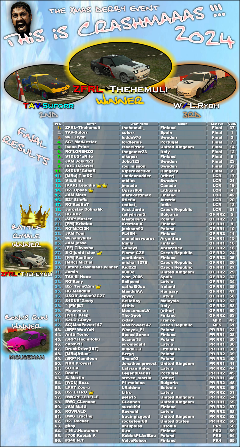The end of year is time for many traditions in many cultures. The simracing culture around the online racing simulator Live For Speed has one that goes back to year of 2011 - the year when the very first event of it's series took place on 26th december with 18 crashhappy people. 13 years later the number of crashhappy people rised up to 62,breaking records for non-endurance events attendance. So should we stop while we're at all time highs? Not happening - we're keeping the tradition alive until the last car has been recycled into tin cans,so for the 14th time...