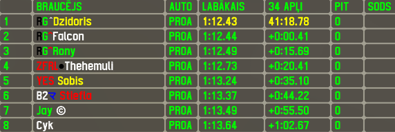 Despite the close finish,the 3-time AWS vice champion Dzidoris kept his leading position just slightly stressed as he led every single lap of the race - with this round the lithuanian scored his 9th pole position and 9th race win in AWS (both all time 2nd most),taking also the bonus point for fastest lap of the race. During the race he was closelly chased by his teammate Falcon,who repeated his best AWS race result - 2nd place finish. To make the clean podium sweep,3rd place was taken by Rony,who profited on his teammate's network failure just before starting last lap.