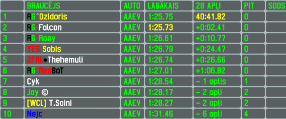 For 2nd time in row the best 2 drivers in qualifying were the Race Green Autosports teammates Dzidoris and Falcon - and both were again involved into fight for race win with difference from previous round as this time both led their share of laps. Winner of opening round led the first 14 laps before making a mistake that caused loss of race lead,however the lithuanian managed to pull himself together and erased gap to leader,using his opponent's mistake with 2 laps to go to return into lead,crossing the finish line first again to celebrate his 10th AWS race win,while his 10th pole position sets him in the tied leading position in all time pole positions count. The race was simply 2 laps too long for the canadian driver to score his 1st AWS race win,so he had to settle once again for 2nd place finish,but at least he was able to set the fastest lap of the race,earning an important bonus point. Also there are no changes in 3rd position in results - just like in round 1,Rony started from 4th position and finished 3rd,this time making a position on his own without other driver's network failure.