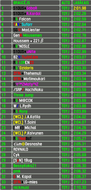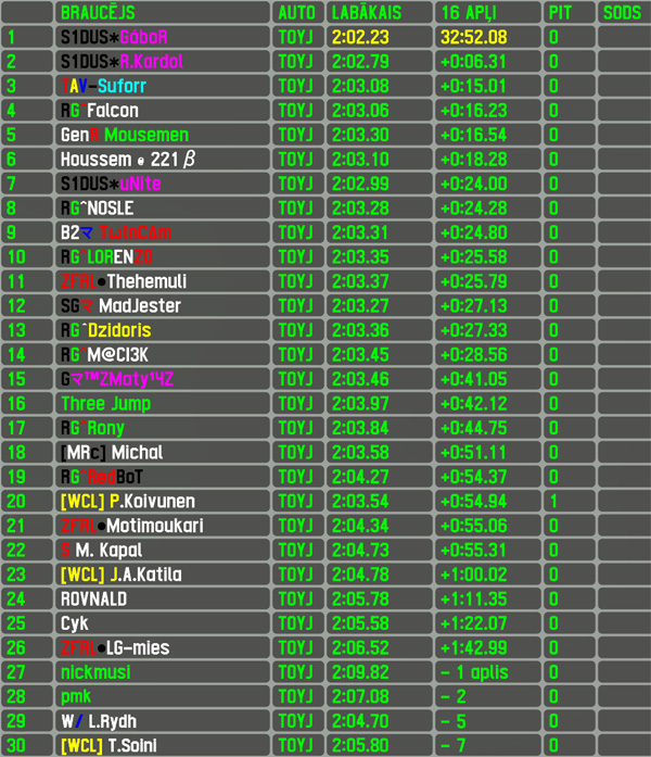 Different car,same winner - once again the driver with already most wins in RTFR was on top of the results tables in both sessions,including on top of the positions list whole race long. Gábor was the only driver to beat 2 minutes and 2 seconds mark in qualifying,earning himself the 36th pole position in his 100th RTFR qualifying. Leading all 16 laps gave him a total of 851 laps led in RTFR - that's just 1 less than all time leading count by Botsi. The win was Gábor's 39th,the fastest lap his 36th and the top5 finish - 72nd. Despite being the closest rival,R.Kardol was not really a competition for winner today,so he had to settle 2nd place finish,earning his 98th top5 finish,Suforr took the bottom step of the podium for the 1st time,adding the 3rd top5 finish besides one 4th and one 5th place finishes. Falcon joined RTFR for the first time for almost whole year and added 41st top5 finish to his stats by finishing 4th,closelly followed by another returnee (previous attendace was in 296th RTFR) Mousemen,who scored his 1st ever top5 finish in RTFR,improving his previous best result by a single position.