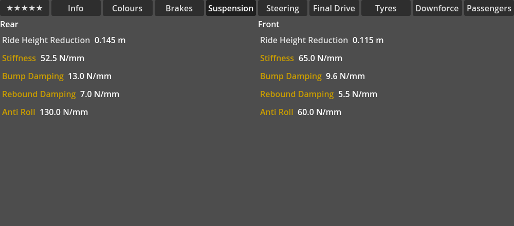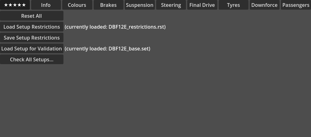 The GUI is mostly a reproduction of the setup tabs of the garage view so it's easy to find values. Each setting can be clicked to choose a restriction (unrestricted, fixed value, list of specific values, or allowed range). If the currently loaded setup has values falling out of the restrictions, those will be highlighted in red (restricted fields are highlighted in gold).