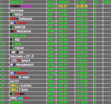 The lead in teams championship has been taken by inaugural season's champions RGA,who leads Sosiski Racing by 11 points and Team S1dus by 12. In nations championship there's an unexpected leader - nation that has been actually banned from most international competitions due certain military actions,closelly followed by race winner's nation Netherlands in 2nd position and defending 2-time champions Finland in 3rd. The constructors championship has been renamed to Best car award and is currently led by the winning car Nortz,which leads Acosta by 3 points and XRT by 5.