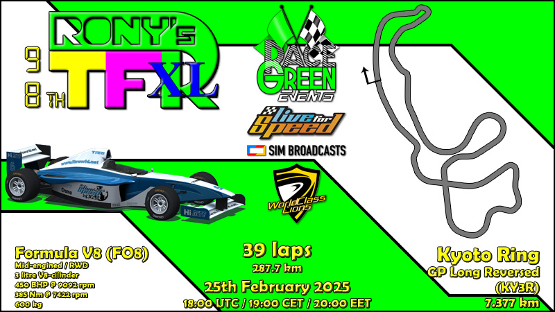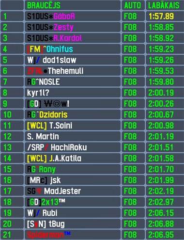 It's been a while since a high difficulty car was featured in RTFR XL,this week it was the 6 running of the fastest aids free standard LFS car Formula V8. There were few more powerful cars latelly,however with low weight the 450 horsepower single seater is known being quite a challenge and Kyoto's longest standard configuration in reversed direction added plenty of spice to this challenge. 21 drivers qualified for the race (repeated lowest in latest 5 races),all of them stood also on grid. 5 drivers retired from this race,interestingly all within laps 6 to 9 in the race - all others run until they saw chequered flag,10 best even after completing all 39 race laps.