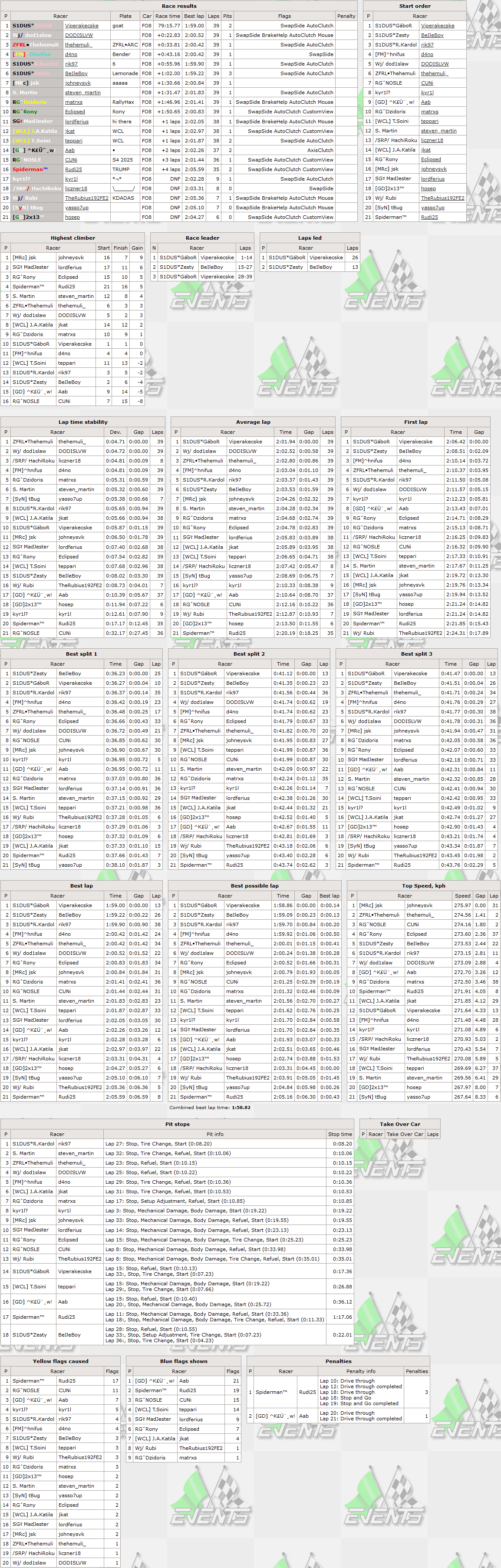 This race went into RTFR XL history as a driver managed to set a new all time record - for the first time ever a driver won more than 4 races in row. Gábor Was the fastest in qualifying by almost a second,scoring his 17th pole position and setting himself on path for the new record. The hungarian led the first 14 laps until his pitstop and regained the lead after his closest rival's pitstop,keeping it despite his 2nd visit of the pitlane - eventually everything was clear as Gábor crossed the finish line as race winner for the 5th time in row,15th overall,scoring also his 16th fastest lap of the race and 25th top5 finish. The combo selector used his selection to improve his best finishing result for the 2nd race in row - he finished 2nd this week,beating his last month's result by a position. The lowest step on podium was taken by fastest finn of this race - Thehemuli repeated his best position and added 6th top5 finish to his stats. Ohnifus scored his 3rd top5 finish by finishing 4th,top5 was closed by the only other driver with lead laps - Zesty scored his 5th top5 finish from 10 total race finishes,climbing a position in final results due his teammate's penalty.