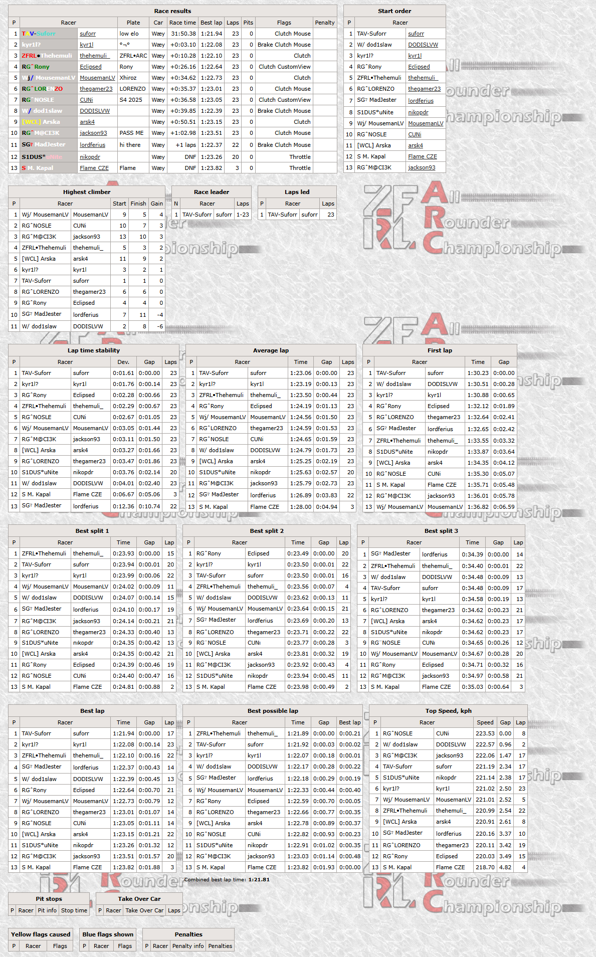 The race start was quite uneventful for the top five, as Thehemuli was the only one to lose positions, dropping down to fifth to eighth already before the first corner. On lap 2, Dodislaw made a costly mistake into the first chicane, hitting the tyre stacks and dropping down to dead last. This promoted Kyril to P2, who held it until the end while unable to catch the polesitter Suforr who went on to claim his first win in ARC. Thehemuli climbed his way back up the order to complete the podium, having an incident with the fourth place finisher Rony in the process. The incident was reviewed by the other organizing members, but nothing worth penalizing was found. Fifth to cross the finish line was