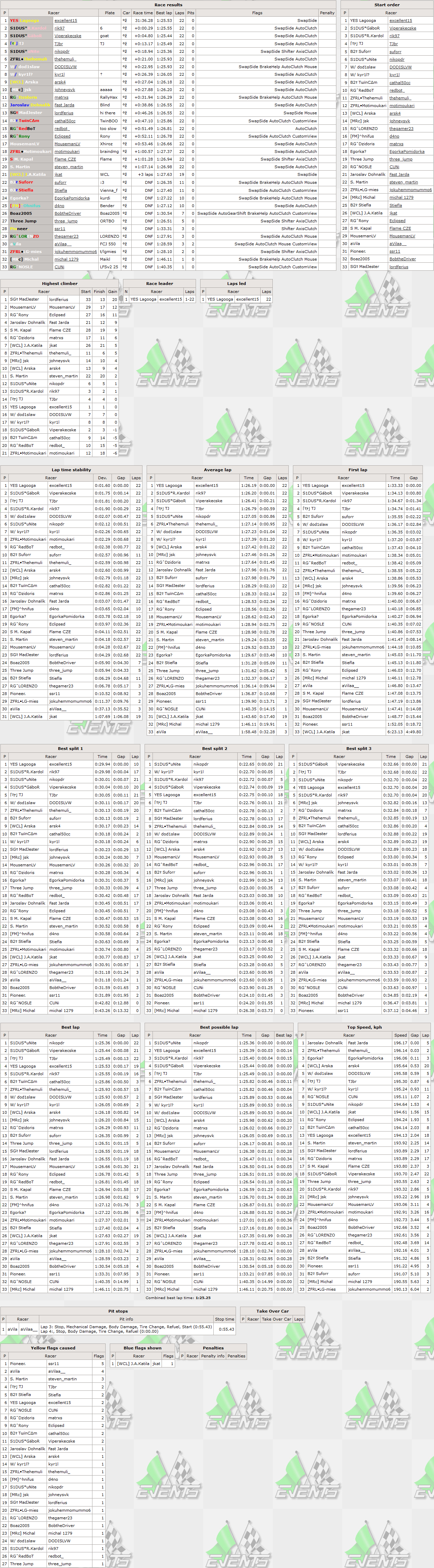 Lagooga wasn't attending RTFR for one year,but yesterday kept doing the same he did before the break - winning,as the lithuanian won both his last attended RTFR race and coincidentally also the last RTFR race in this same configuration (275th RTFR 3 years ago,running with LX6). Yesterday he was the one to beat,however his advantage was really small - he earned his 19th pole position (tied 4th most) with just 0.03s advantage and despite leading all 22 race laps (with that exceeding 200 laps led mark),he finished just 0.29 of a second in front of closest rival,still adding the 10th race win to his stats,while his top5 count now is exactly the double of wins - 20. R.Kardol qualified 3rd,but quite soon climbed up to 2nd position in race,eventually reducing leader's gap under 1 second,clocking the all time 16th closest finish 2 weeks after he was in front of 18th closest finish (now 19th). The all time top5 finishes leader added the 102nd top5 finish to his stats out of 120 overall race finishes. The 15 race rating and current season standings leader Gábor was very close to fastest laptime in both sessions,however could not pull the best out of this car and settled for 3rd place finish,scoring his 77th top5 finish. The brazilian TJ was 4th in both sessions to score his 14th top5 finish,Unite managed to steal the fastest lap of the race in last lap,scoring his 27th of those (still all time 3rd most),but finished just on tale end of top5 to add 94th of those to his stats.