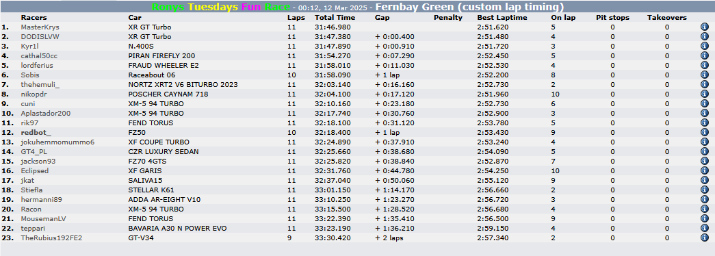 RB4 GT 20 31:09.480 + 1 lap 1:28.190