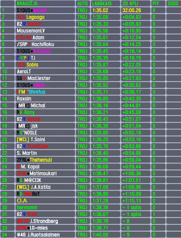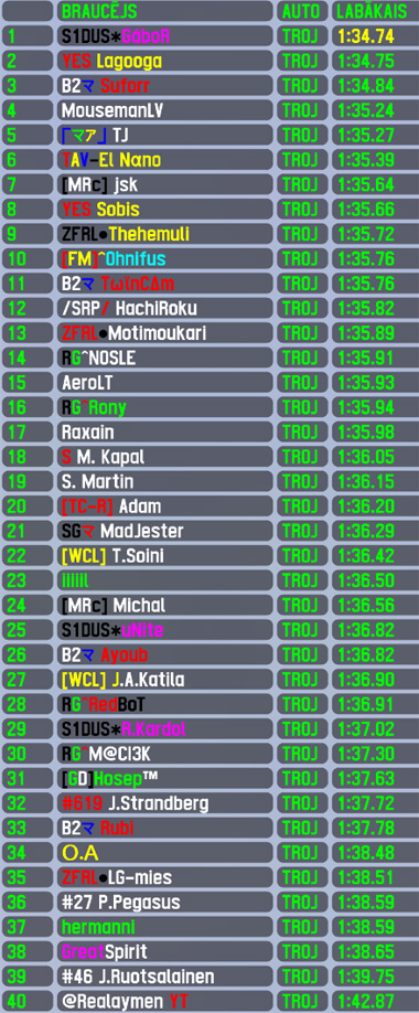 Late in qualifying session,Gábor found the missing few hundredths of second to beat the provisional polesitter by the smallest of margins possible in LFS - 0.01s,scoring his 40th RTFR pole position from 107 qualifying sessions. After a little shuffles with 2 drivers in the 1st lap,the hungarian settled in the leading position,keeping in for whole race to score his 42nd RTFR race win,taking also the 39th fastest lap and 79th top5 finish. Despite starting also from front row and leading few hundred meters in 1st lap,Lagooga had to work hard to regain his 2nd position - that's 22nd top5 finish in his stats. Also Suforr led the race for short while,but eventually could not follow the race leader and getting involved into struggle for 2nd position put him down to his original 3rd position,which is his 6th top5 finish. Also 4th place finisher MousemanLV finished in same position he started,improving his best result by a position with the 2nd top5 finish,Adam had a weak qualifying,but was able to climb up plenty of positions to finish on tale end of top5,which is his 7th of top5 finishes.