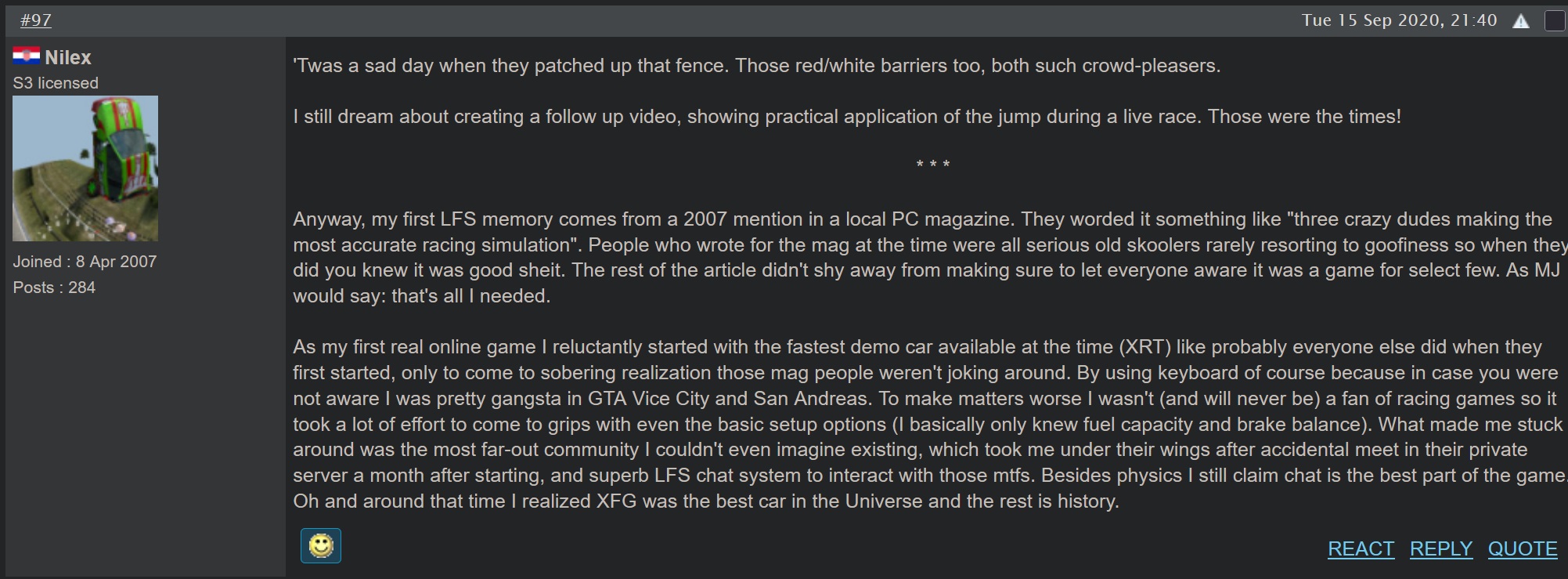 I still remember that day when I secretly dreamed of a racing game, but with more realism and so wandering around trying new names, I dreamed, until one day I accidentally watched a clip called Ototap, then something grabbed me so much that I wanted to find out more and more, from the clip itself you could see two cars entering the bend in slow motion, you could see the tires and suspension moving softly, from this clip I wanted more and more and so I started looking for the name of this game, not long after watching clips I understood the name, I also understood that this is not just a game but a simulator, when I understood the full name LFS Life for Speed, then I visited the site for the first time, I can not describe the joy I felt and reading the whole story about LFS that day and registered.
