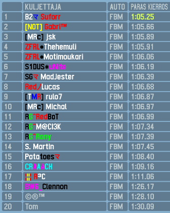 Fastest of the qualifiers was Suforr who scored his third ARC pole position. He was accompanied on the first row by Gabri. On the second row it was jsk in third and Thehemuli fourth, only 0.02s behind. Motimoukari completed the top five being the last driver to set a lap below 1:06.