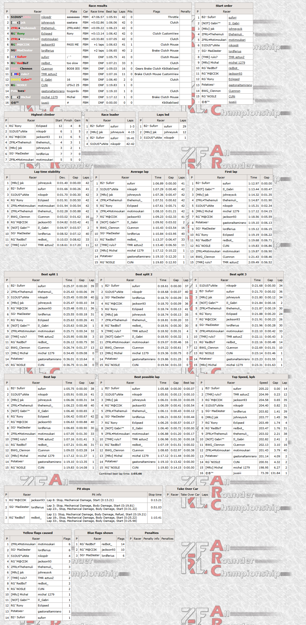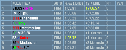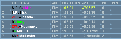 For the top five the start was quite uneventful with the only position change being uNite claiming fifth from Motimoukari, who would go on to clash with Madjester later in the lap causing them to tumble down the order. Gabri was giving Suforr some pressure, but folded himself at the start of lap 3 and retiring after a hard contact with the walls. It looked like Suforr would cruise away for an easy victory, but he decided to perform a drive-through of the pitlane on lap 3 which made him drop to P4. The new leading trio of jsk, Thehemuli and uNite were 5 seconds clear of Suforr who begun to slowly chip away on their lead. uNite was the first to fall due to his own mistake, dropping to P4 after a spin. Thehemuli was caught and overtaken by Suforr on lap 14 and jsk fell victim to a similar move only two laps later. Thehemuli also overtook jsk on lap 16 and held P2 firmly before spinning on lap 22 and falling down to P5, promoting Rony to P4. Meanwhile uNite had passed jsk for P2, but he would lose it back on lap 33 after a mistake in T1. jsk obviously felt bad and returned the favor by making a similar mistake on lap 39 switching the positions back to previous. After that the top five looked set, but on the last lap disaster struck: Suforr lost connection only 30 seconds before he would cross the finish line and timed out. This gifted the win to uNite who takes his third win in ARC. jsk was second with Thehemuli completing the podium. Rony was fourth and Motimoukari held it together after lap 1 incident and made a solid comeback form P13 to fifth.