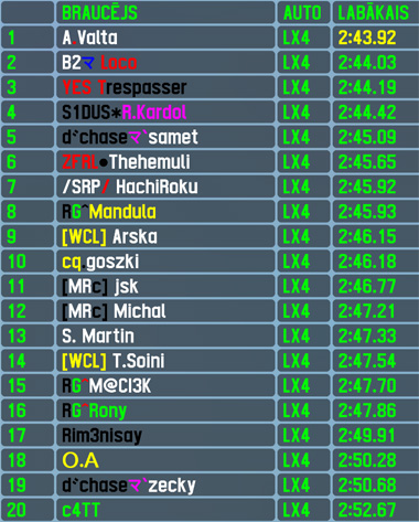 Last race featured the slowest default LFS car,4 weeks later we raised the speeds by quite a lot by losing weight and adding power - the ideologic sibling of Catherham was featured in latest RTFR XL race. LX4 however is the slower of the 2 LX cars as it has "just" 140 horsepower,but with dry weight just a kilogram under half ton it's still in the quicker half of LFS street legal cars,especially in twisty circuits like the one we run this week. Standard Fern Bay Black in reversed direction was the venue for previous LX4 race in RTFR XL,this time we run pretty much same track but differently mixxed,which resulted in longer back straight and very tricky first turns section. With just 20 drivers qualifying,this was already under all time average attendance numbers,but competition for most positions was still very alive.