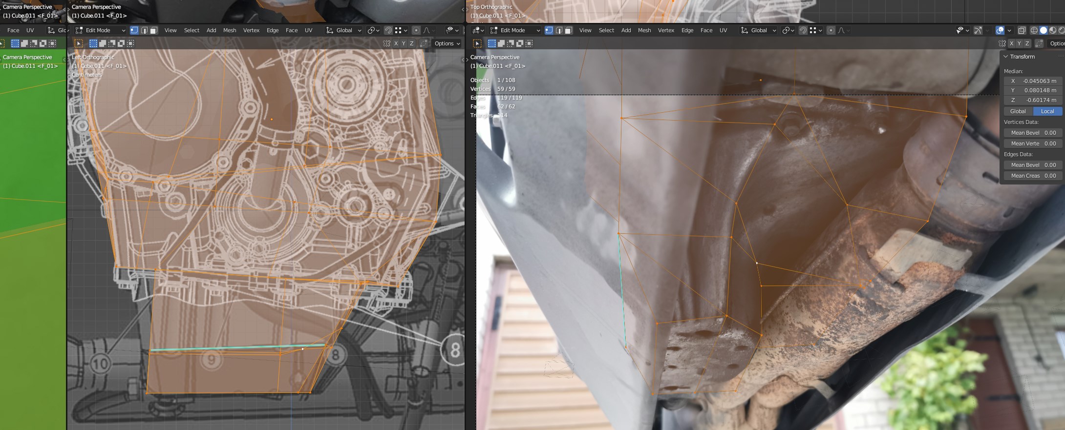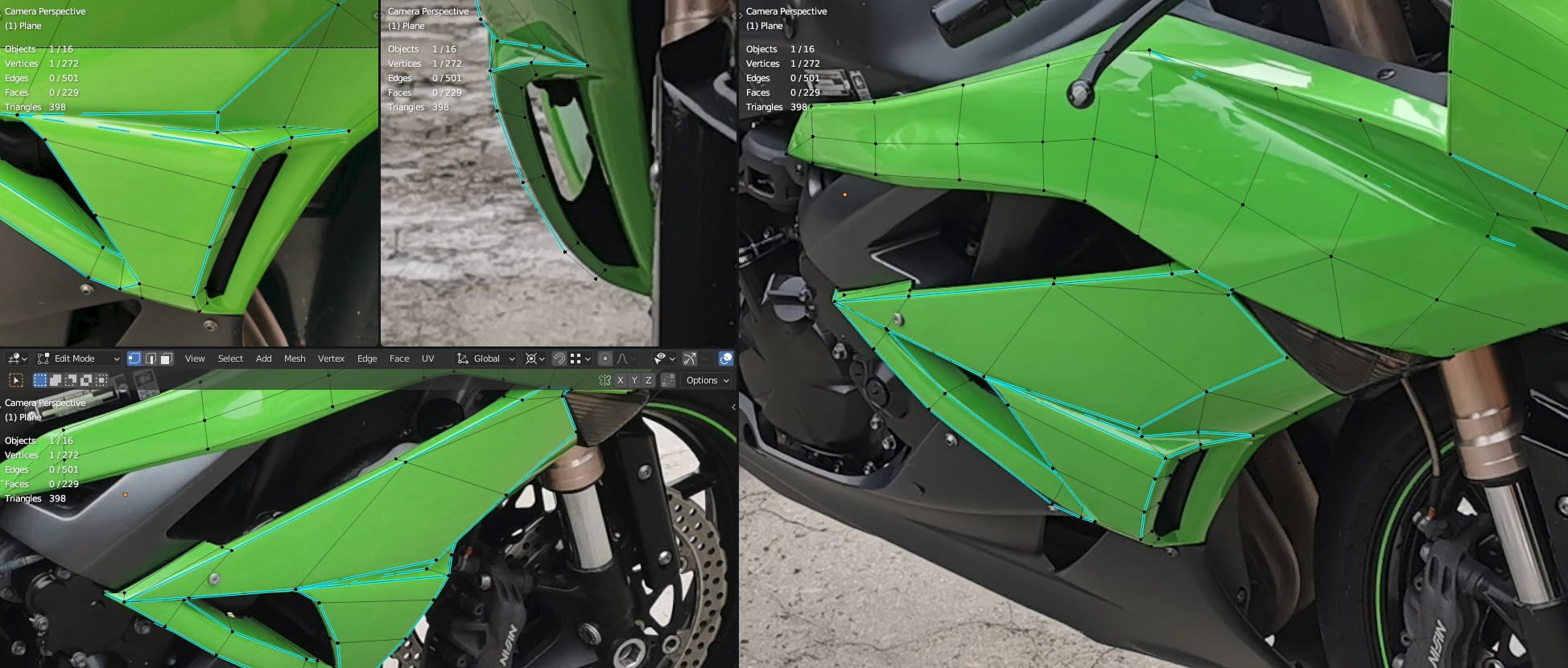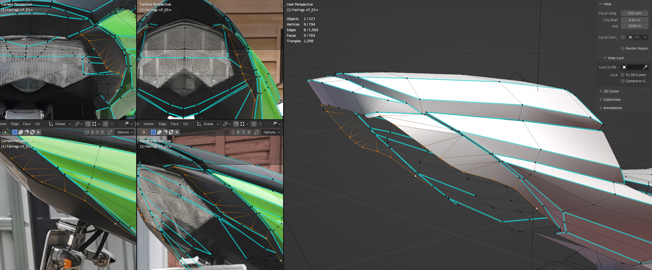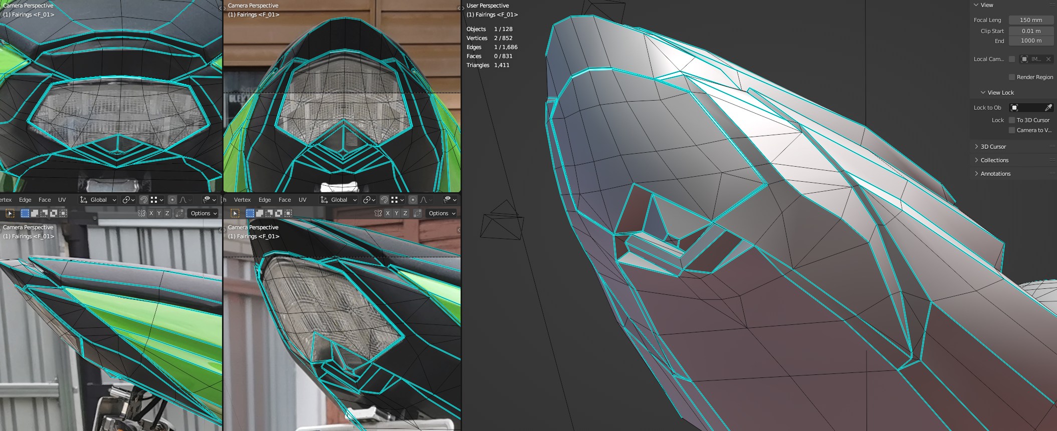Then using multiple camera views i started modeling the shape of the front fenders as generated mesh quality was quite bad in some places. Its good enough in few areas that aren't shiny but overall it was better to use camera views for more accurate modelling process.