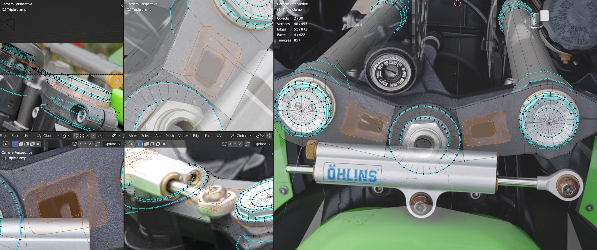 Modeled steering damper, continued on triple clamp model, improved top of the forks with a more detailed model
