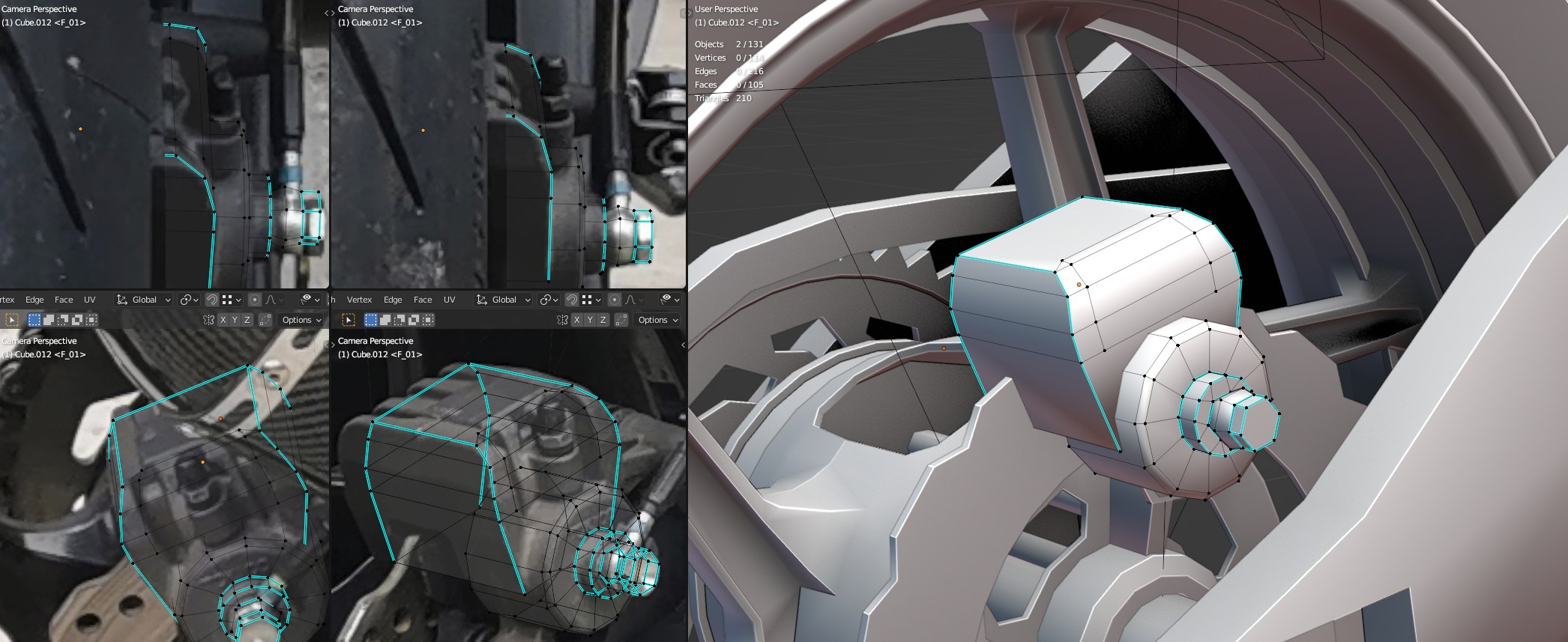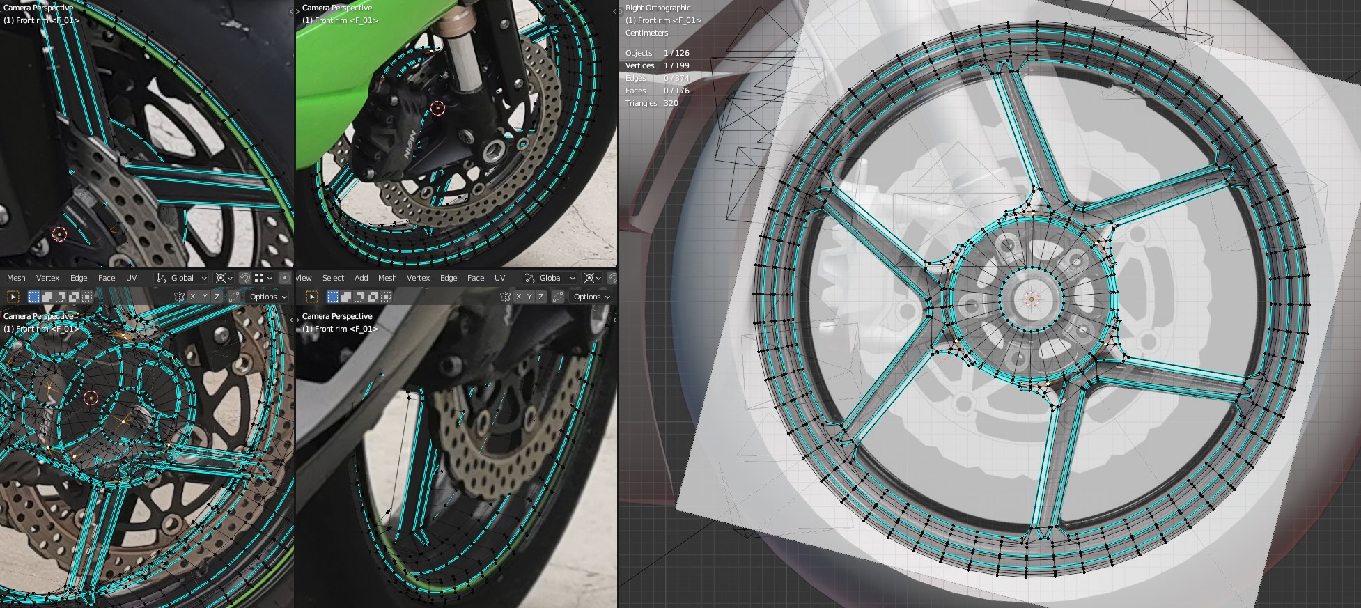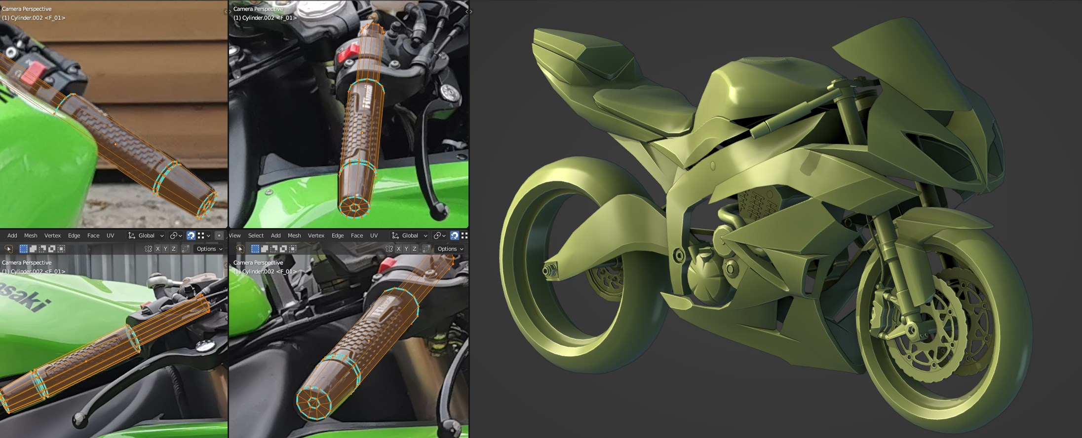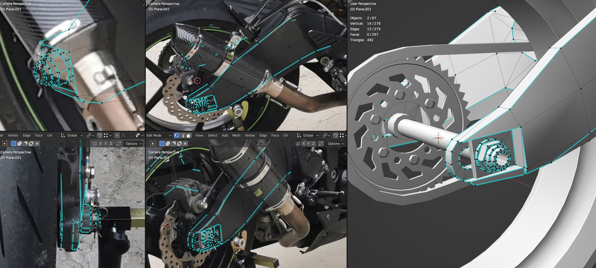 The way i started modeling my bike was that i took a lot of photos from all sides (over 500) and then used a photogrammetry software to make a rought model out of them. Then exported the mesh with cameras into blender.