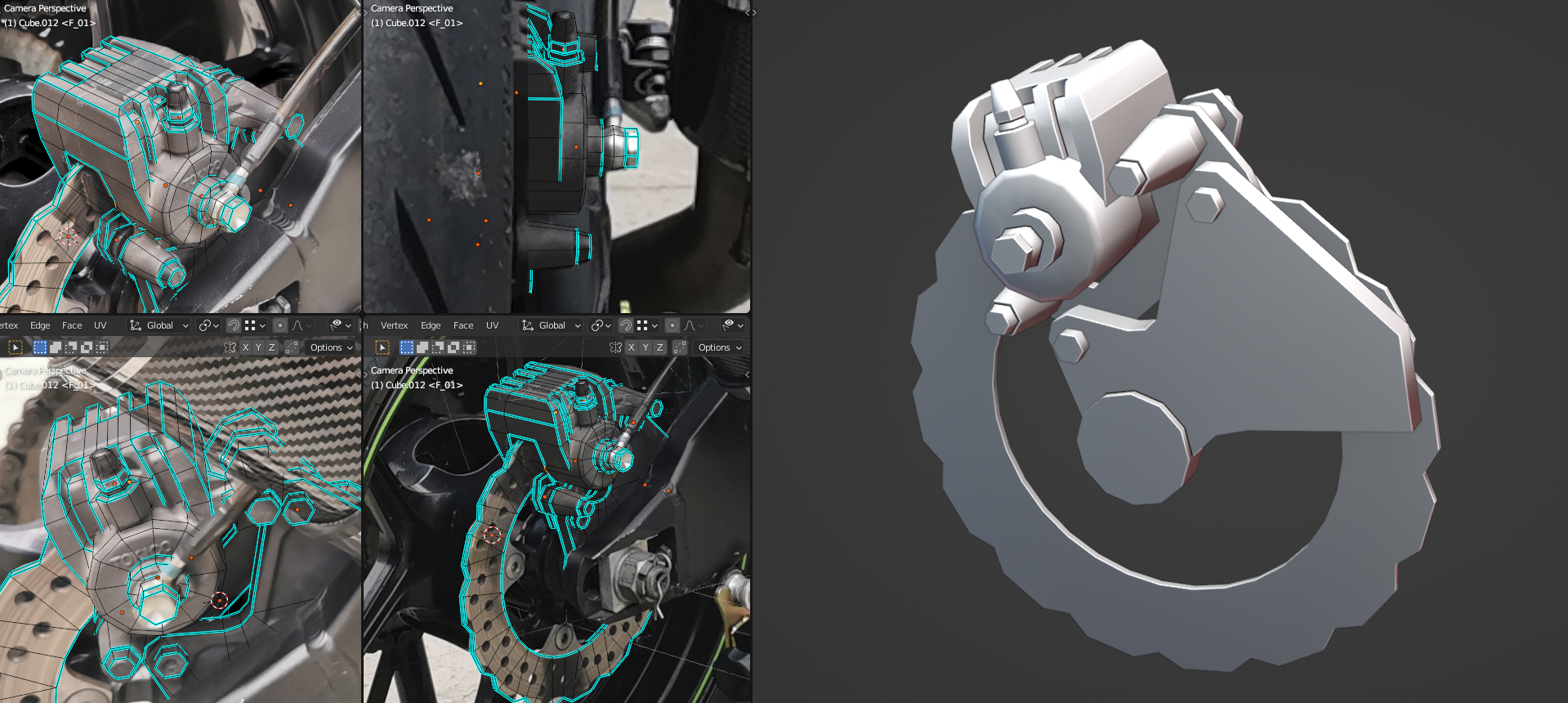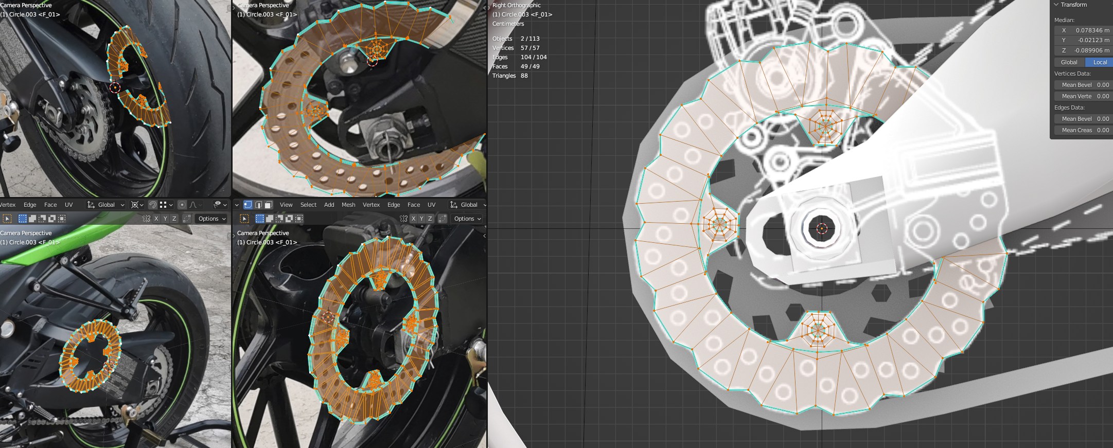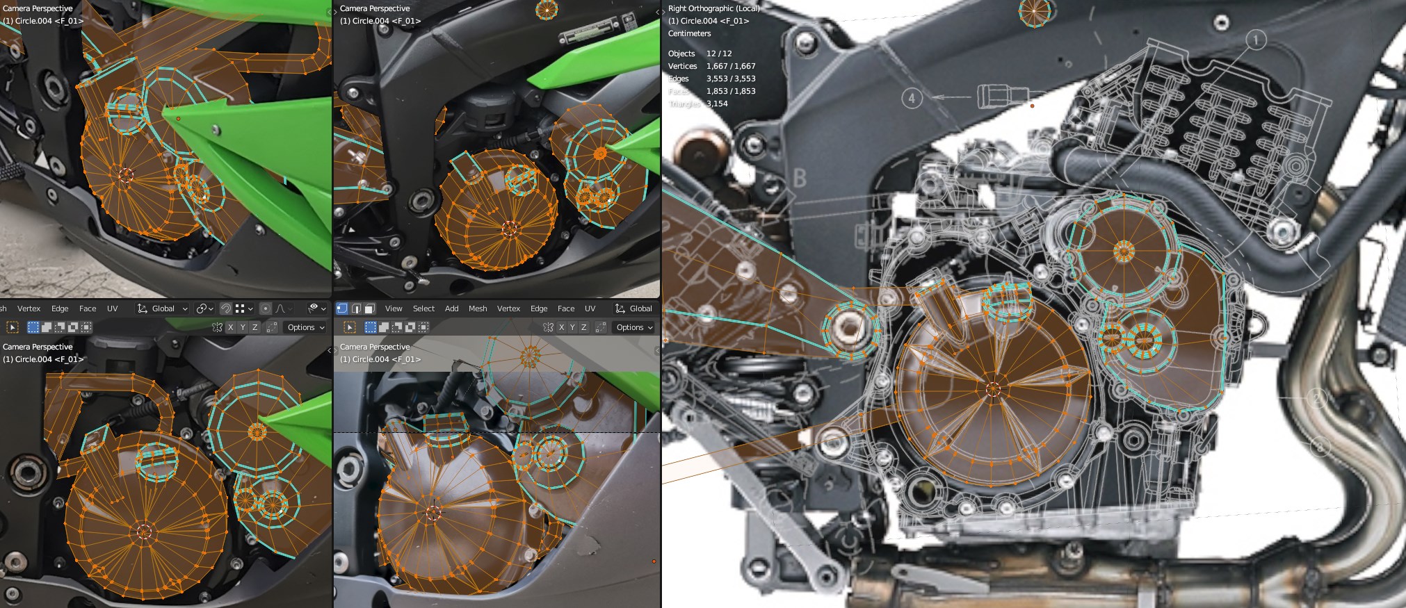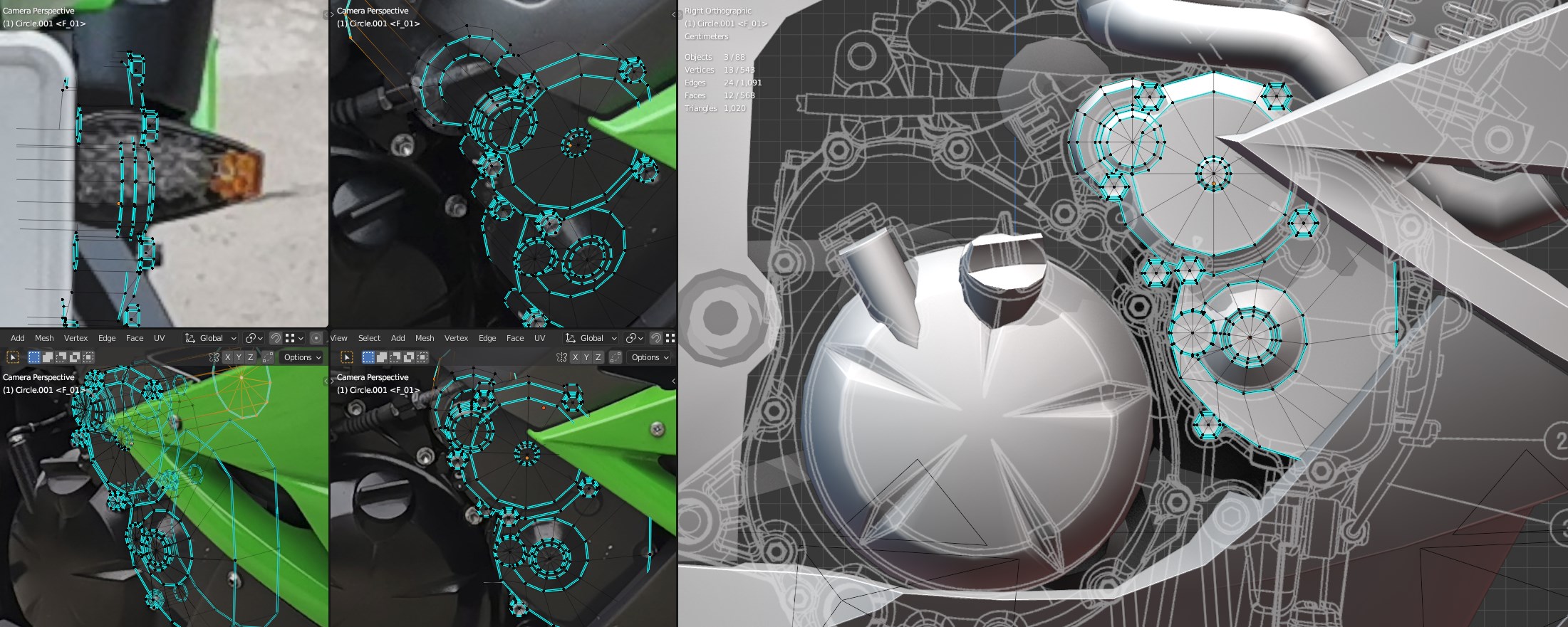 The way i started modeling my bike was that i took a lot of photos from all sides (over 500) and then used a photogrammetry software to make a rought model out of them. Then exported the mesh with cameras into blender.
