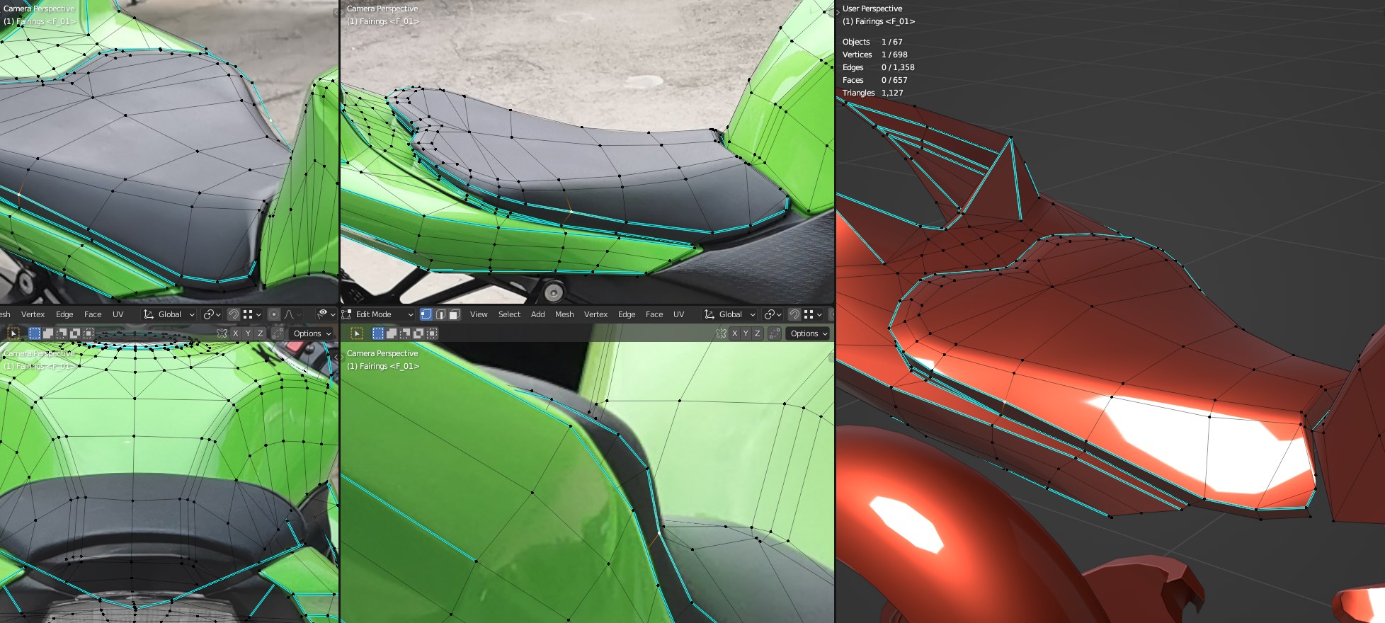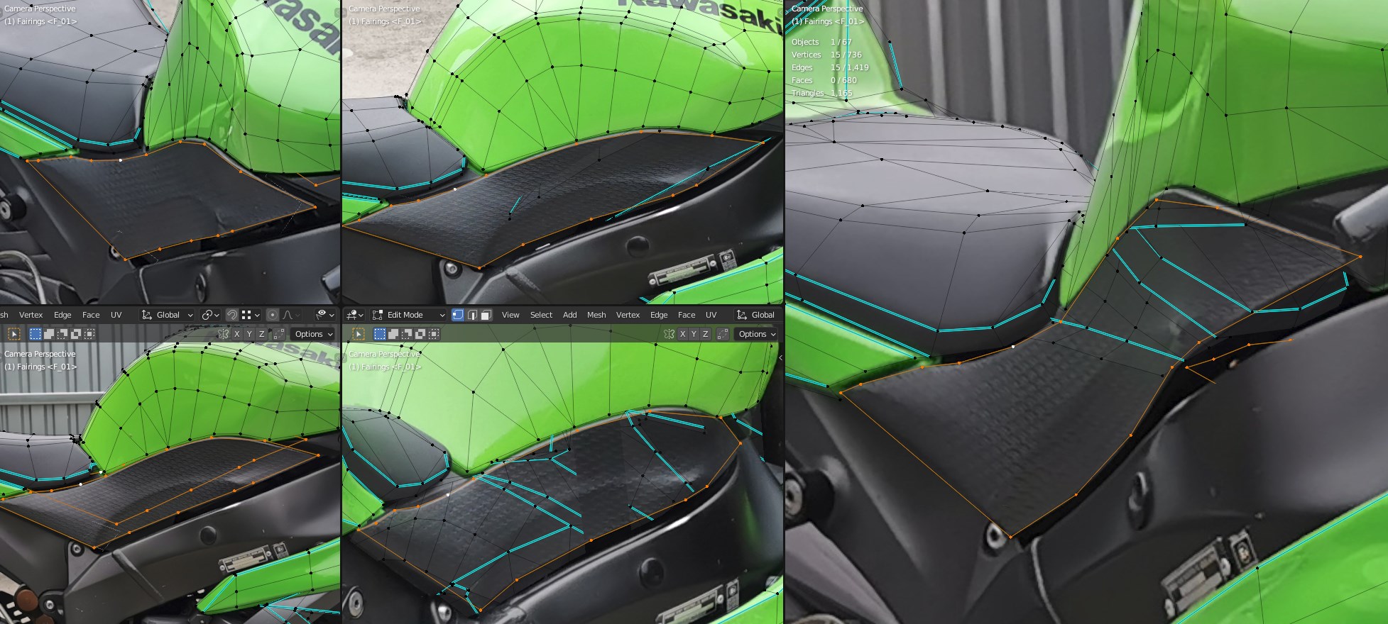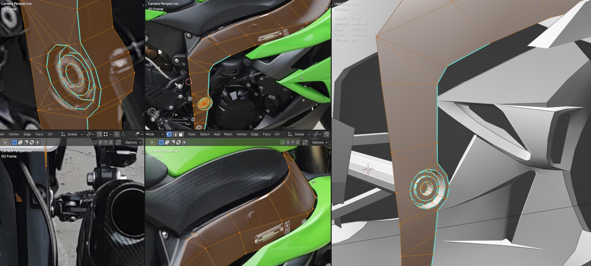 After that, worked a bit on tail section, side fairings and gas tank to make a rough shapes that will be polished later on. Some cameras were a bit off in few places but i tried to use the ones that matched the best. Still considering my previous bike models, this one probably is the most accurate