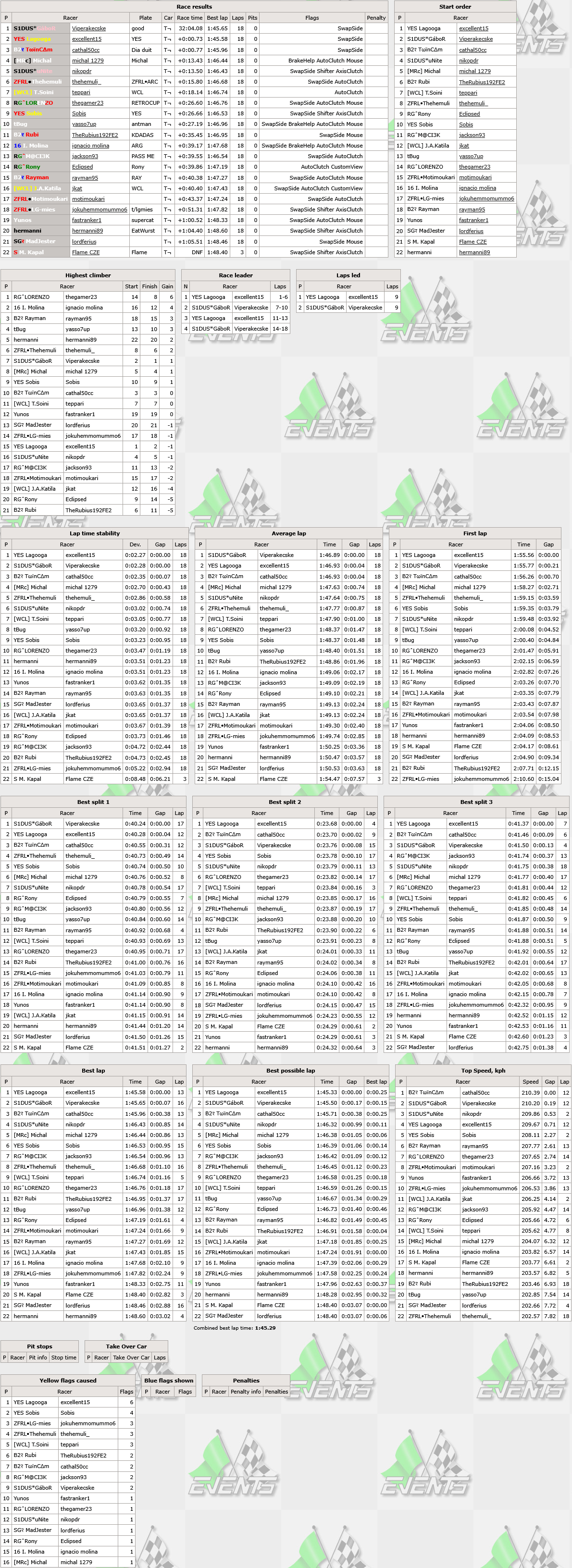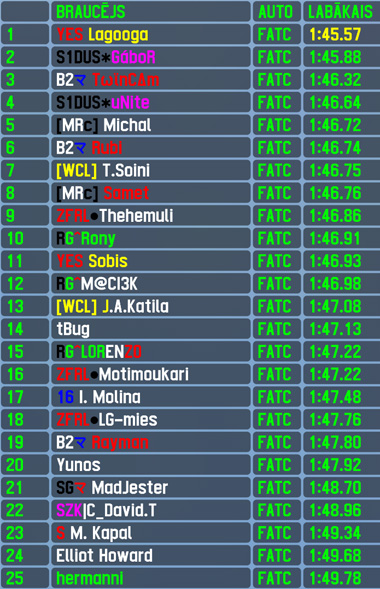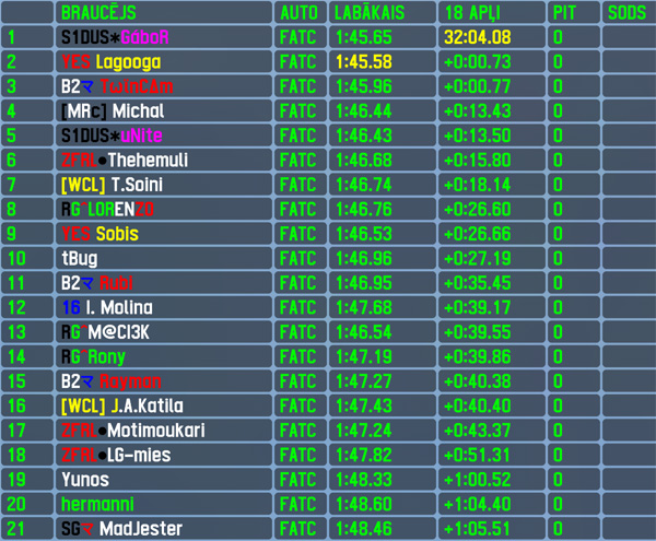 When looking from certain point,this race went into history as the race noone wanted to win - top3 drivers all were coasting over finish line in badly made "formation flight",destroying all the intrigue for win,even the race was pretty much decided. For the 3rd race in row Gábor put his name on top of finish results,scoring his 47th RTFR race win and starting his 4th winning streak with 3 or more race wins,additionally adding 85th top5 finish to his stats. In terms of single laptime,the fastest driver of the day was Lagooga,who during race almost repeated his track record he set in qualifying - the pole position he scored was his 20th,breaking the tie for 4th most,while the fastest lap of the race was his 9th and top5 finish - his 23rd. If both leaders split the lead laps in half between themselves,the closest follower Twincam was right behind them all the race long,but never really passed them,settling himself for 3rd place finish,which is a repeat of his best race result in the series and 8th top5 finish. At least the battle for 4th place finish was proper until the finish line - Michal was able to hold off the charging oponent and finish 4th for 2nd race in row to score his 16th top5 finish and 4th in last 8 races. Unite lost a position between start and finish and despite all tries could not regain it,so the finn settled for 5th place finish,which is his 99th - just 1 to go to become 2nd driver with 100.