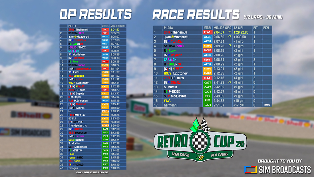 Out of the 40 starting drivers, only 17 managed to reach the chequered flag safely, that was a tough day for the Retro Drivers out there!