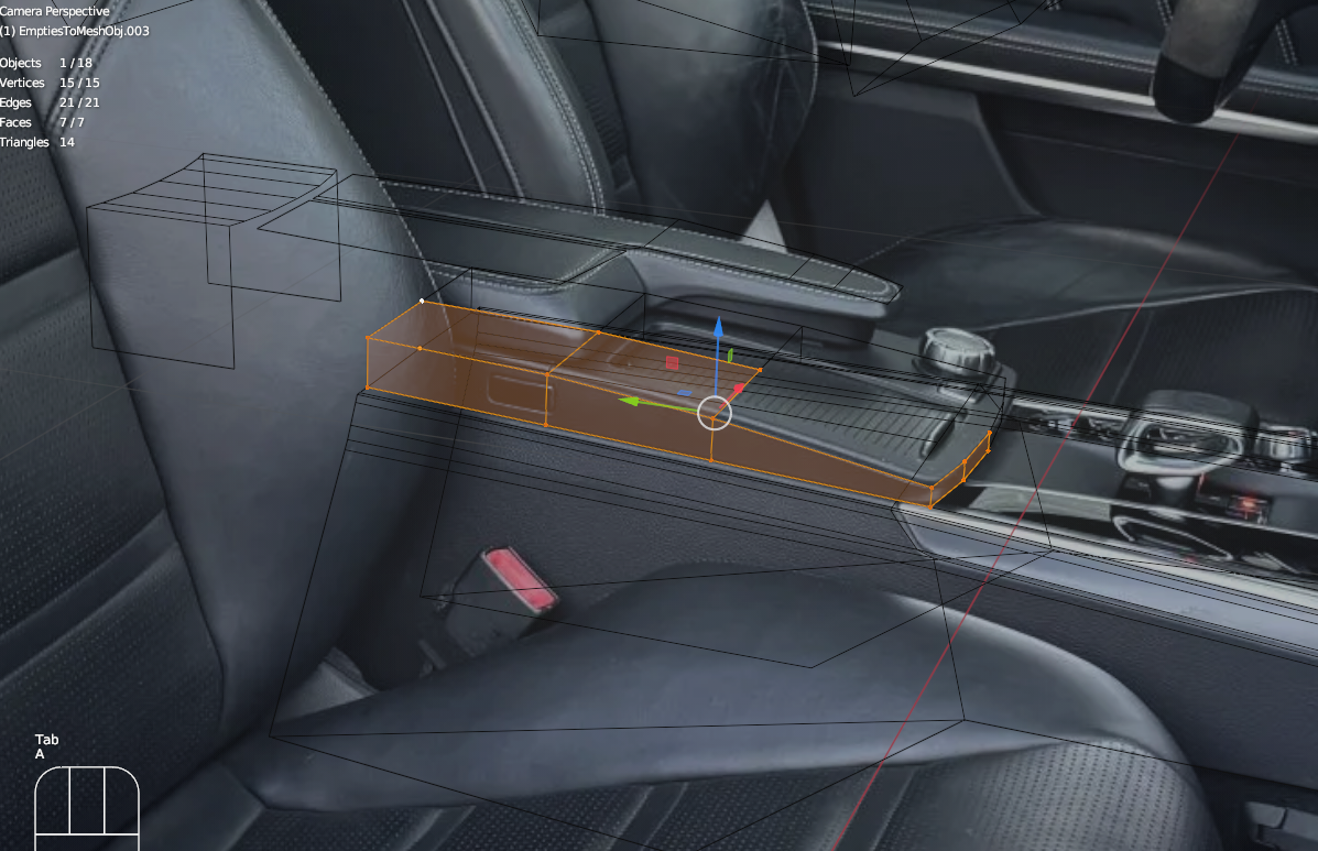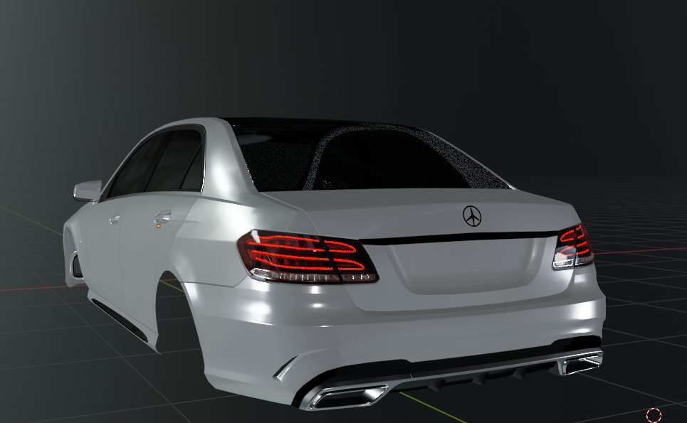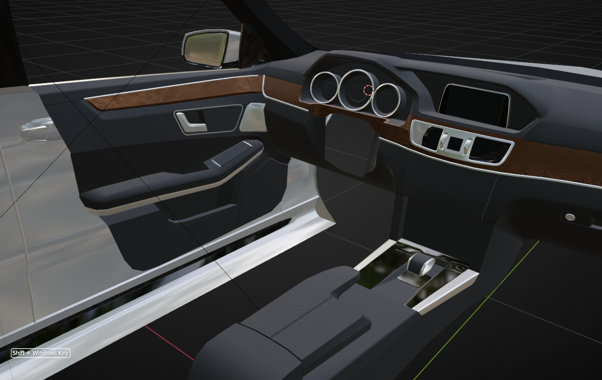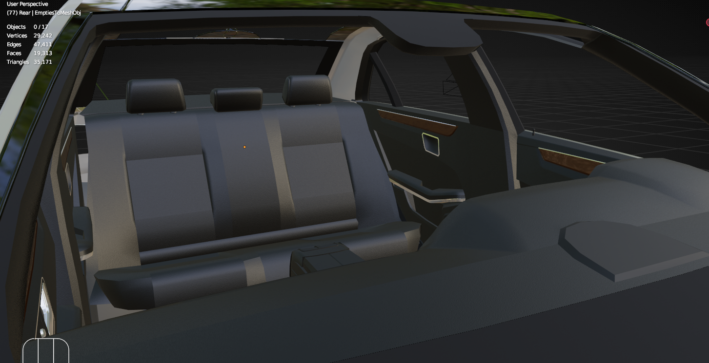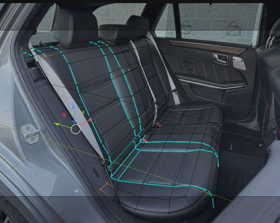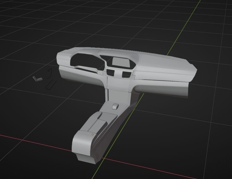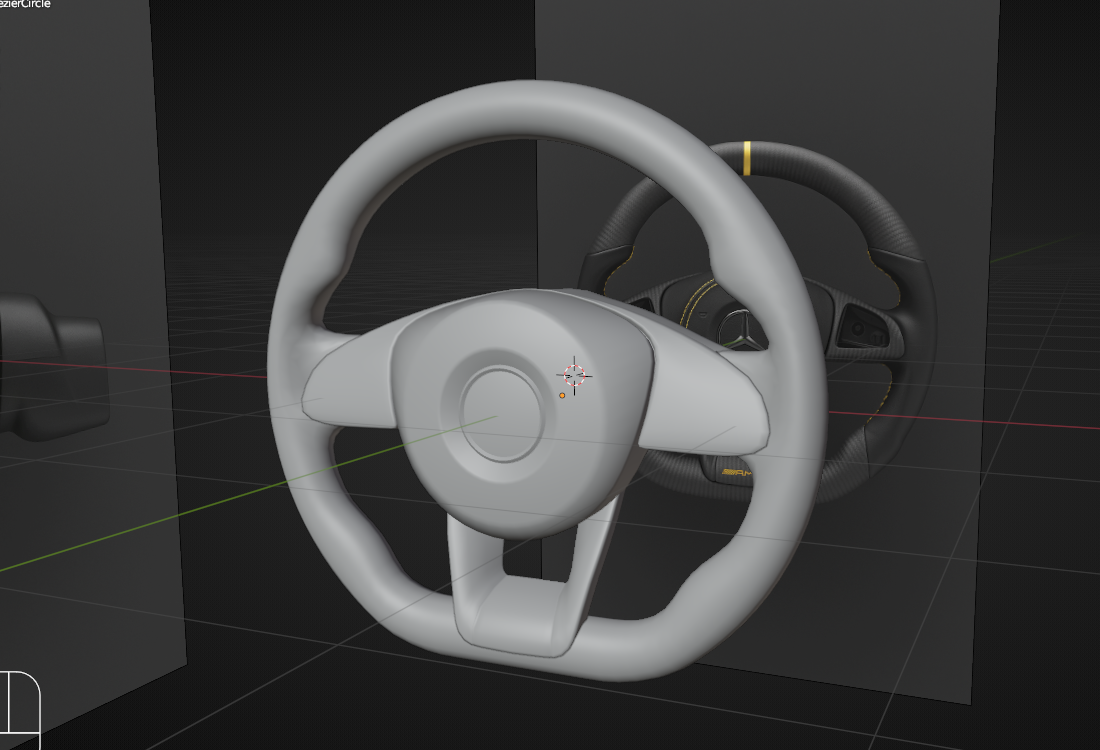 The interior was modeled similarly to the car body. I used ImageModeler to calibrate the photos, set up the scene in Blender, and modeled based on multiple image angles. The steering wheel, however, was modeled from a front-facing image that ChatGPT helped recreate from a 45-degree reference of the wheel I wanted.
