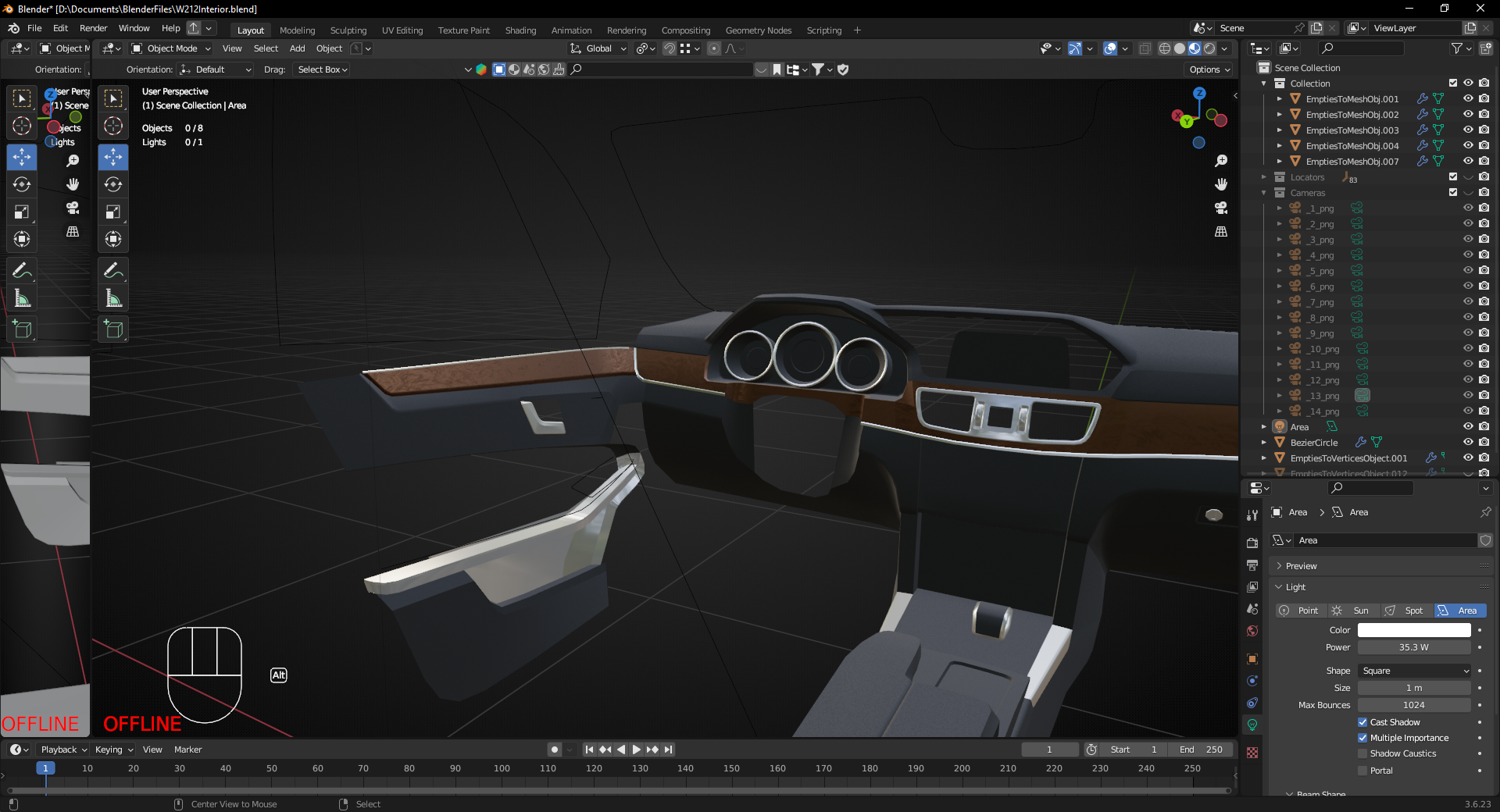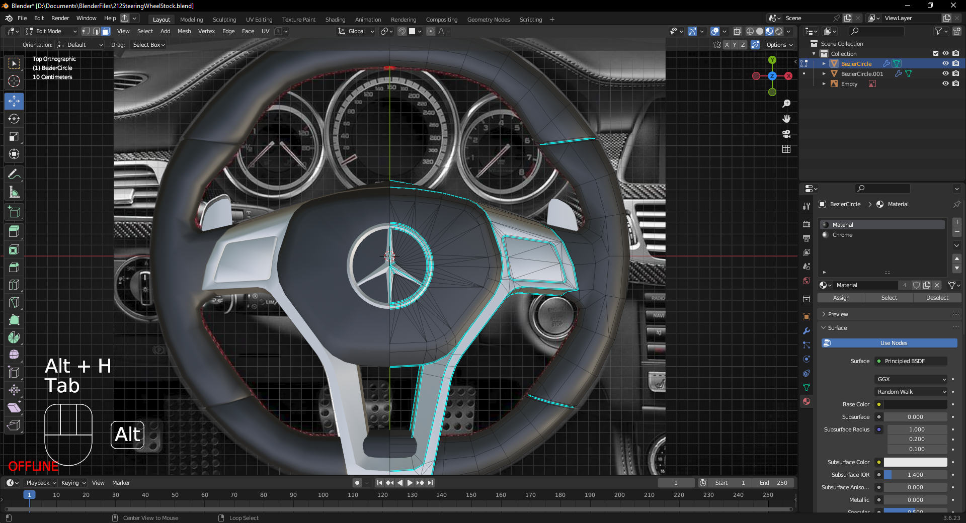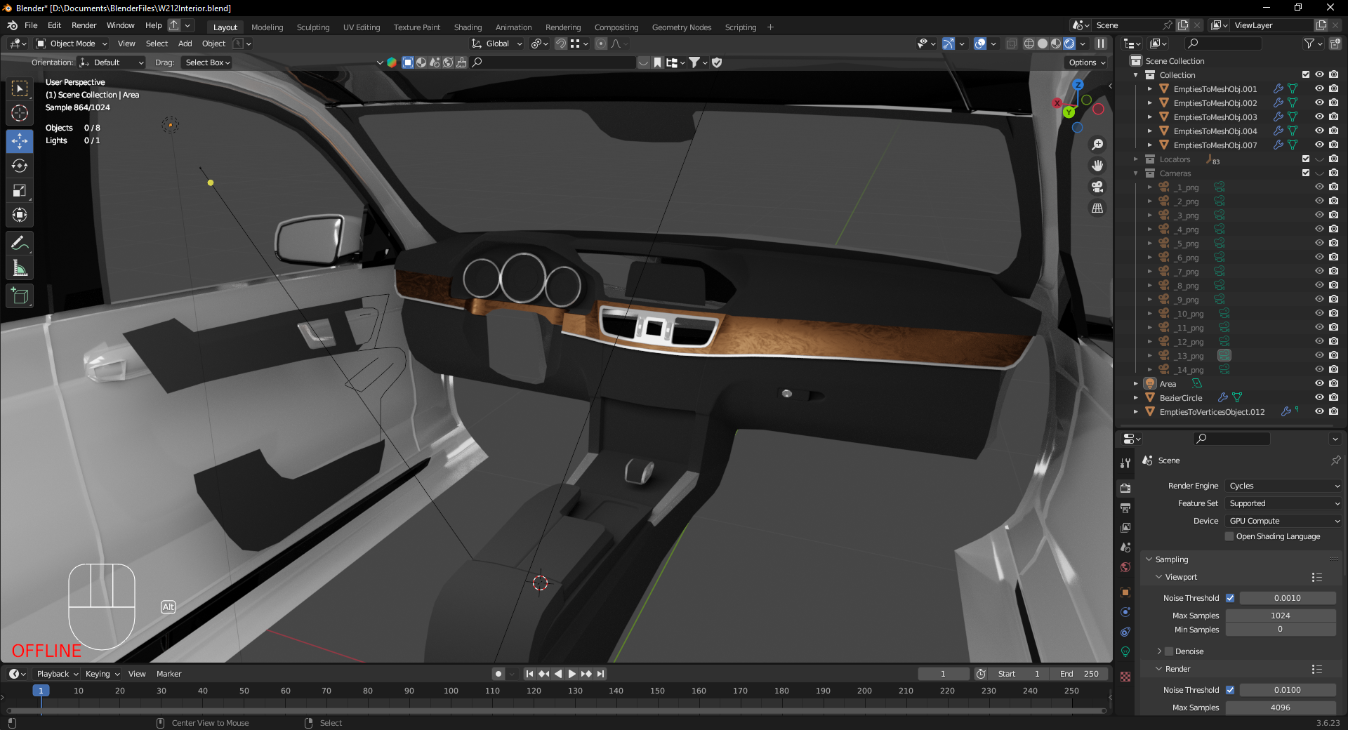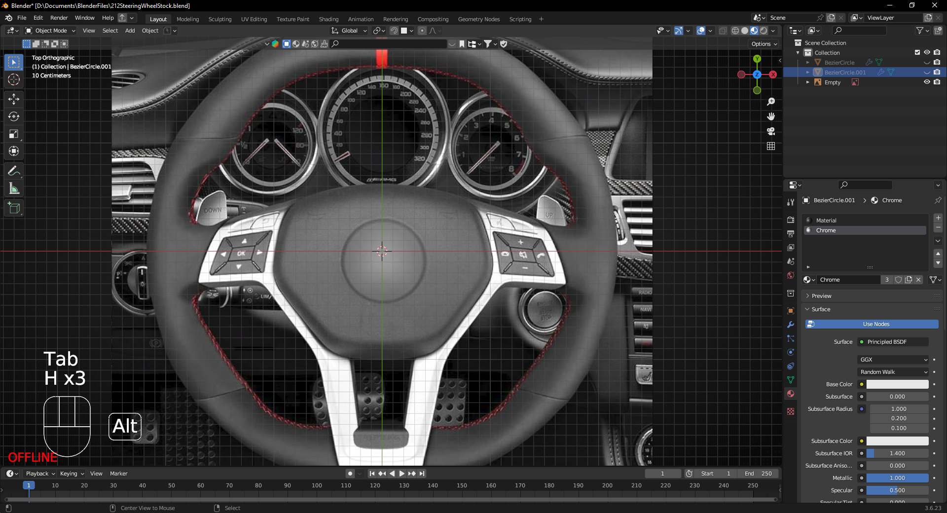The interior was modeled similarly to the car body. I used ImageModeler to calibrate the photos, set up the scene in Blender, and modeled based on multiple image angles. The steering wheel, however, was modeled from a front-facing image that ChatGPT helped recreate from a 45-degree reference of the wheel I wanted.