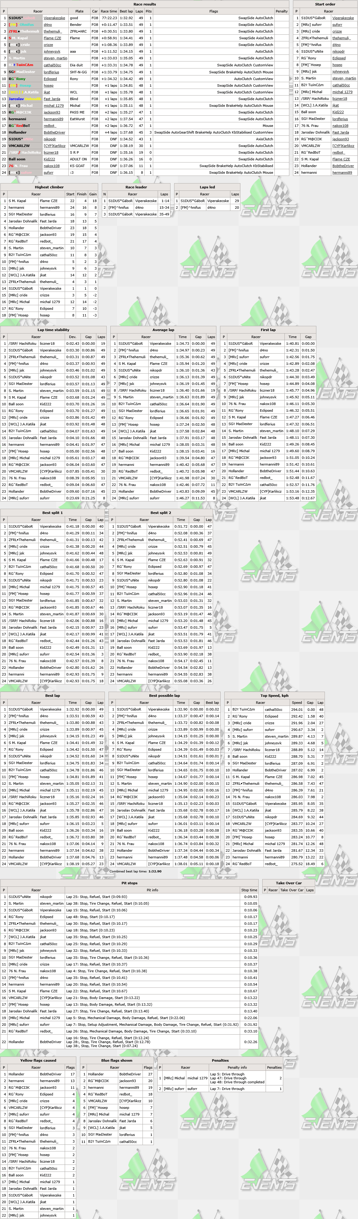 No changes in the winning front compared between this and previous race - Gábor used the combo he selected himself to put his name on top of the day's results once again. In qualifying he was more than half second faster than the best of the rest,scoring his 19th pole position,also in race he set the fastest lap by over half a second which is also his 19th and 23rd for Hungary,tying Lithuania for 2nd most. He crossed finish line 11 seconds ahead of the other driver with lead laps during the race to score his 19th RTFR XL race win and 30th top5 finish. Ohnifus qualified 5th,but progressed up to make this his best RTFR XL performance - he led his first 20 laps in the event series and finished 2nd to score his and also Czechia's best finishing result,improving both by a single position,which is his 5th top5 finish. After 3 5th place finishes in row,Thehemuli had a better race this time to finish 3rd,extending his top5 streak to 4 and total count to 11. Also the other czech driver in top5 scored his best finishing result in RTFR XL - in previous 8 races,M.Kapal was able to score 7th as best result,this week he improved that to 4th. 4 weeks after making his debut in RTFR XL,Cride jumped into top5 finishers list - the finn qualified 3rd,which is 3 positions better than last month,while his 5th place finish is 4 positions better.