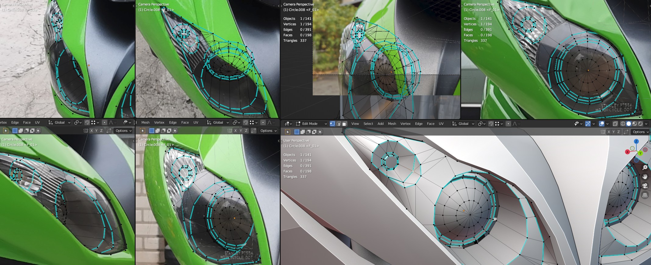 Then using multiple camera views i started modeling the shape of the front fenders as generated mesh quality was quite bad in some places. Its good enough in few areas that aren't shiny but overall it was better to use camera views for more accurate modelling process.