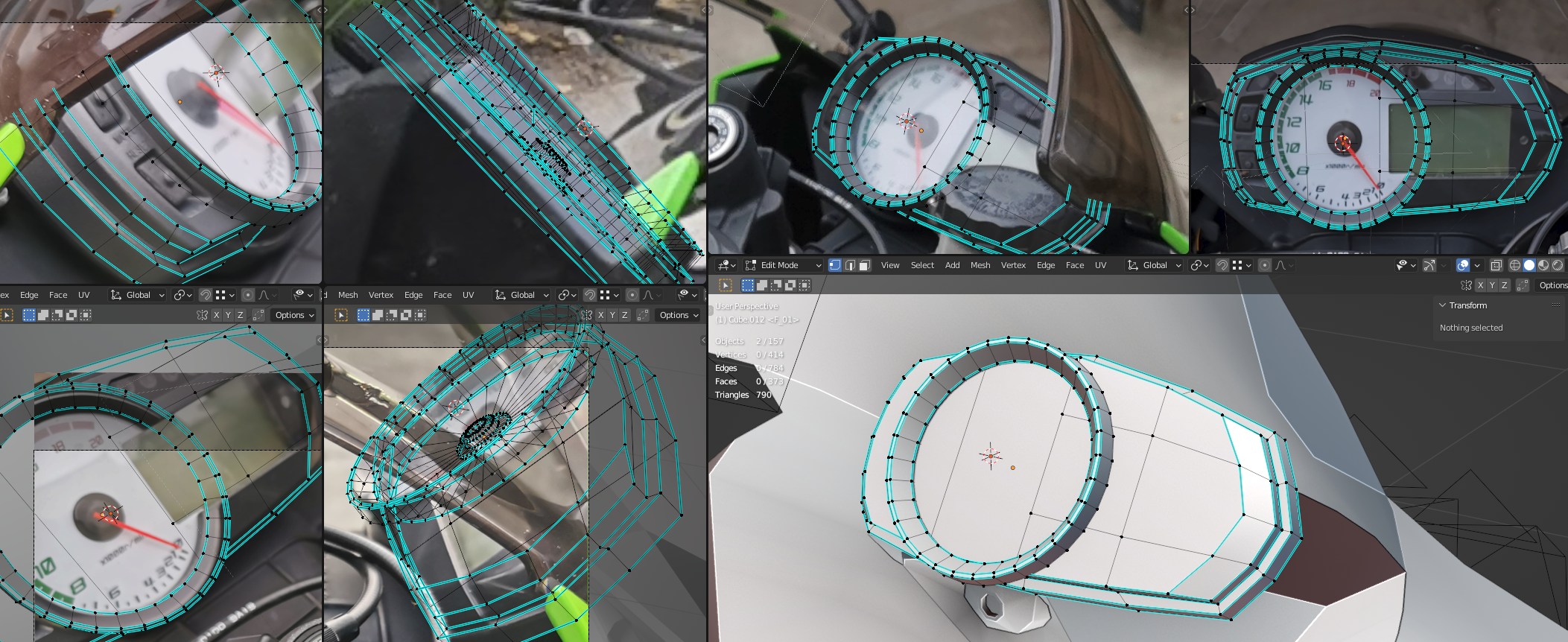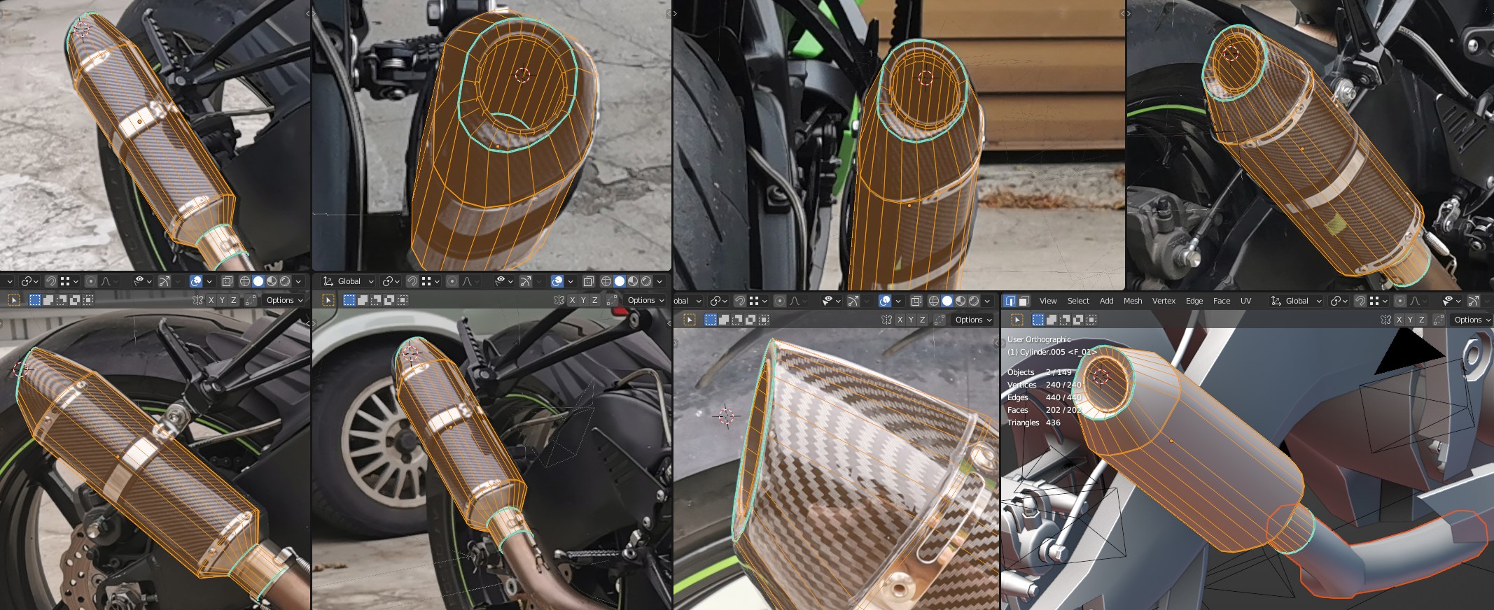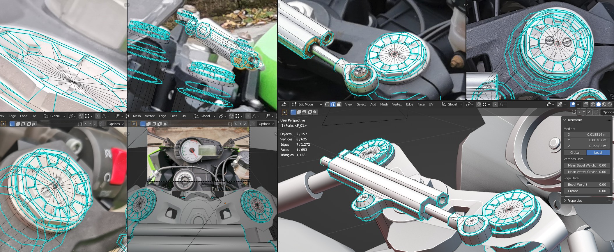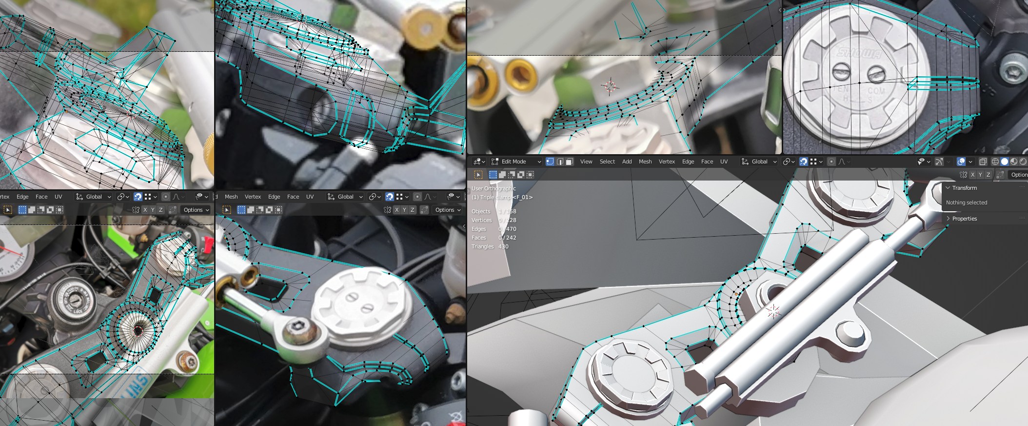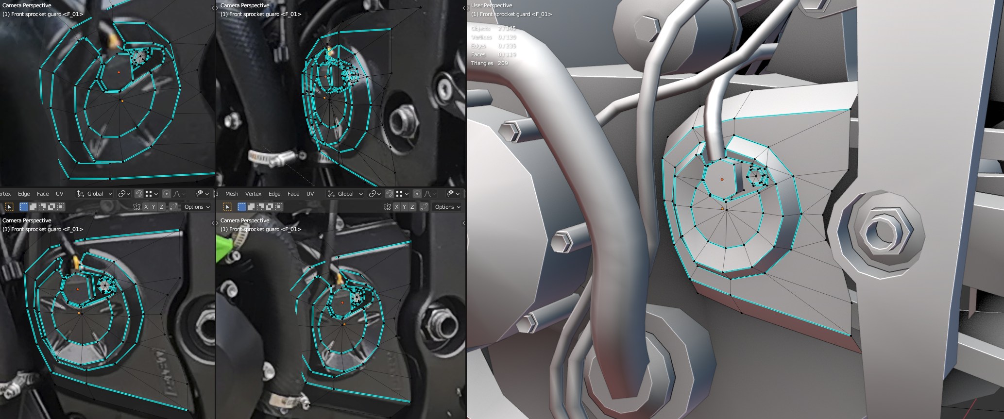 The way i started modeling my bike was that i took a lot of photos from all sides (over 500) and then used a photogrammetry software to make a rought model out of them. Then exported the mesh with cameras into blender.